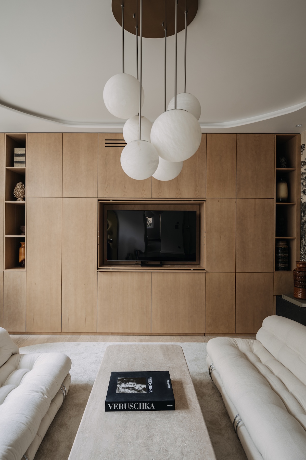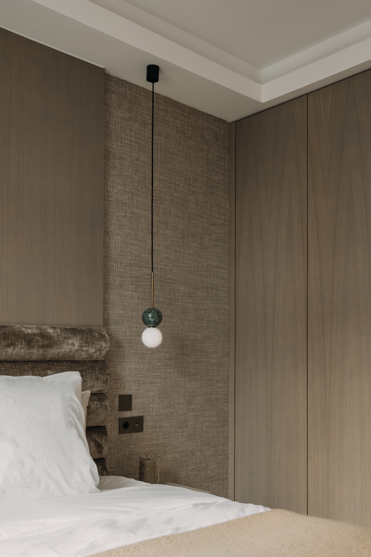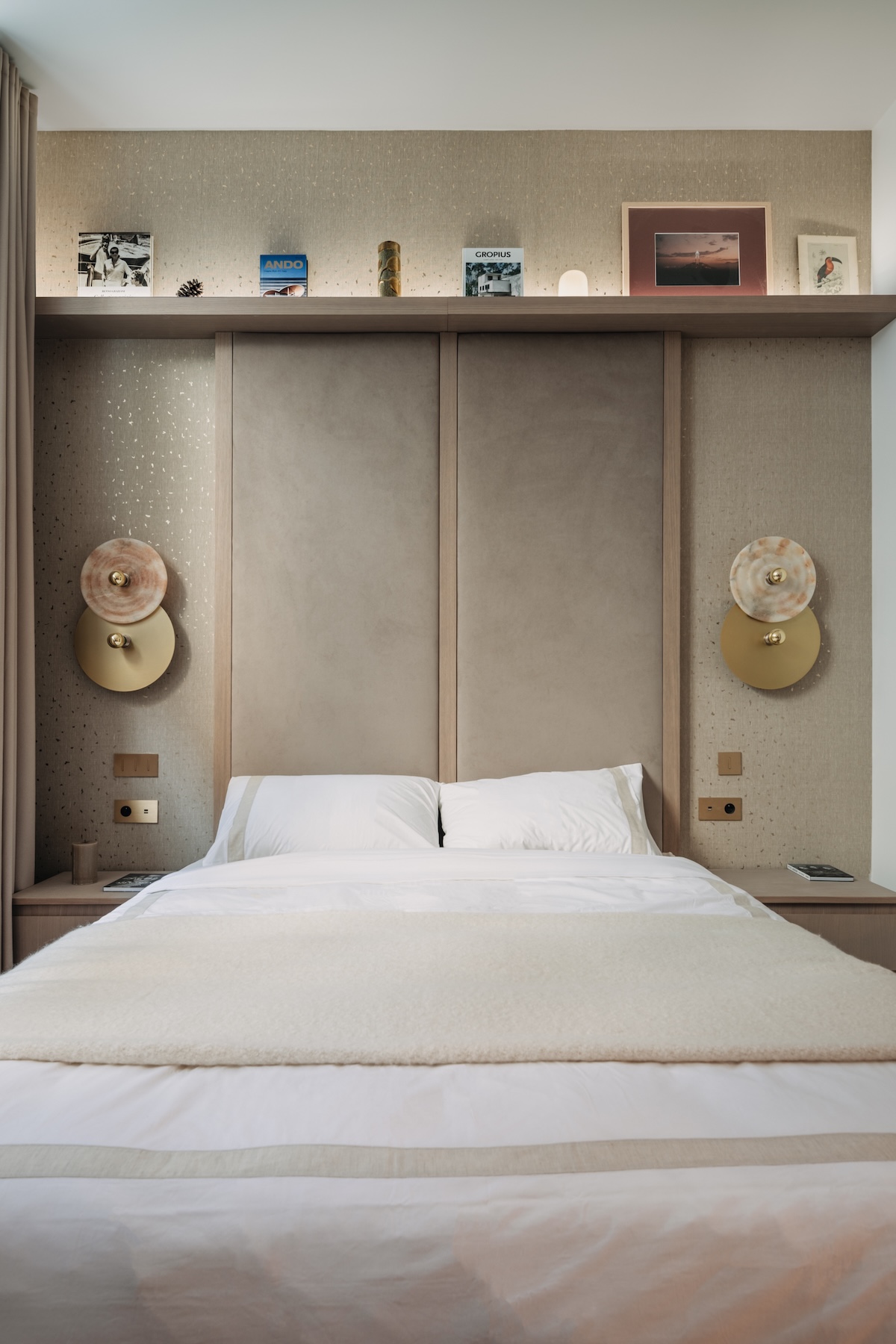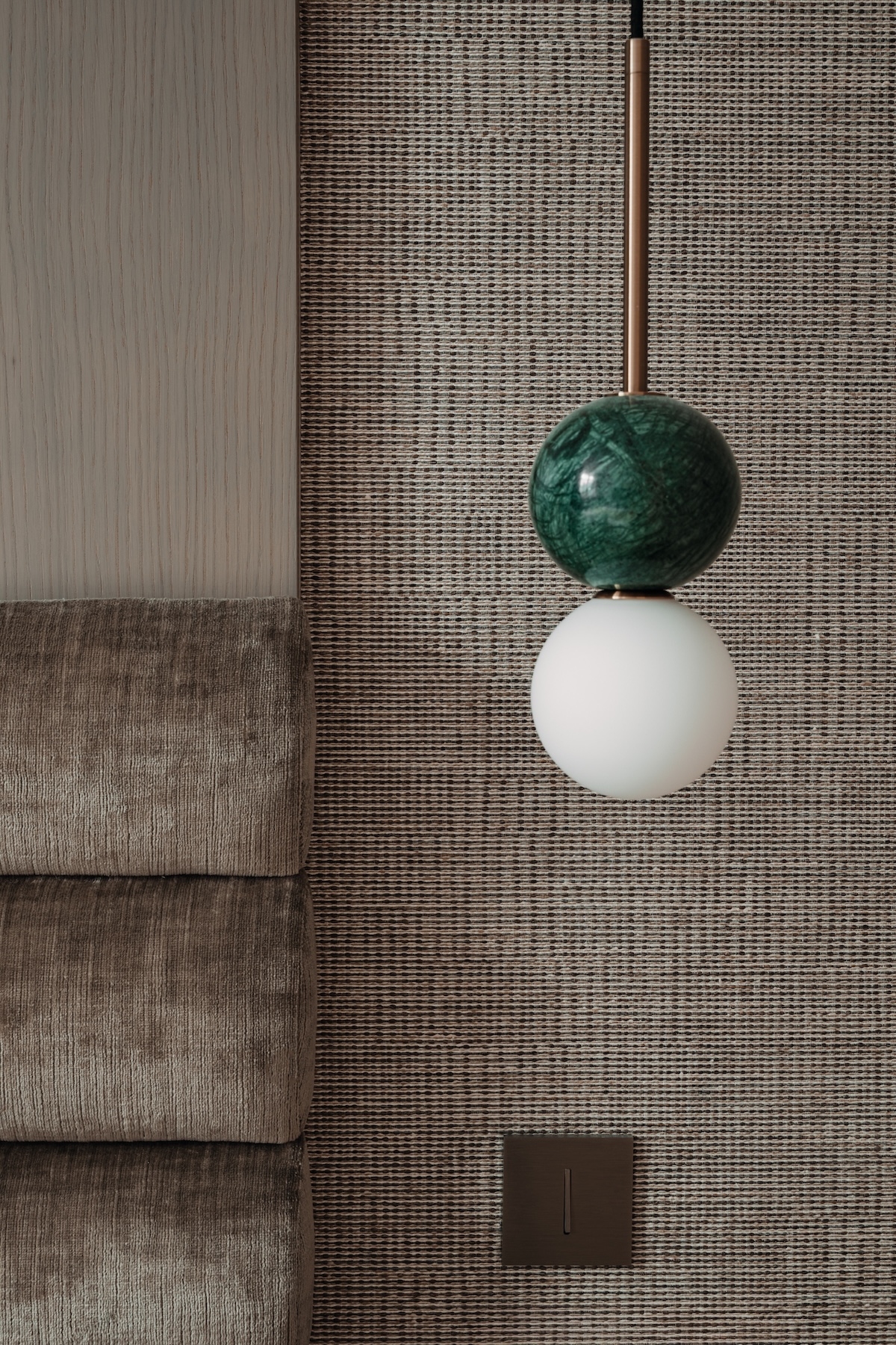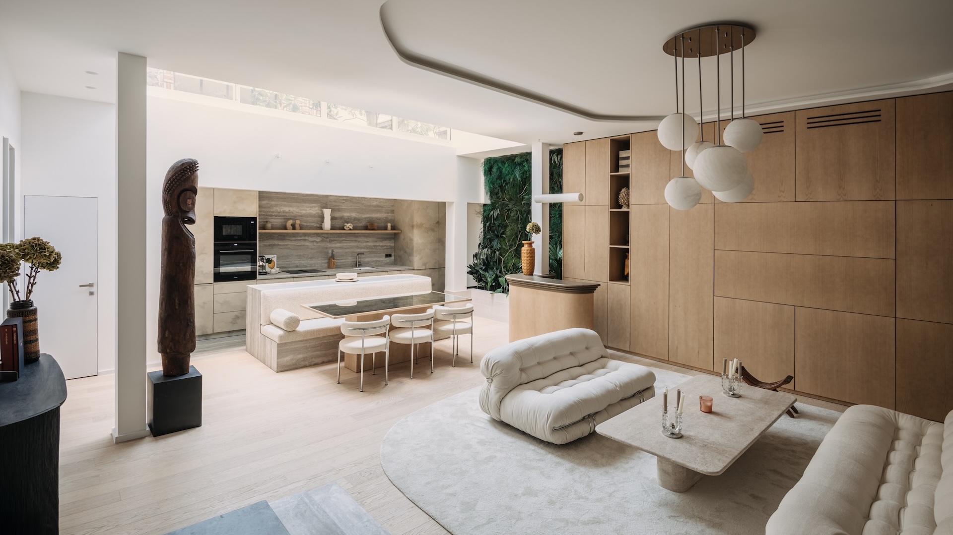 Le duo a également ajouté des objets décoratifs remarquables, soulignant l’exclusivité de l’appartement. Une suspension en albâtre illumine le séjour, tandis qu’un jeu de céramiques est présenté dans des niches délicatement intégrées.