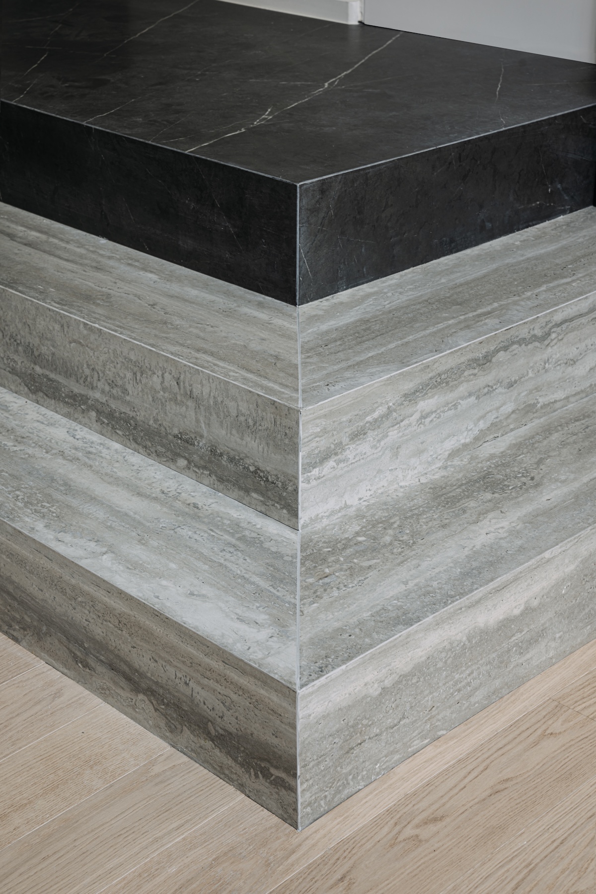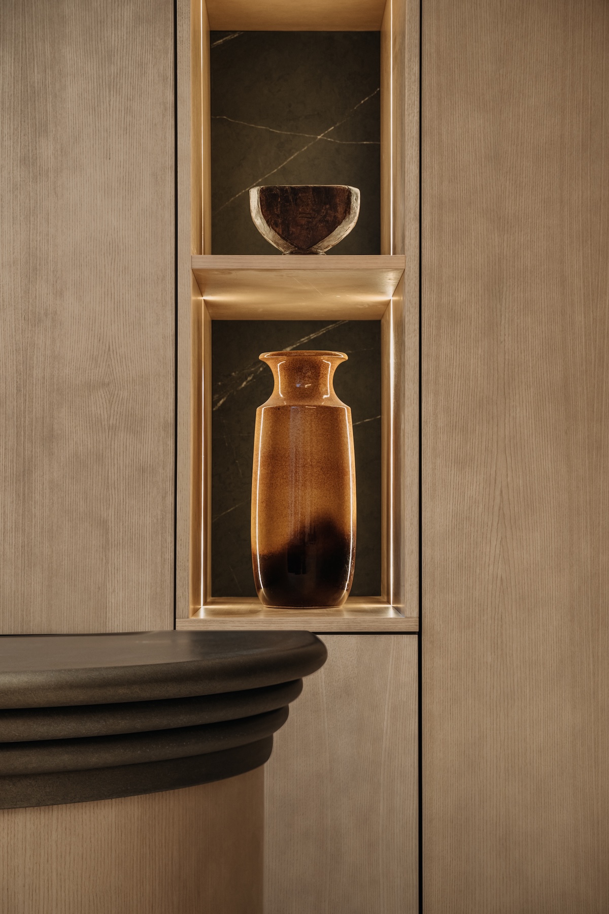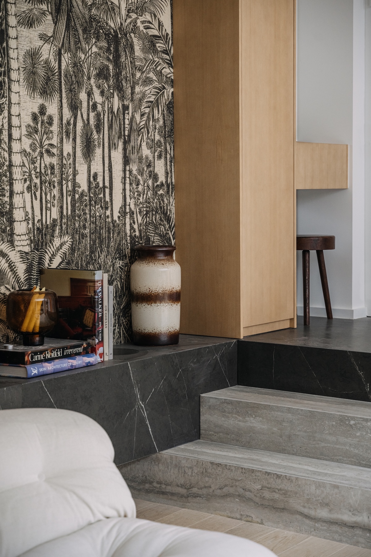 Parallèlement à la réorganisation de l’espace et de sa circulation, MERSI a méticuleusement façonné l’identité de l’appartement, en choisissant des matériaux d’exception, réalisés par des artisans et artistes.