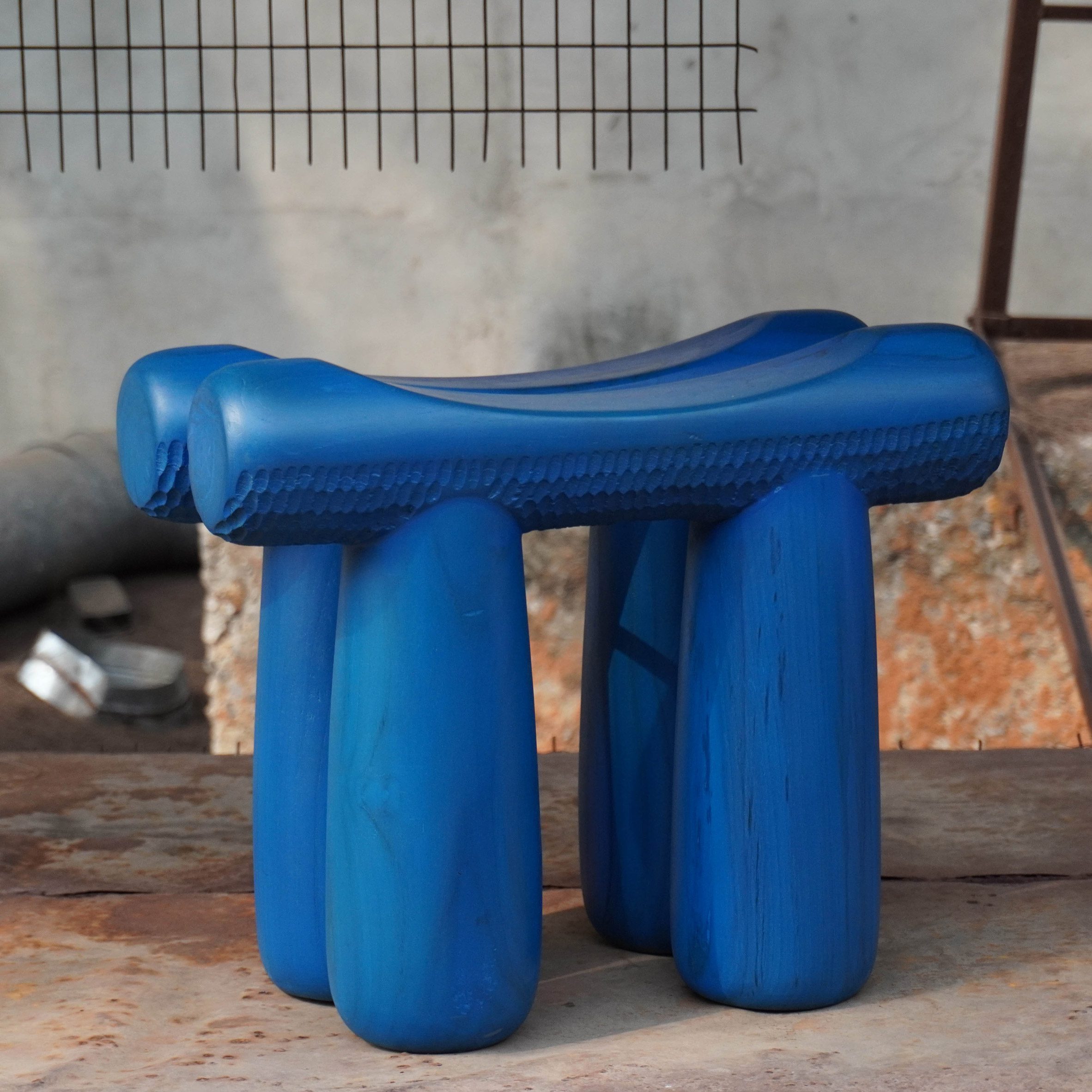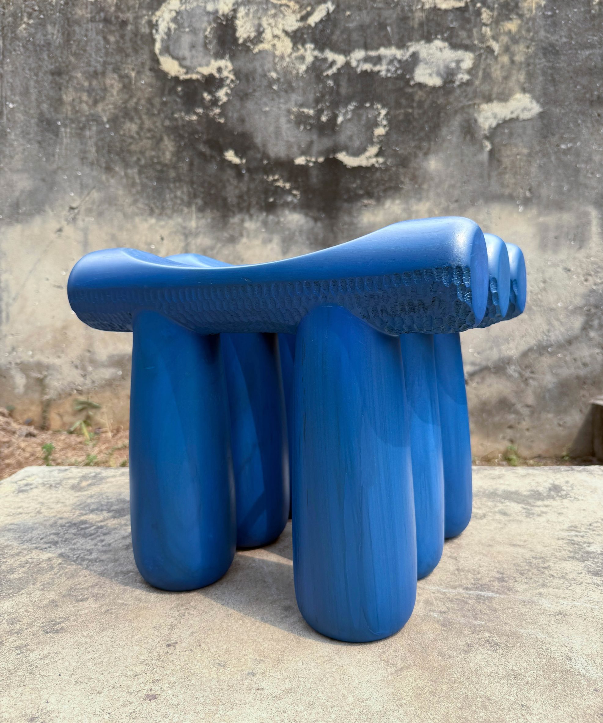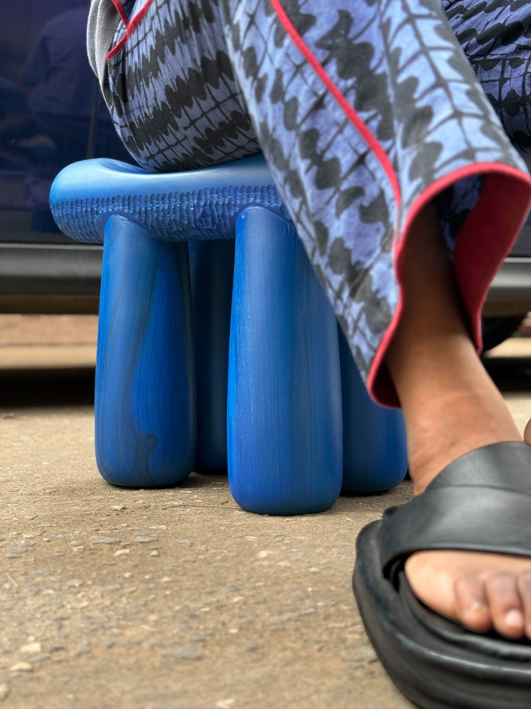Cette pièce évoque la nostalgie : les Africains ou les personnes familiarisées avec la culture africaine se souviennent immédiatement de formes de tabourets similaires sur tout le continent. La teinte bleu vif du tabouret est un clin d’œil à la profonde signification culturelle de l’indigo et au rôle central qu’il a joué dans la production textile ouest-africaine pendant des siècles.