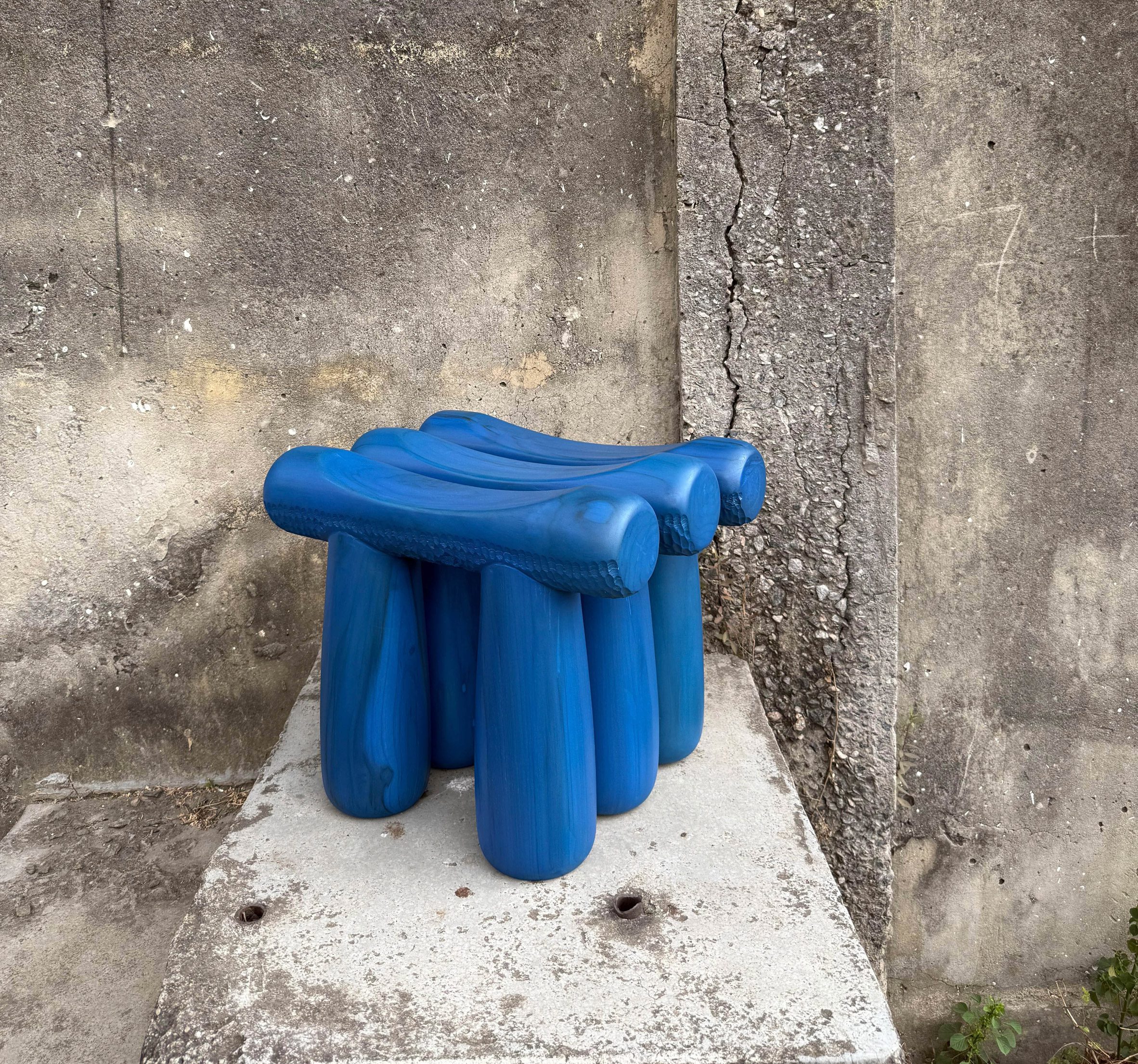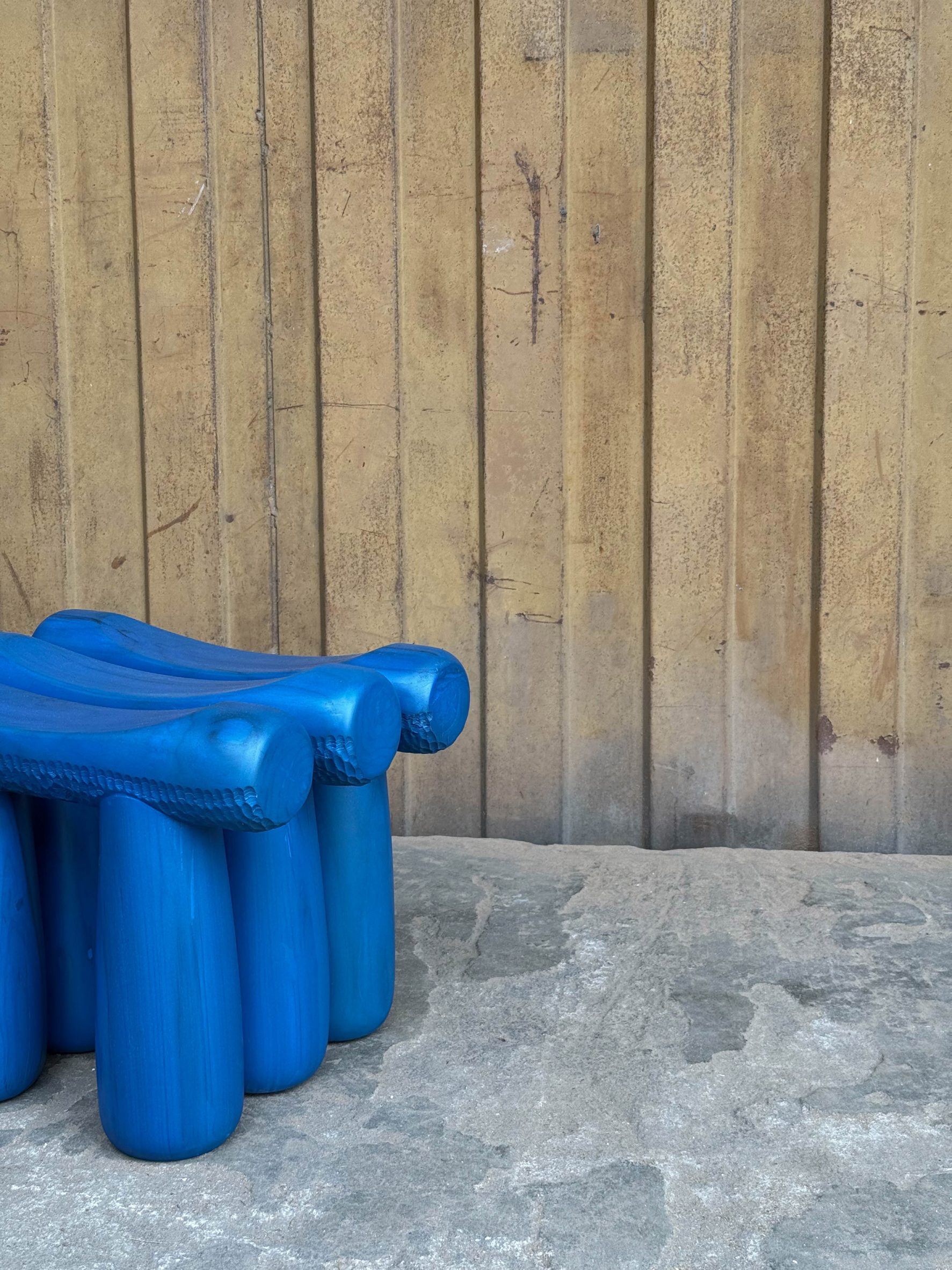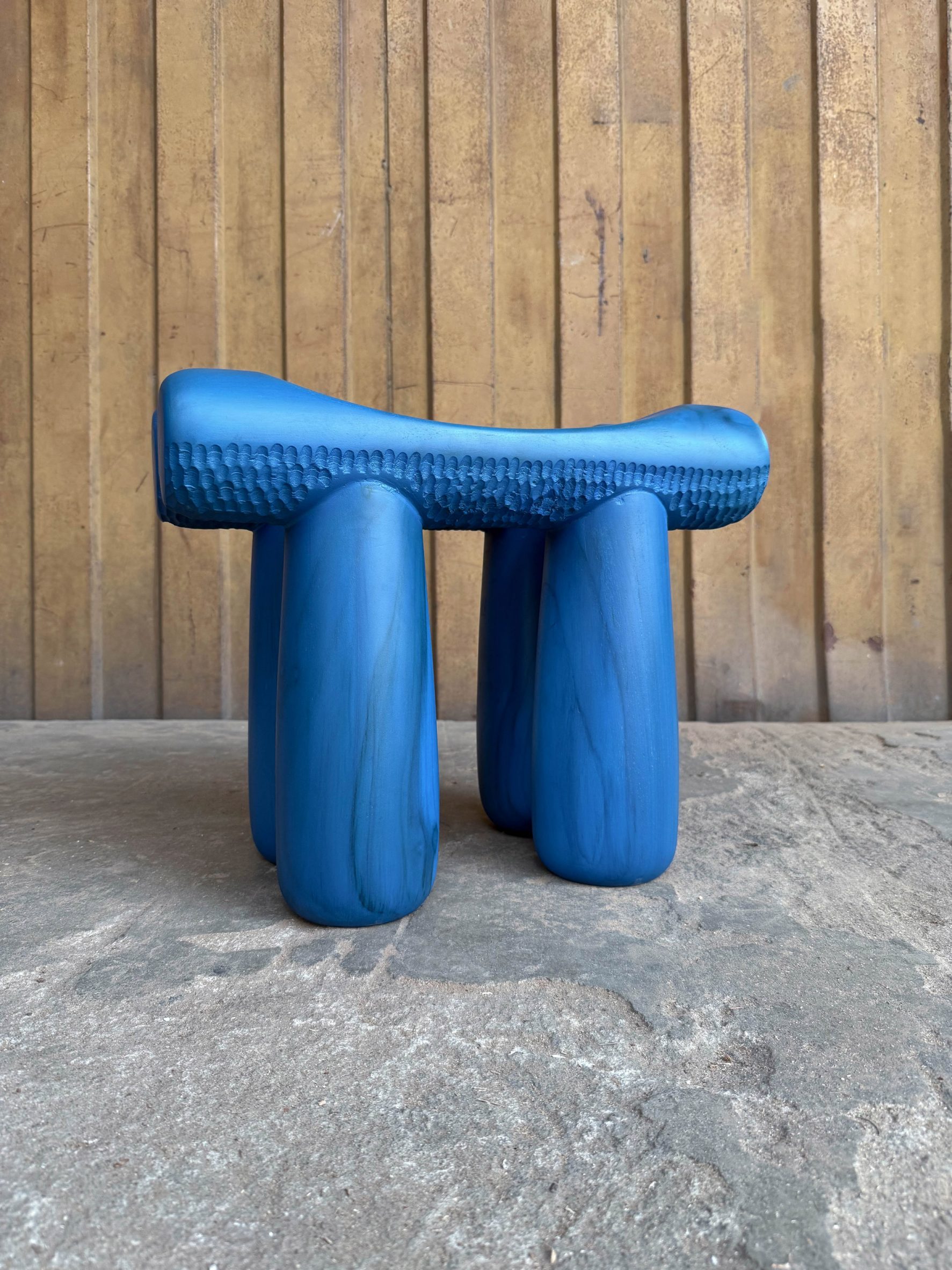 Cette pièce évoque la nostalgie : les Africains ou les personnes familiarisées avec la culture africaine se souviennent immédiatement de formes de tabourets similaires sur tout le continent. La teinte bleu vif du tabouret est un clin d’œil à la profonde signification culturelle de l’indigo et au rôle central qu’il a joué dans la production textile ouest-africaine pendant des siècles.