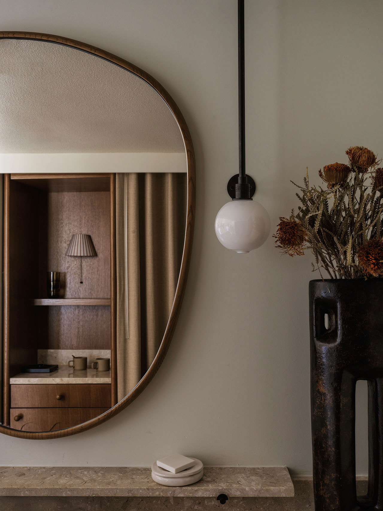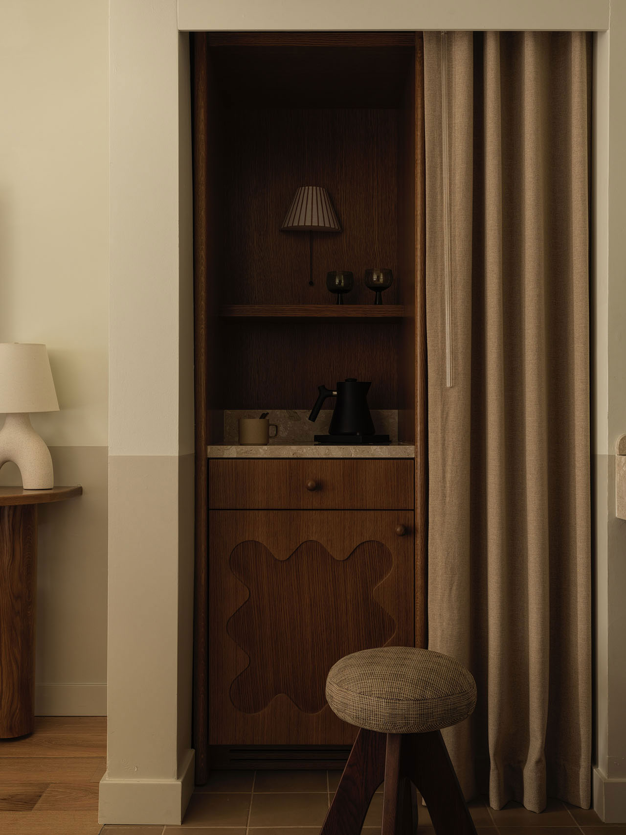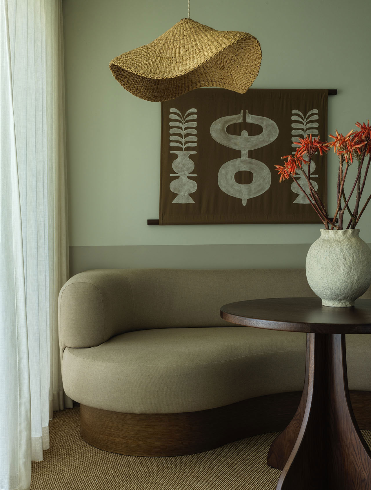 LAND a été sollicité pour faire de l’hôtel une expérience artistique immersive, de la fresque murale du hall aux tapisseries en toile peintes à la main dans certaines chambres. Chaque élément de l’hôtel, y compris le mobilier en bois artisanal et le système audio vintage du hall, s’intègre harmonieusement à l’espace et à son environnement, tout en restant précis dans son agencement et son design.
