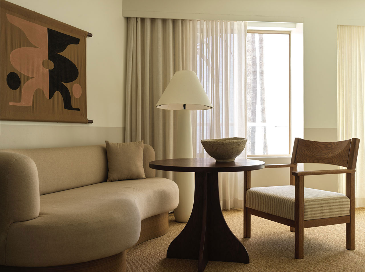 Des arcades laissent place à des recoins intimes propices au repos, ornés d’une sélection rigoureuse de sculptures en céramique et d’œuvres d’art chinées. Des références au Mexique et à la Méditerranée sont omniprésentes, y compris dans la carte de cocktails soigneusement élaborée. Juste en contrebas de l’hôtel, Main Beach, l’une des étendues les plus prisées du littoral californien, est meublée de chaises longues Sloth Beach Chairs du studio de design new-yorkais MAX ID.