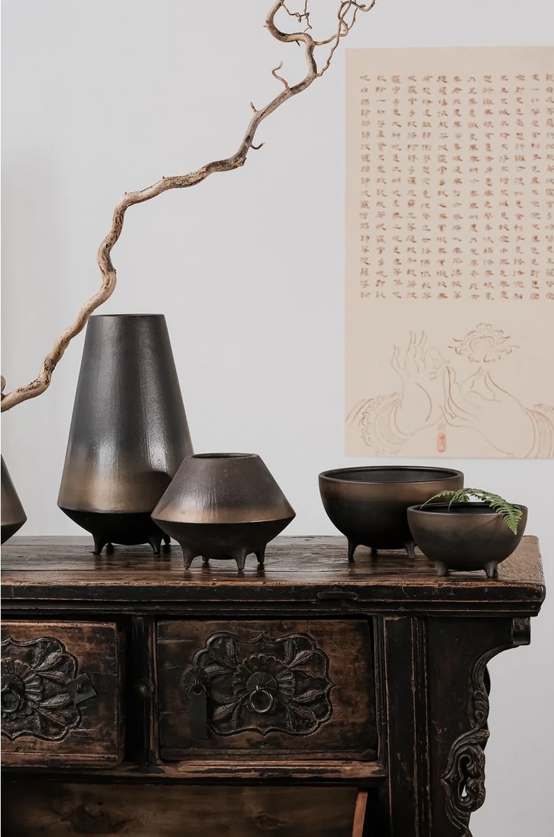 Leur collection phare, signée SUNS Design, célèbre une esthétique de la forme pure, inspirée par l’artisanat ancestral chinois, mais transposée dans une modernité radicale. Les textures vibrantes—céramiques noires virant au bronze, verres soufflés aux courbes sensuelles—créent une tension poétique entre brutalité et raffinement. Ces pièces, aux proportions savamment étudiées, s’imposent dans l’espace avec une élégance architecturale. Un manifeste du « New Modern » asiatique, qui réinvente l’objet décoratif en objet d’émotion.