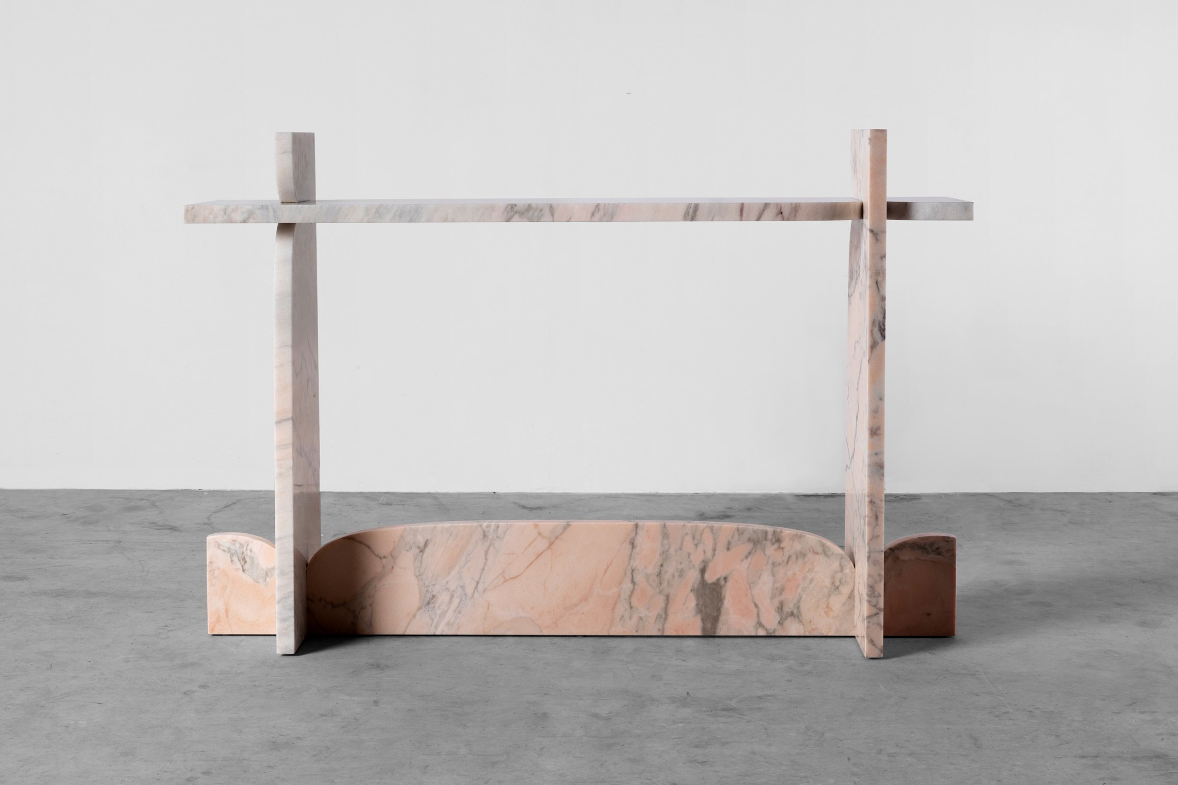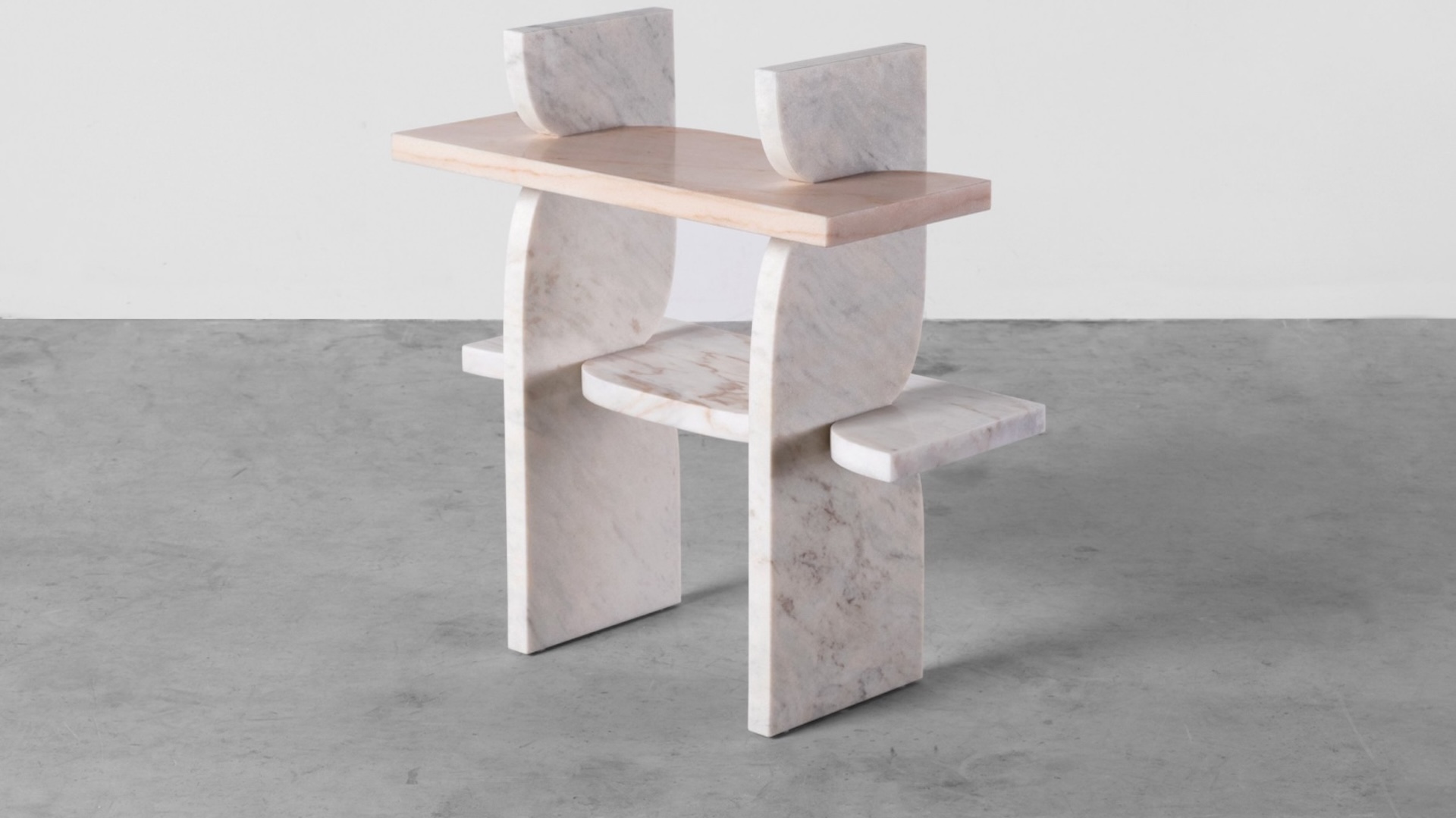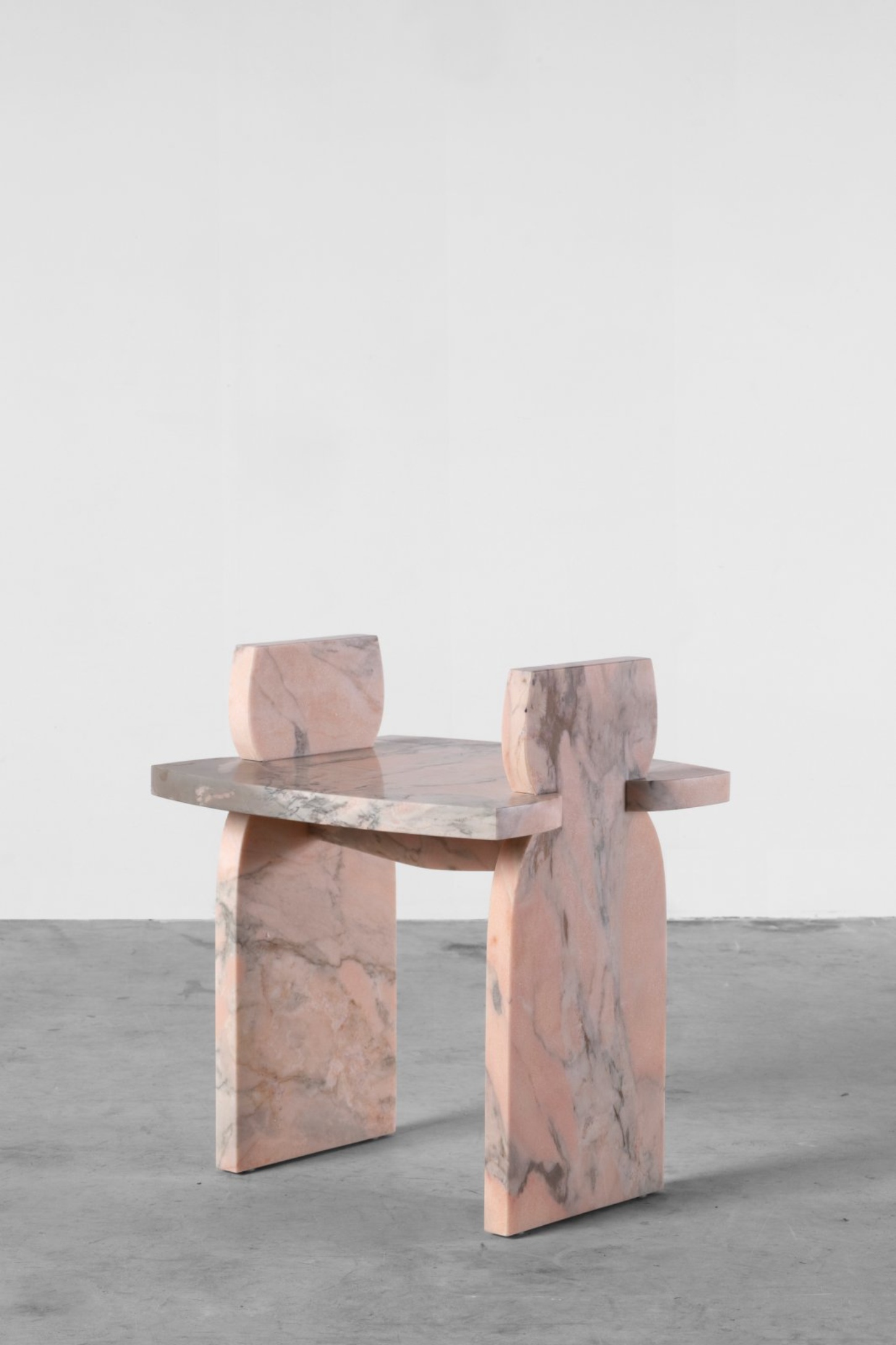 Le marbre Rosso Aurora recyclé, veiné de rose et de blanc, évoque des formations anciennes, aujourd’hui transformées en objets qui brouillent la frontière entre sculpture et fonction. Les formes emblématiques de Tyakina restent familières, mais dans la pierre, elles se transforment : non plus éphémères, mais ancrées dans la permanence.