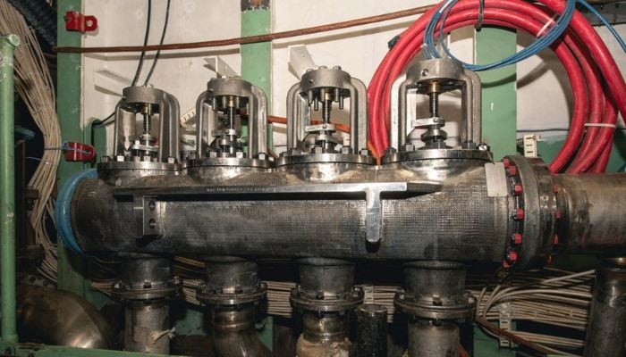L’assemblage du collecteur de vannes dans la salle des pompes du porte-avions de classe Gerald R. Ford Enterprise (CVN 80) (crédits photo : DM3D)
