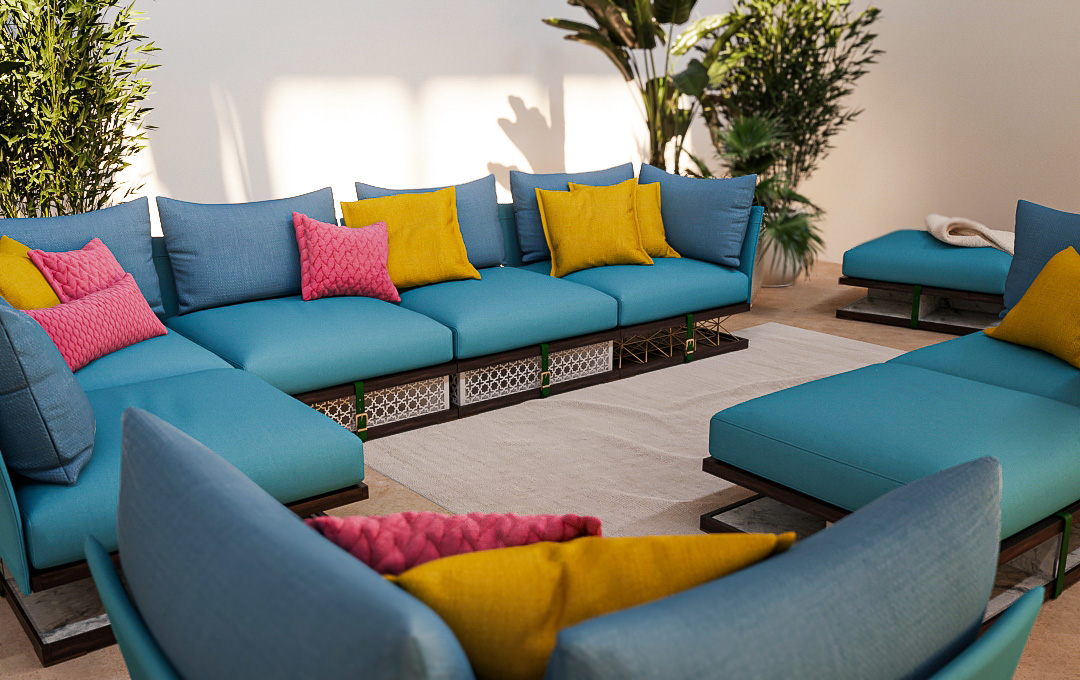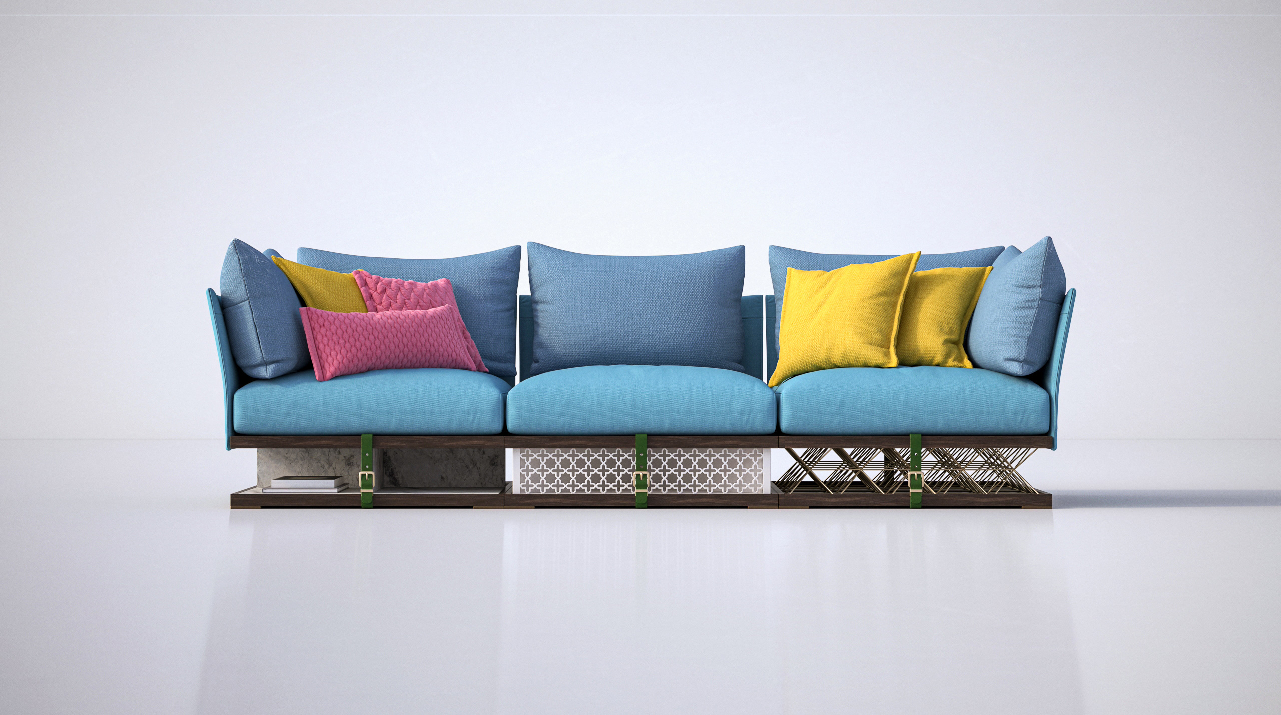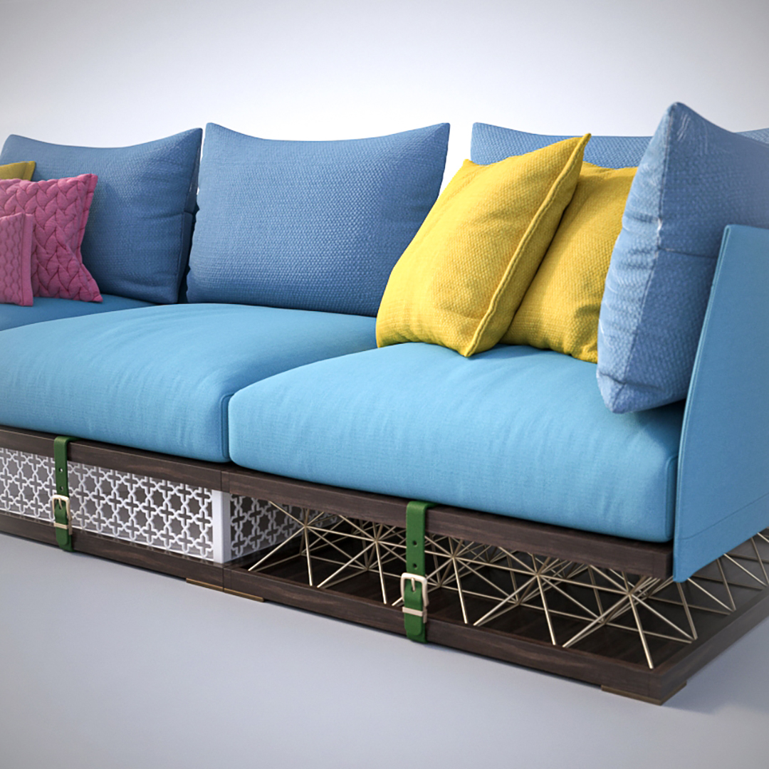 Younes Duret a particulièrement veillé à associer confort et praticité dans le design d’« Aji n’safrou ». Fidèle à sa démarche créative, le designer intègre des espaces de rangement subtilement dissimulés dans la structure du canapé, rappelant ainsi l’usage initial des malles nomades. Cette fonctionnalité renforce le caractère polyvalent du meuble tout en offrant une esthétique harmonieuse et épurée.