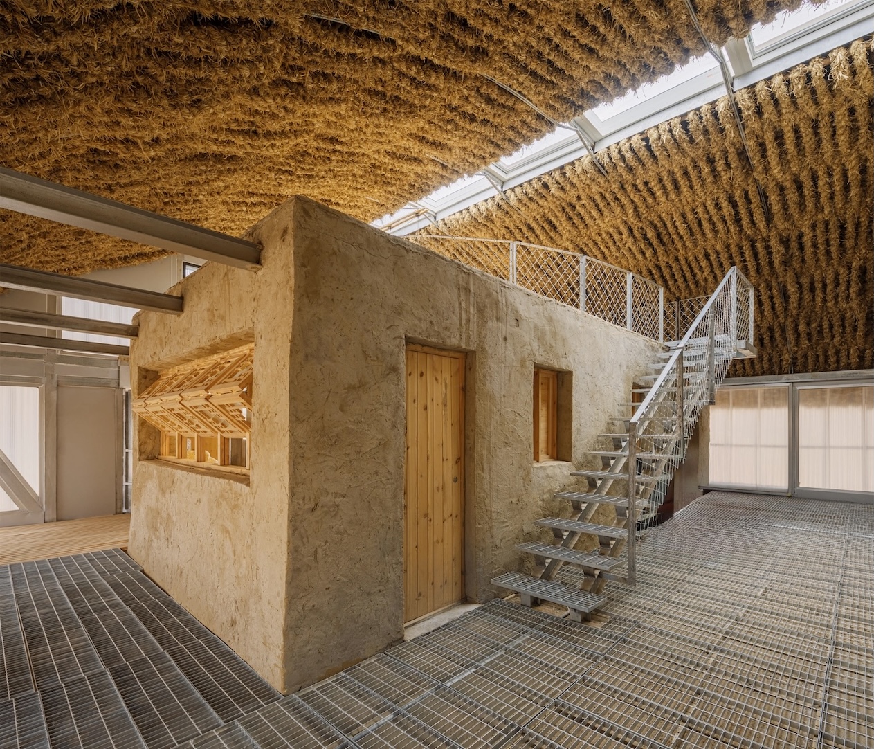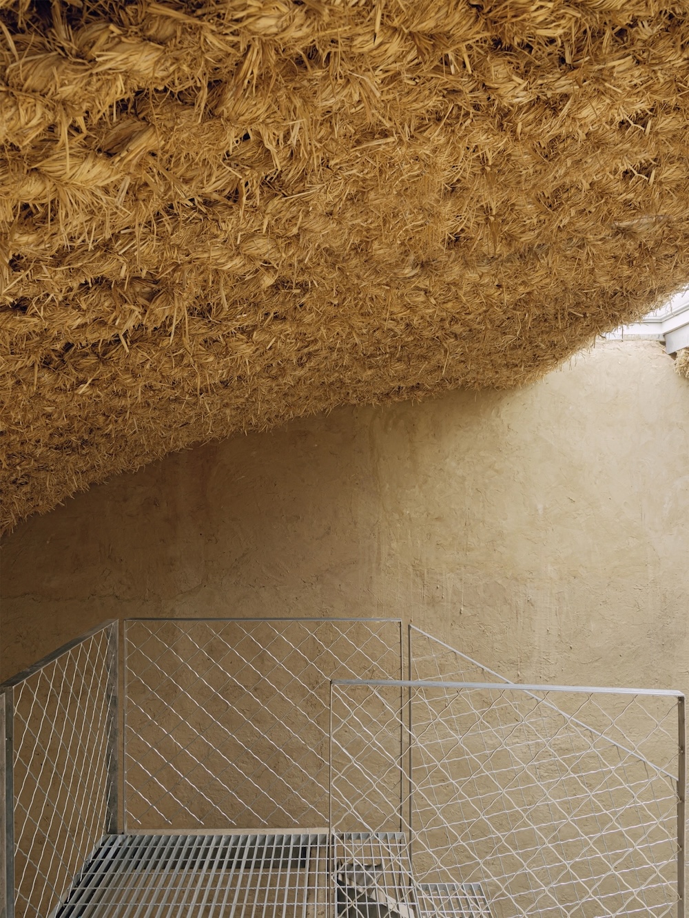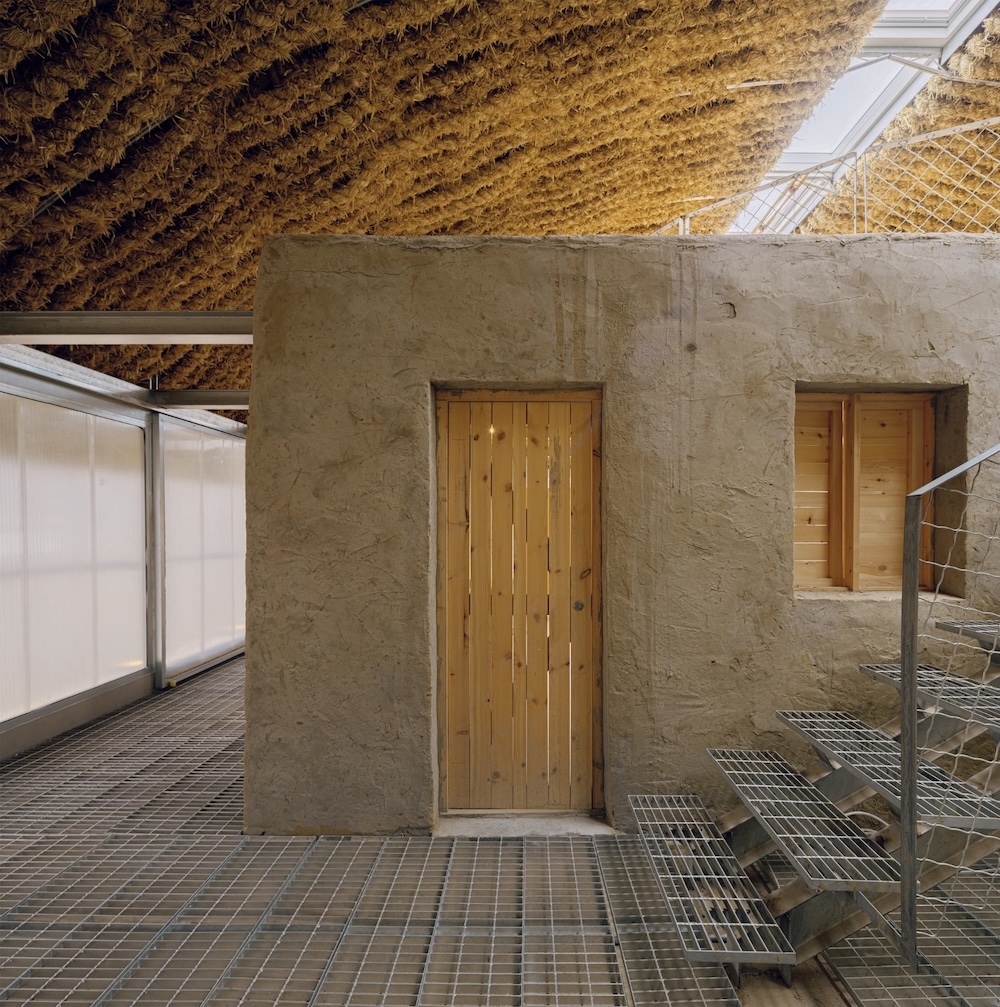 La maison adopte une stratégie bi-matériaux : des briques de paille, une méthode de construction ancestrale, inhérente à l’architecture locale, et une enveloppe métallique légère, gage d’adaptabilité moderne.
