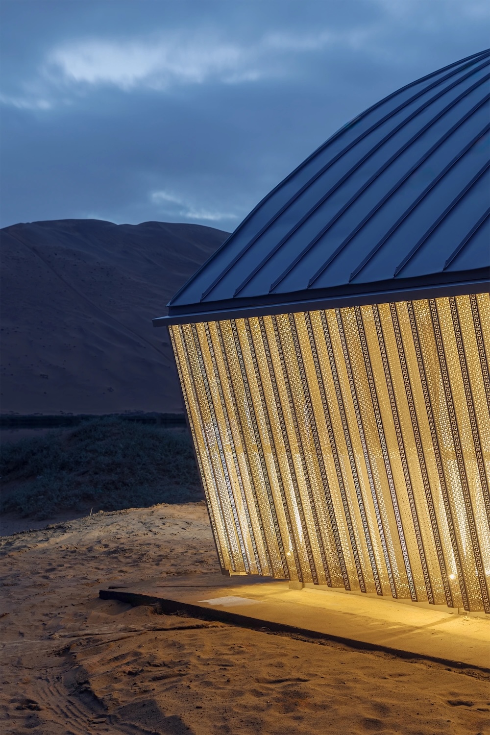La nuit, éclairée par une douce lumière intérieure, la maison scintille telle une relique argentée du passé et de l’avenir du désert.