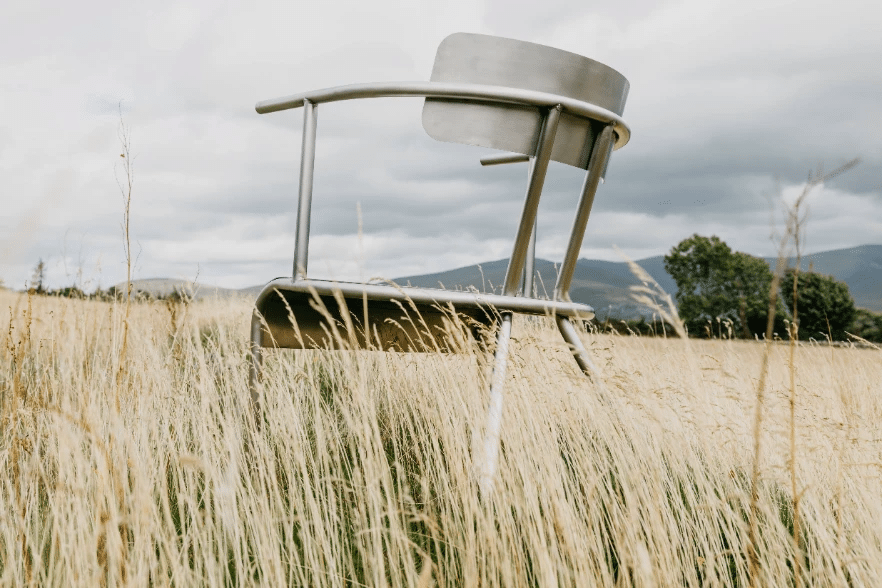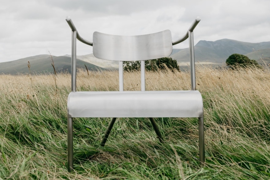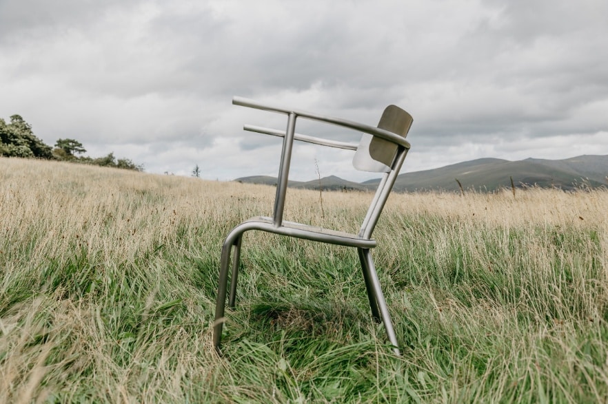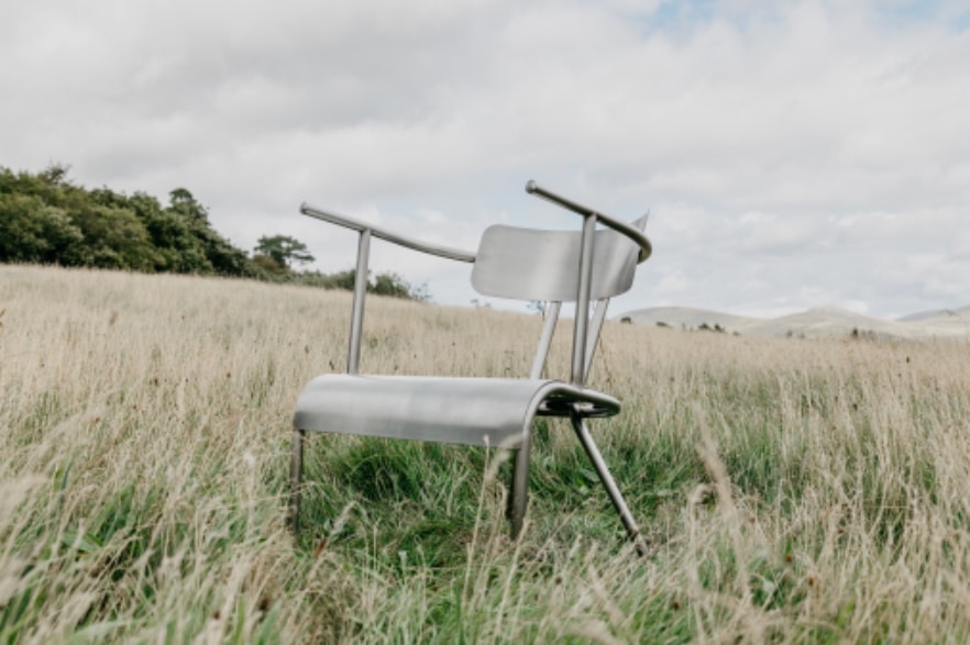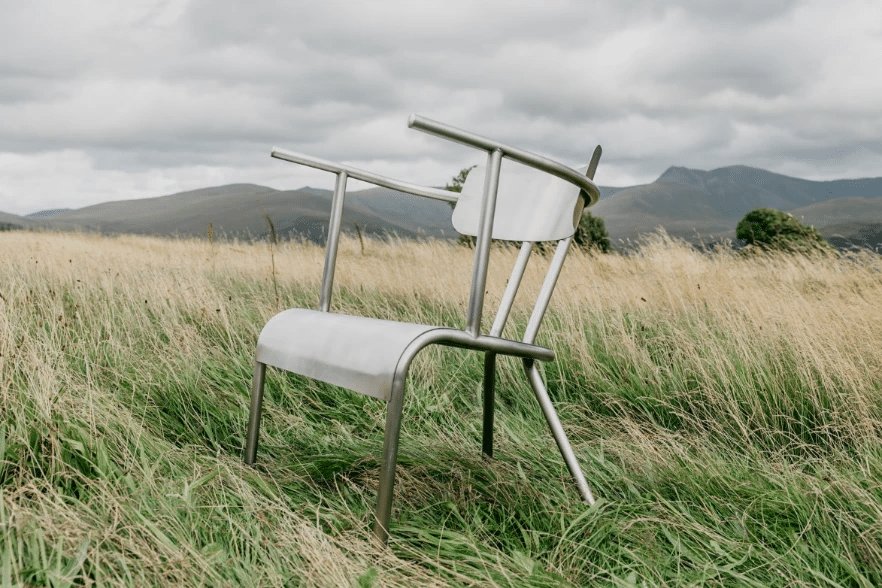 Traditionnellement fabriquées en bois, les chaises galloises ont été pensées ici en métal. Ce choix de matériau, influencé par l’expérience du designer avec le métal en feuille chez Studio Phil Procter, confère à la chaise une esthétique brut (de décoffrage) tout en améliorant sa durabilité et sa longévité. L’utilisation de l’acier inoxydable, en particulier, ajoute une touche contemporaine tout en garantissant une résistance accrue.
