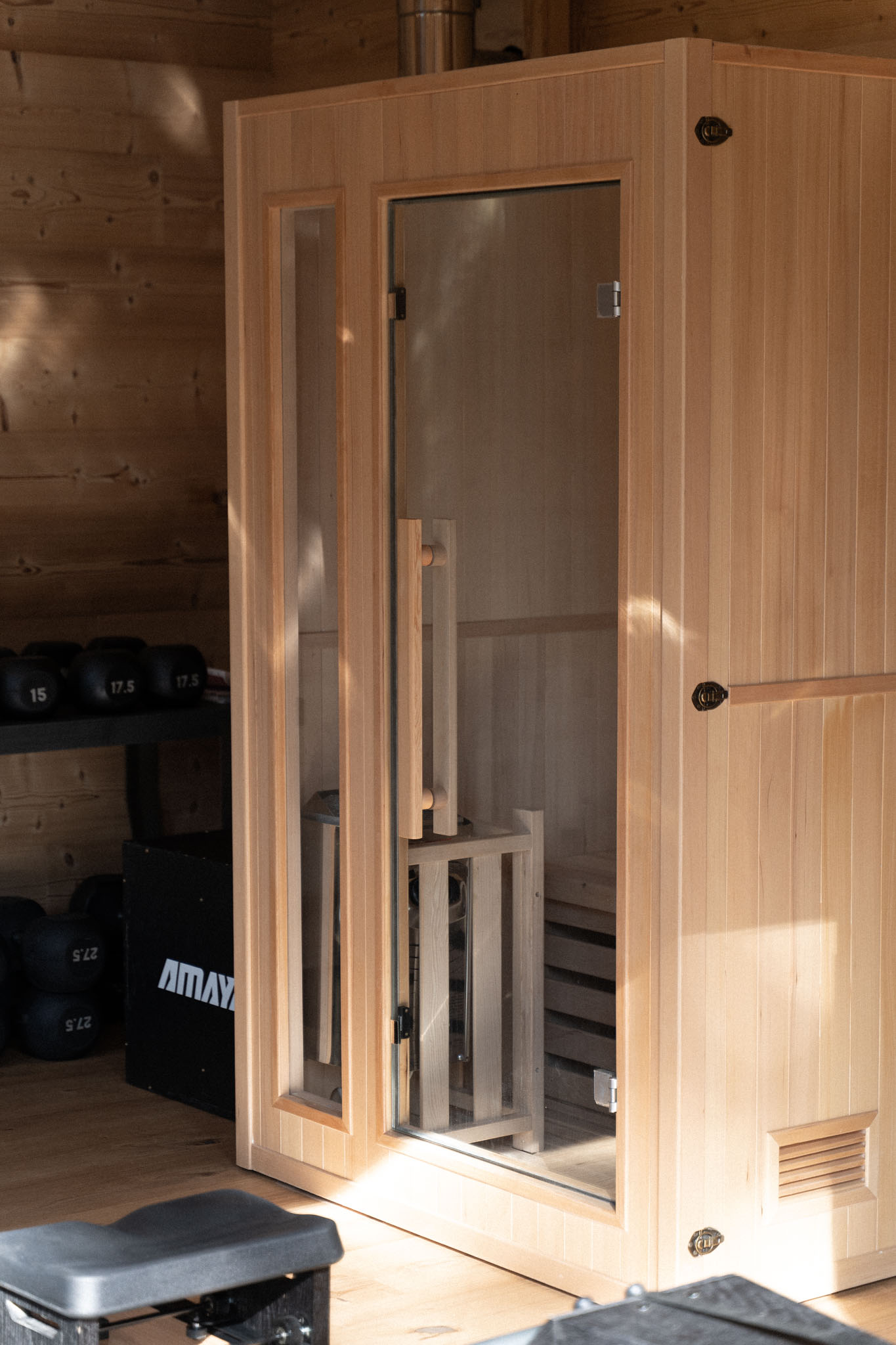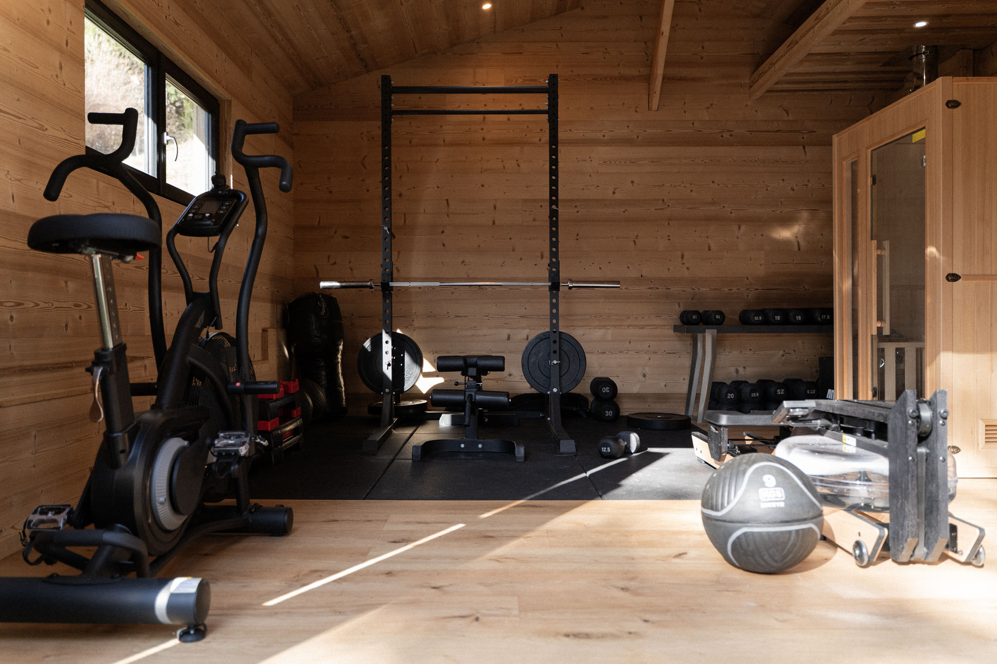 Aménagement d’une salle de sport en bardage, d’un bain nordique et d’une terrasse.