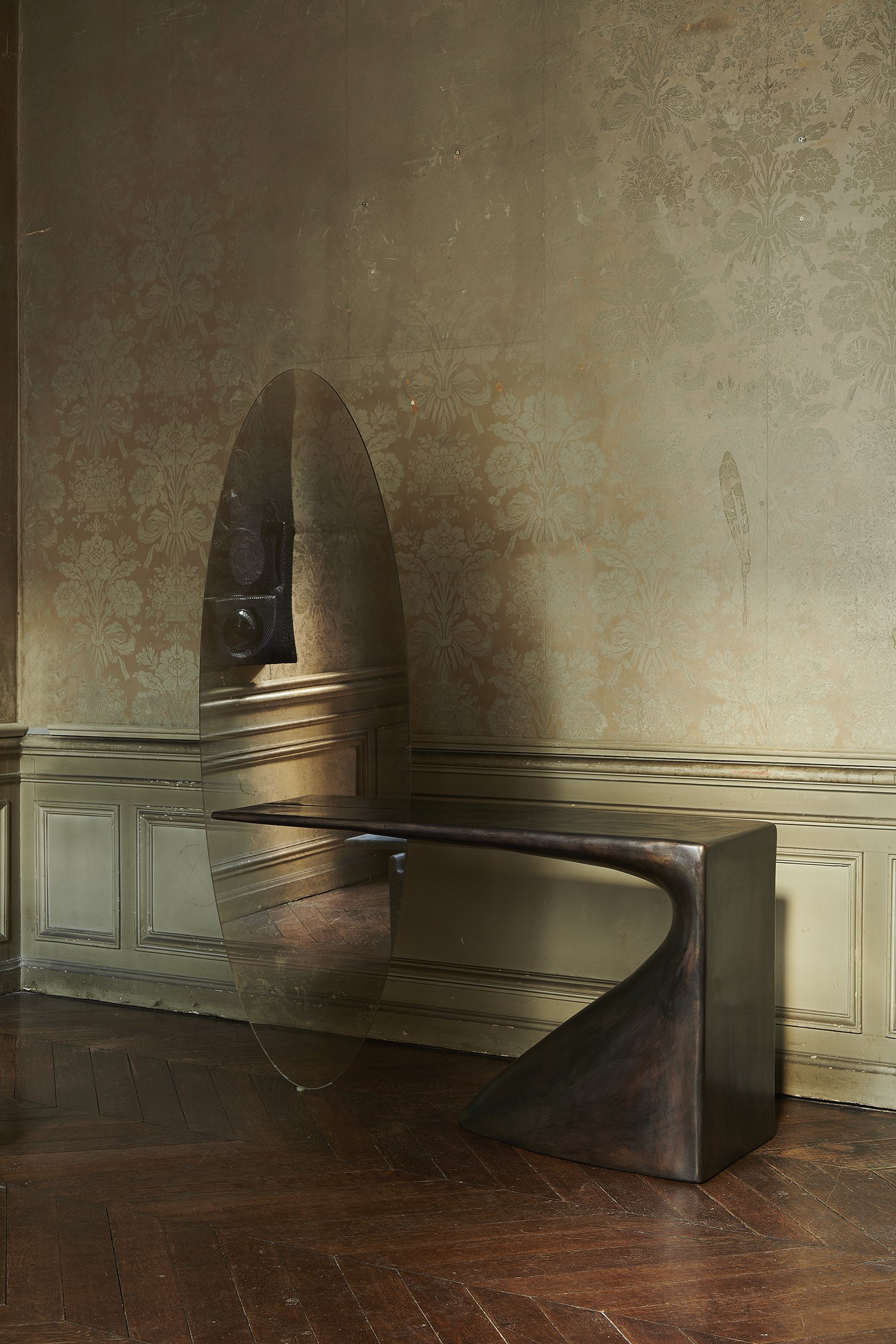 Les luminaires de Senteski sont tout aussi imposants que ses miroirs. Ses imposantes sculptures-lampes en bronze sont de véritables monuments lumineux dédiés à l’artisanat et à l’innovation industrielle. Ces créations illuminent non seulement les espaces, mais servent également de points de mire architecturaux, évoquant à la fois le poids de l’histoire et les promesses du futur.