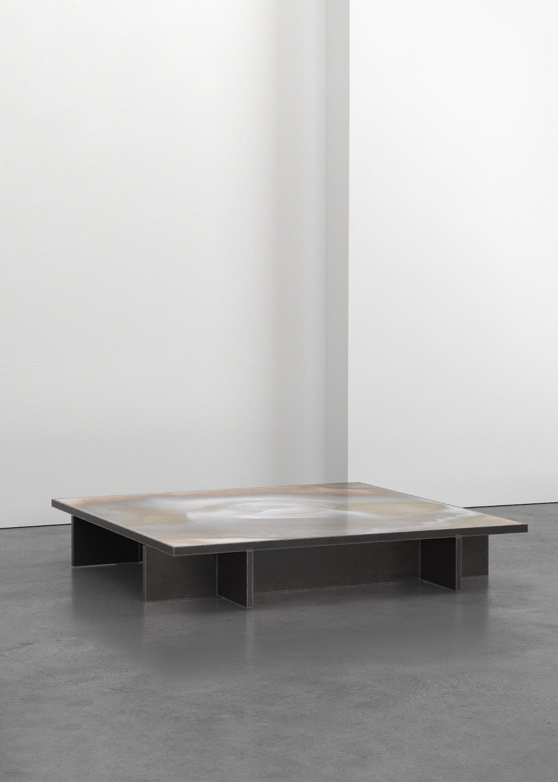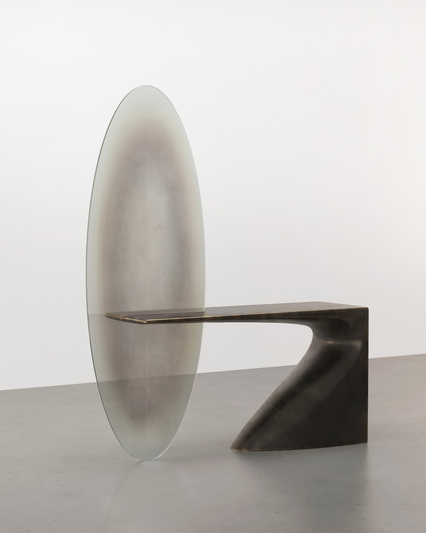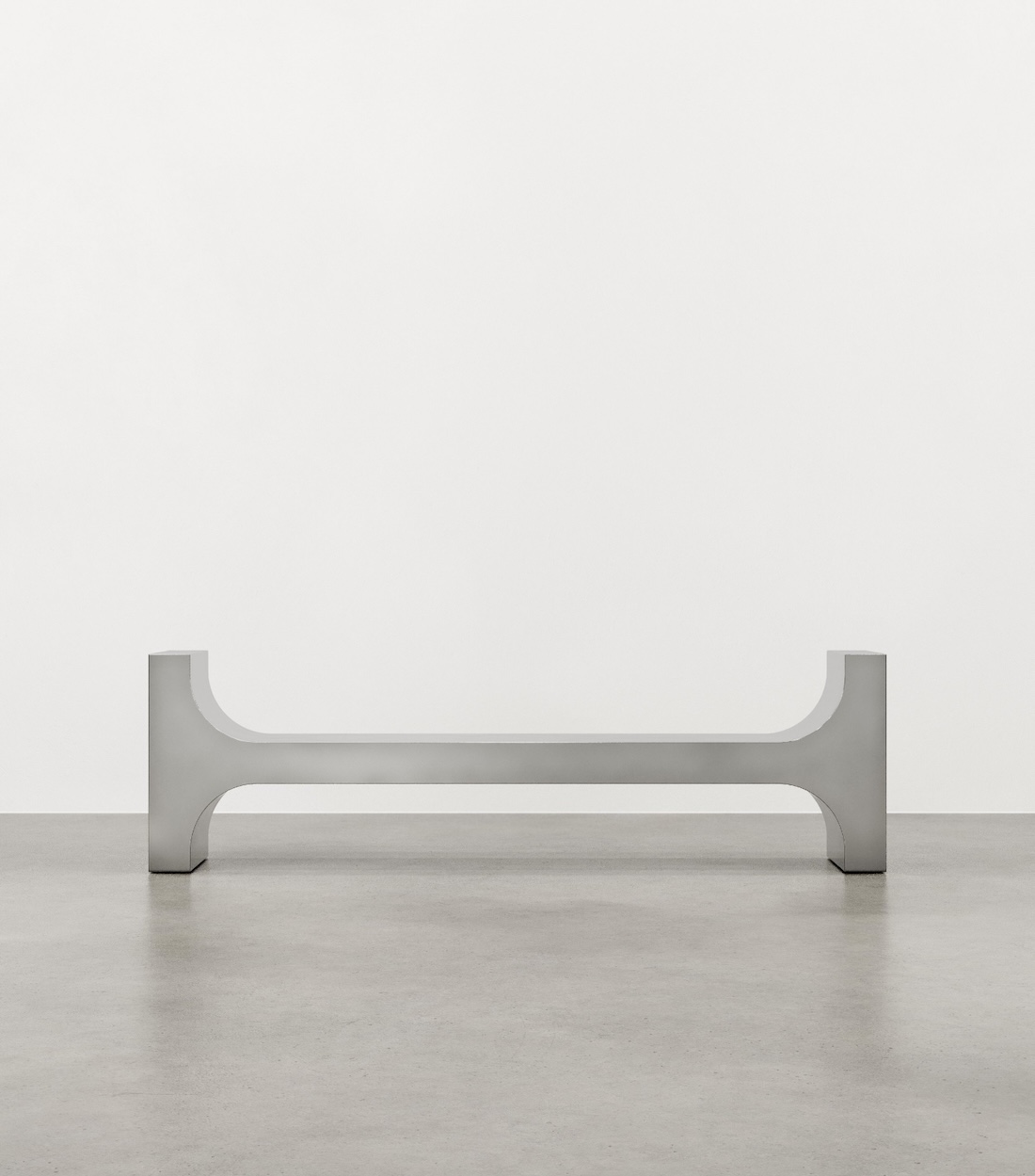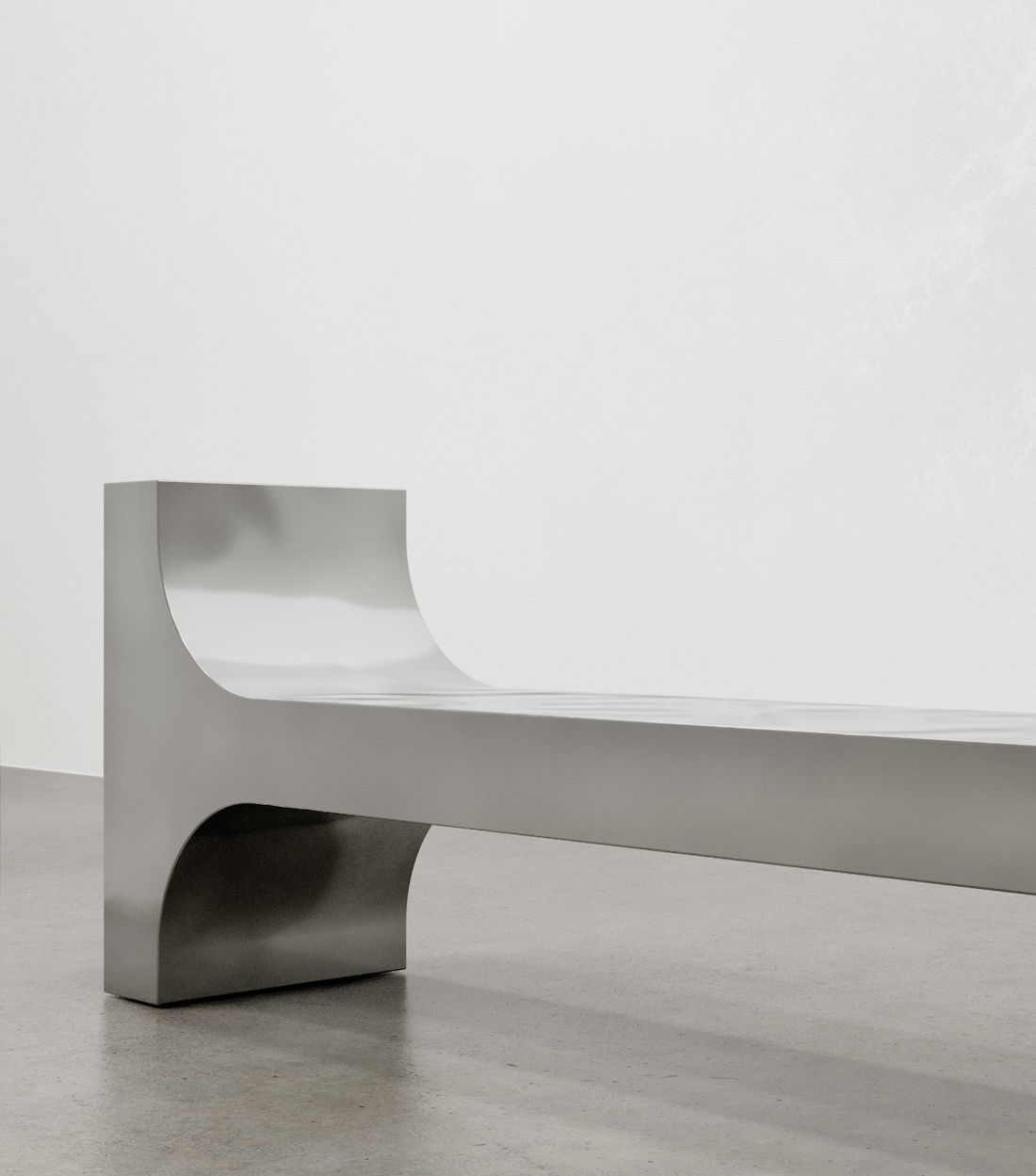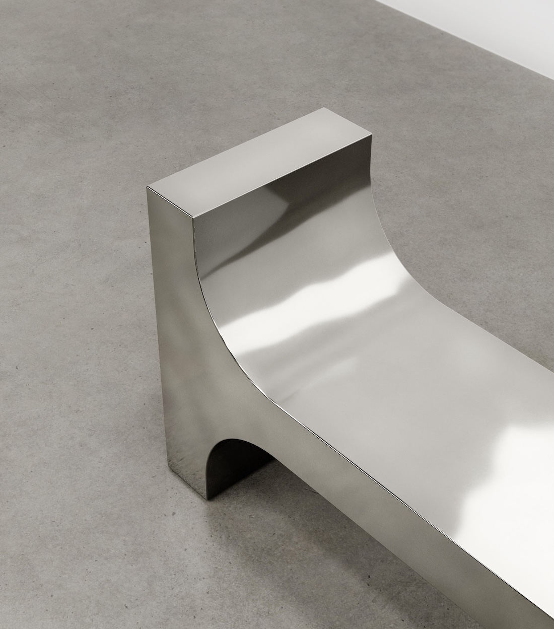 Ses meubles, notamment ses bancs en acier inoxydable poli, poursuivent son exploration de la matérialité. Ces pièces, à la fois épurées et organiques, illustrent sa capacité à insuffler chaleur et intimité aux éléments industriels. Leurs surfaces hautement réfléchissantes interagissent avec leur environnement, renforçant la fascination de Senteski pour la perception et la transformation.