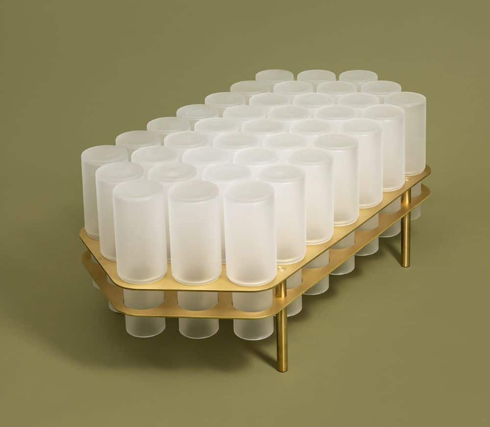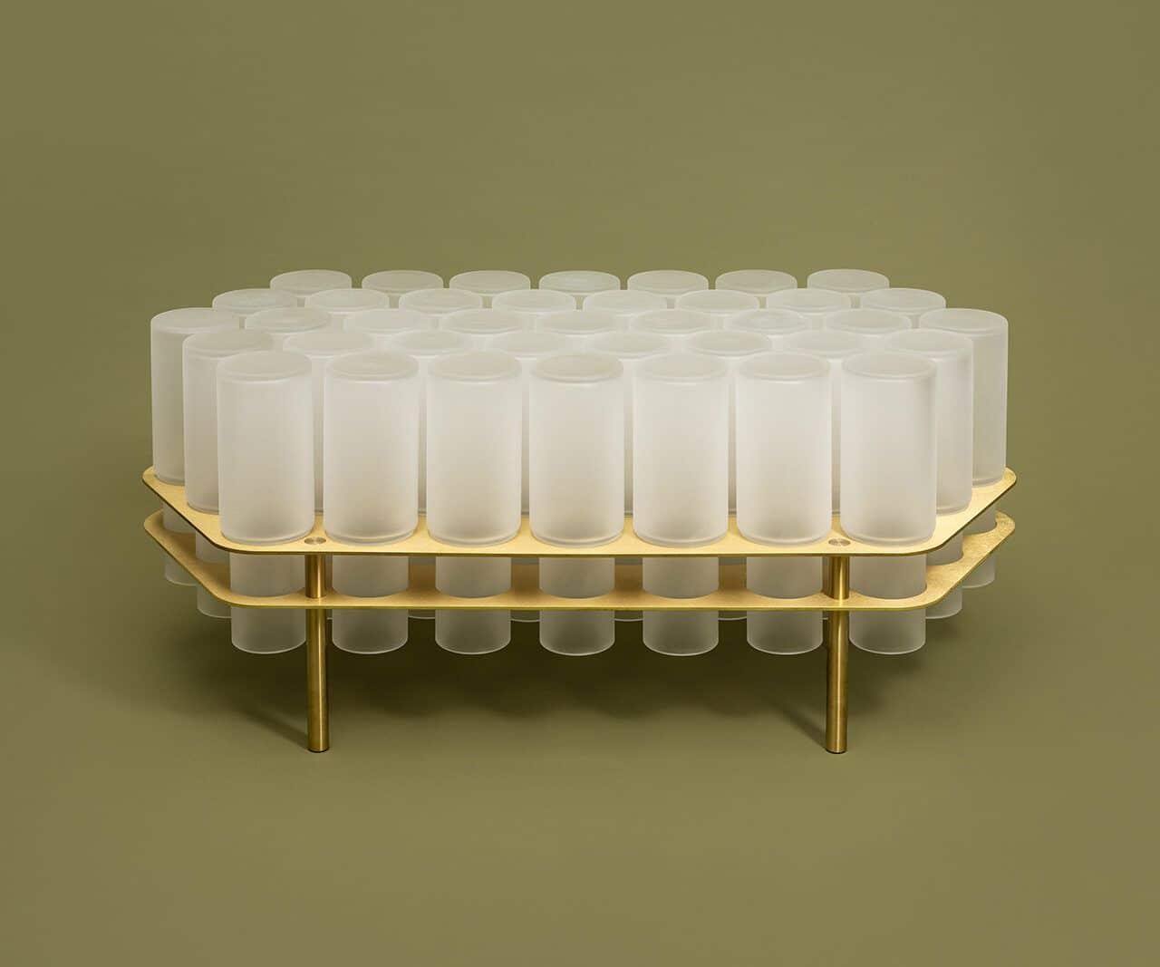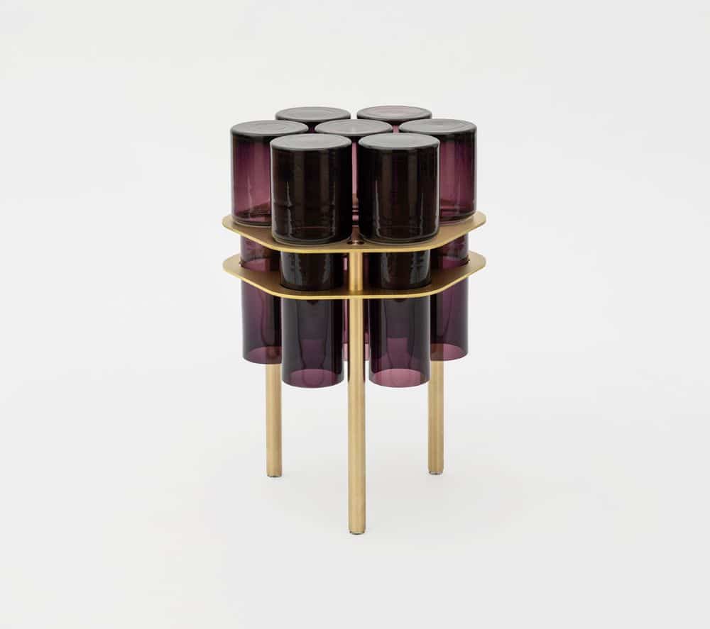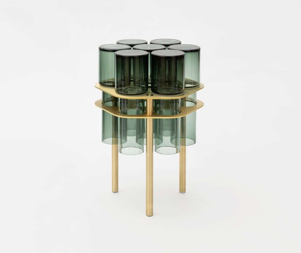 La collection Field propose des tables géométriques alliant verre soufflé et laiton. Les tables célèbrent les liens entre les matériaux qui s’emboîtent et s’agencent entre eux. Des groupes d’éléments en verre, rappelant la forme très familière des bouteilles, sont suspendus dans un double panneau de laiton. Le tout est supporté par trois pieds, en laiton eux aussi. La marque SkLO, avec cette série Field, joue sur la répétition des modules en verre, pour créer différents formats de tables. L’accumulation des éléments en verre offre une infinité de possibilités au niveau des formes et de la grandeur de ces tables.