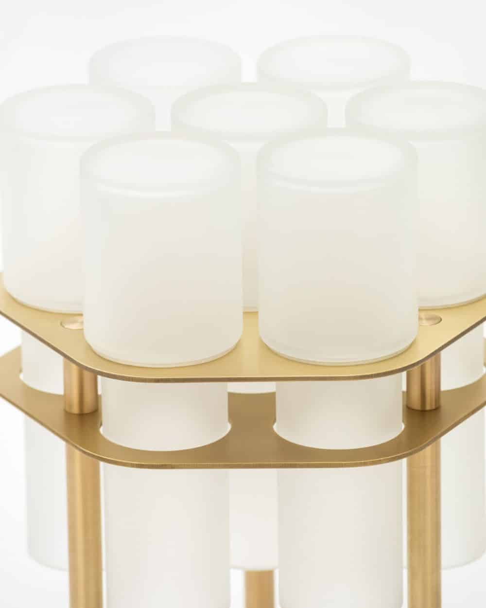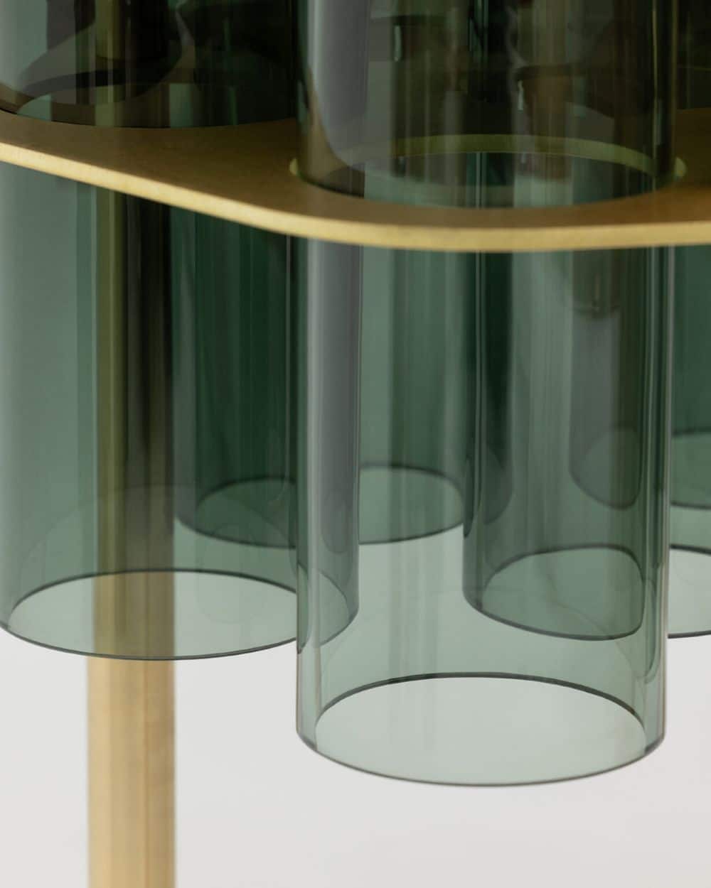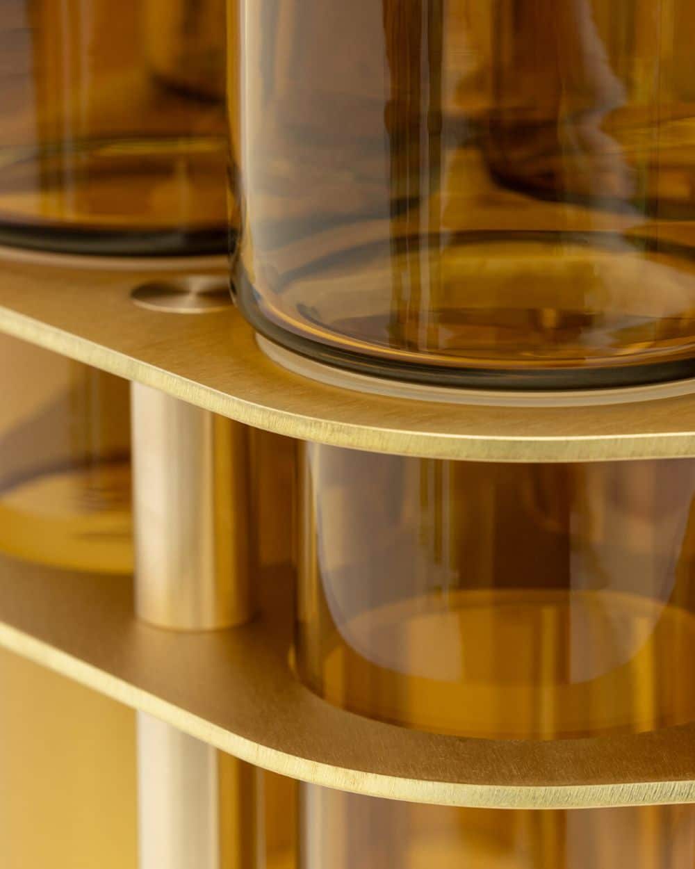 La collection Field propose des tables géométriques alliant verre soufflé et laiton. Les tables célèbrent les liens entre les matériaux qui s’emboîtent et s’agencent entre eux. Des groupes d’éléments en verre, rappelant la forme très familière des bouteilles, sont suspendus dans un double panneau de laiton. Le tout est supporté par trois pieds, en laiton eux aussi. La marque SkLO, avec cette série Field, joue sur la répétition des modules en verre, pour créer différents formats de tables. L’accumulation des éléments en verre offre une infinité de possibilités au niveau des formes et de la grandeur de ces tables.