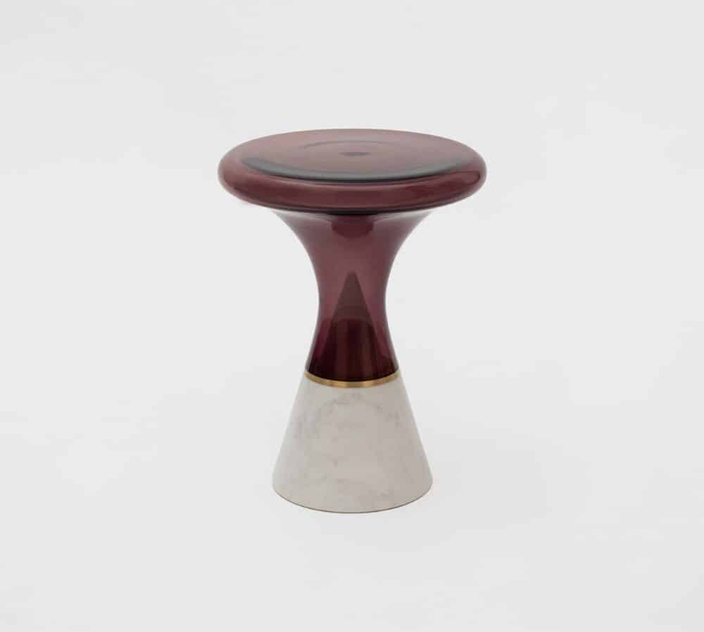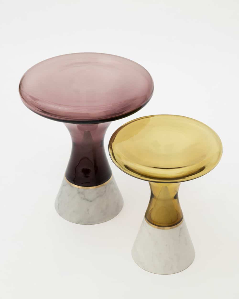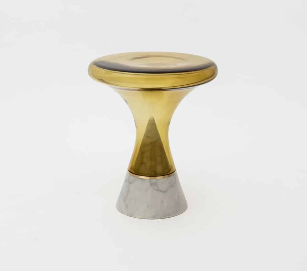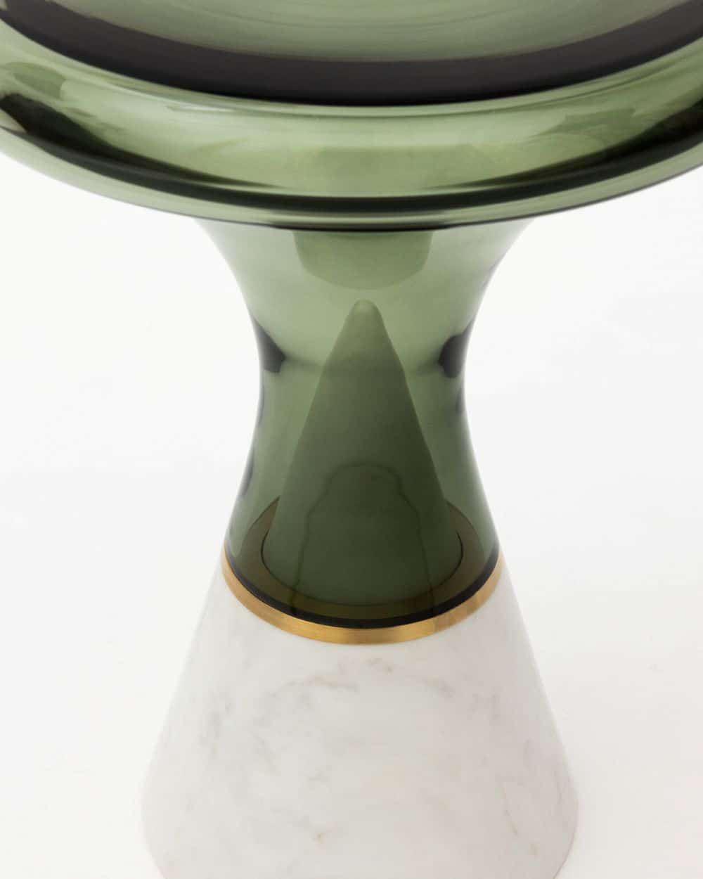 Dans cette collection qui met à l’honneur le verre soufflé, le fabricant tchèque propose également la série Join. Ces tables d’appoint nous montrent qu’avec ce même matériau, on peut créer une infinité de formes. Ici, le plateau circulaire en verre soufflé à la main trouve appui sur un socle en marbre de Carrare. La base en marbre se prolonge en forme conique dans le vide du plateau, que l’on peut apercevoir par transparence dans le verre. Un anneau en laiton massif apporte une touche de détail élégante entre la base et le plateau. Cette création, disponible en plusieurs coloris, crée un contraste intéressant. La solidité et la robustesse du marbre viennent en opposition à la fragilité et la légèreté apparente du verre.