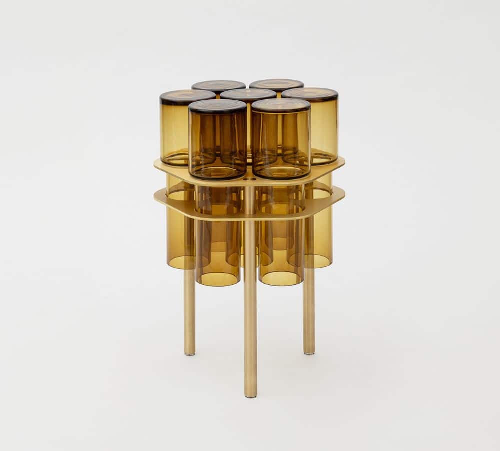On peut ainsi admirer les tables d’appoint Field 7 et Field 19 et les tables basses Field 39. Le verre utilisé est dépoli et proposé en différents coloris qui sauront refléter la lumière différemment. La forme qui prend vie grâce à l’accumulation des éléments en verre n’est pas sans rappeler les nids d’abeille.