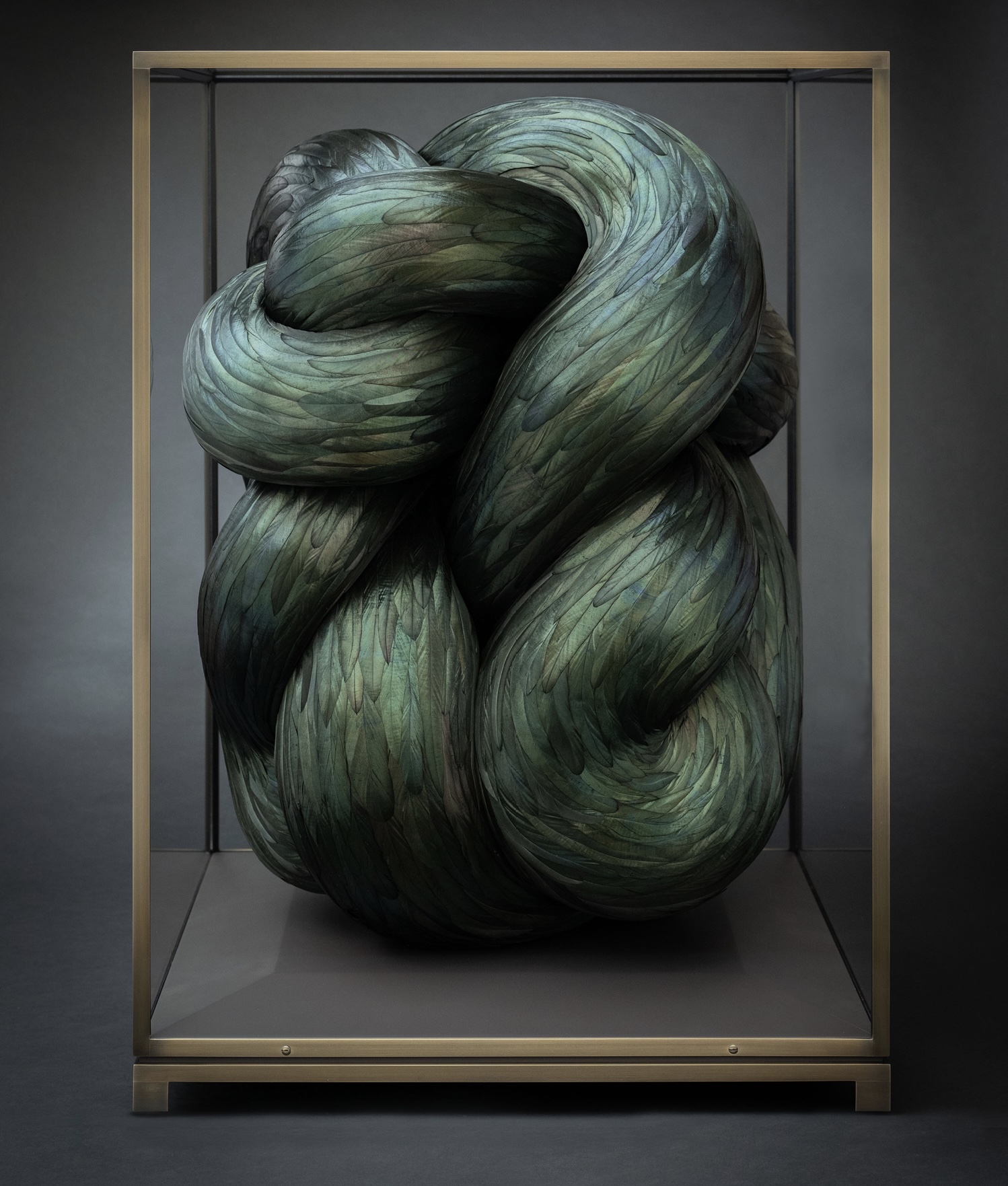 Elle captive le regard en élaborant des motifs complexes à partir de plumes chatoyantes, comme un oiseau qui chercherait à attirer son partenaire. Les formes de MccGwire sont à la fois inquiétantes et fascinantes. Elles éveillent un mélange d’attirance sensuelle et de désir teinté de crainte.