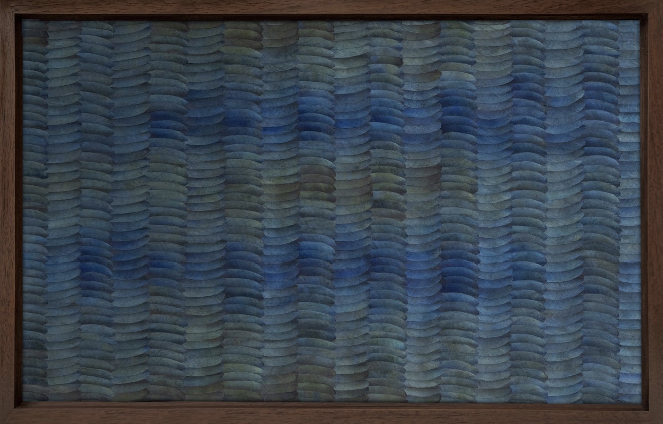 WHELM. Technique mixte avec plumes de pie, 28 x 45 x 1.2 cm