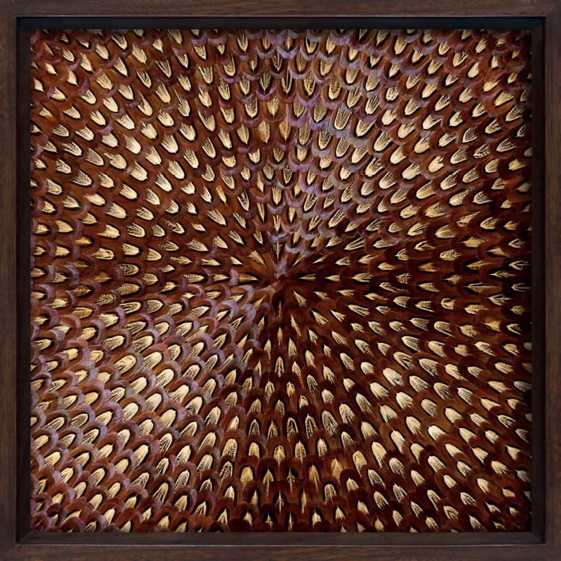 THROB. Technique mixte avec plumes de faisan, 46.5 x 46.5 x 6 cm