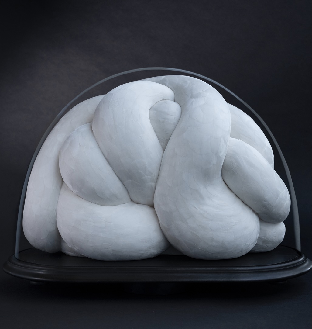 NUZZLE. Technique mixte avec plumes d’oie dans un dôme en verre antique, 45 x 60 x 20 cm