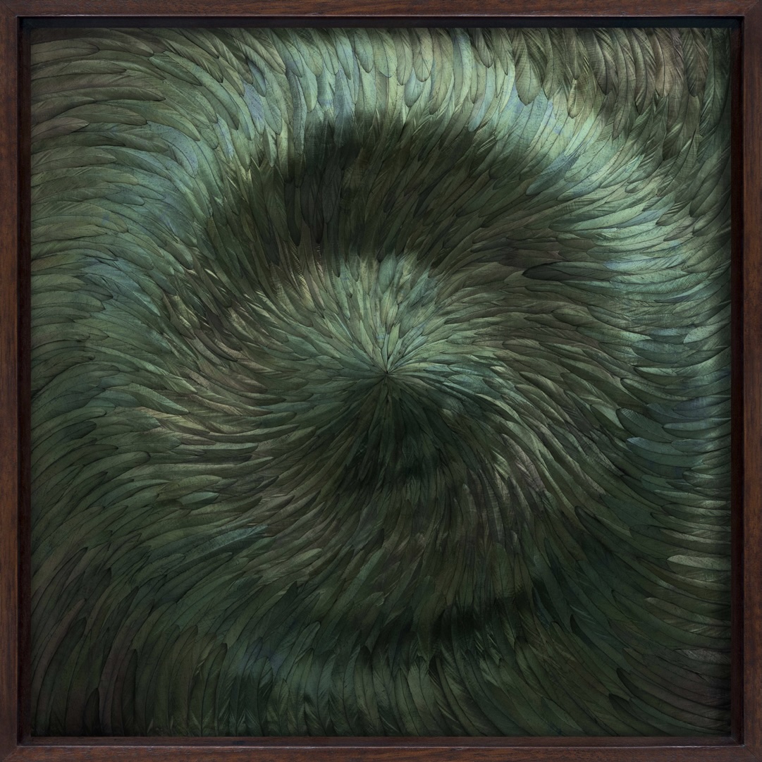 MAELSTROM. Technique mixte avec plumes de coq, 80 x 80 x 1.2 cm
