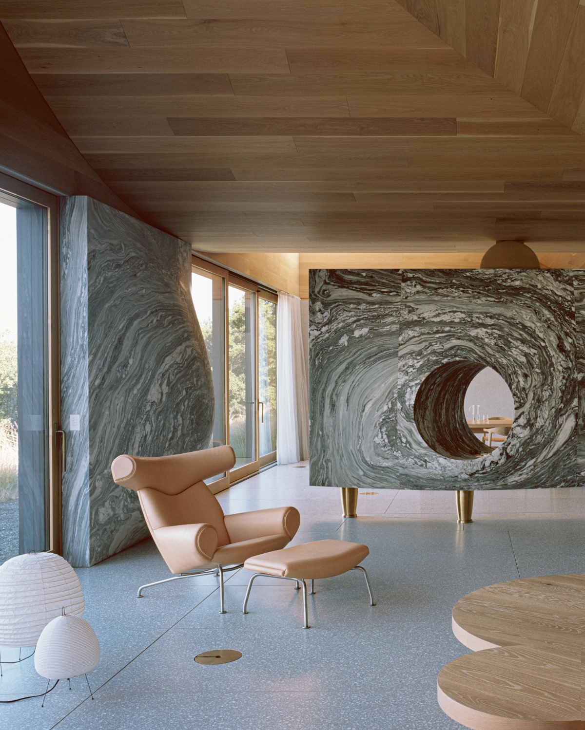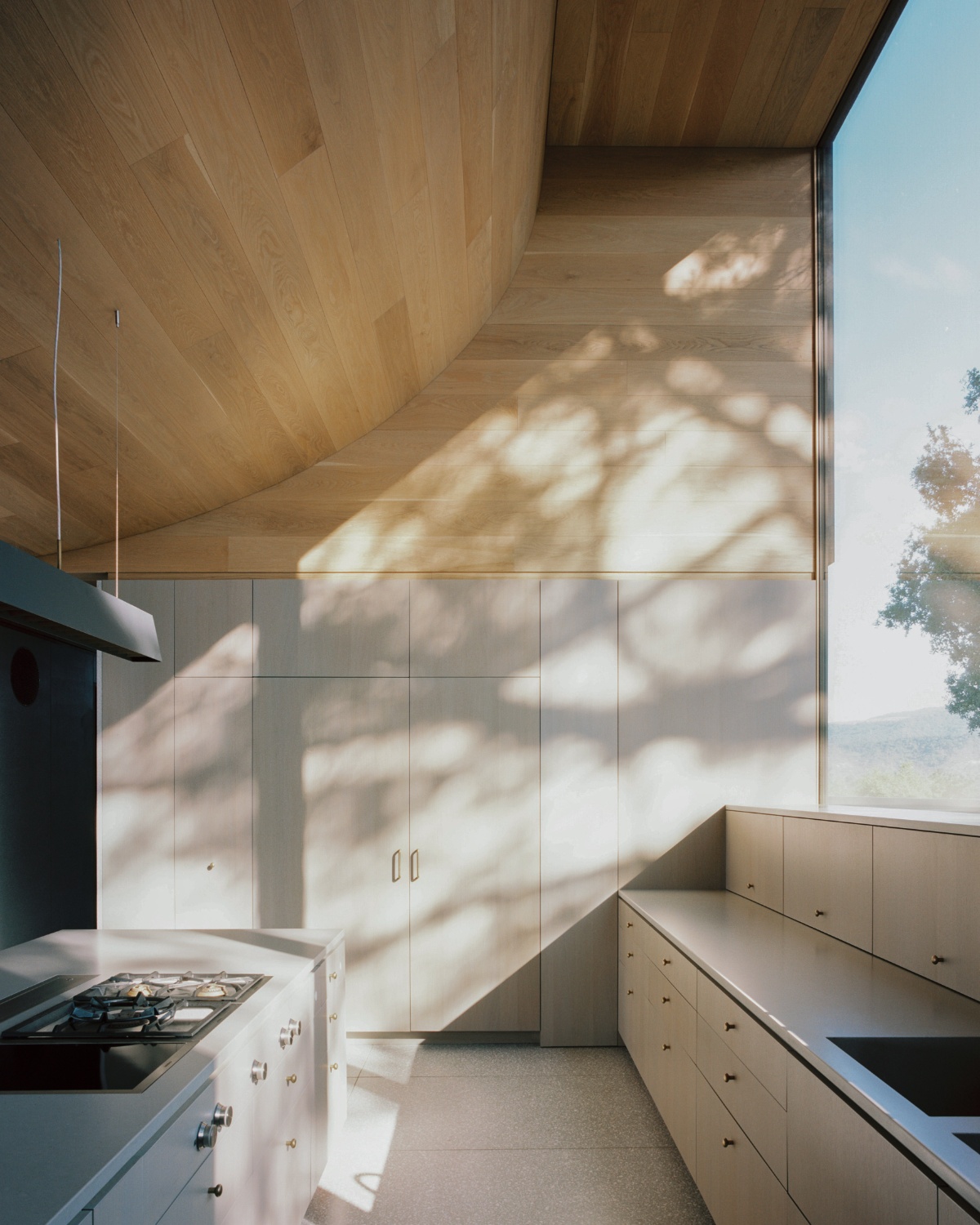 Au-dessus – une maison de plain-pied est perchée sur la colline, ses murs rejoignant délicatement le sol de chaque côté ; à l’intérieur, un grand espace ouvert sert de lieu de rassemblement pour manger, cuisiner et socialiser. Le plafond présente une série de voûtes elliptiques inversées couronnées de puits de lumière et de claires-voies, chacune conçue pour capter la lumière sous un angle spécifique. Une subtile quille basse s’étend au centre, divisant délicatement l’espace, tandis qu’une imposante cheminée en pierre, taillée dans du marbre Danby du Vermont, ancre le cœur de la maison.