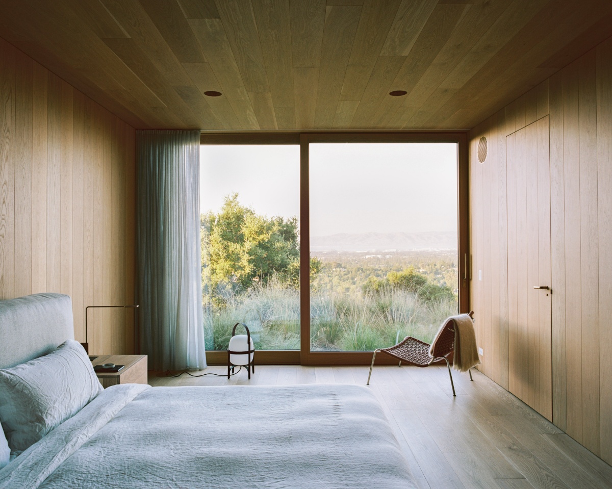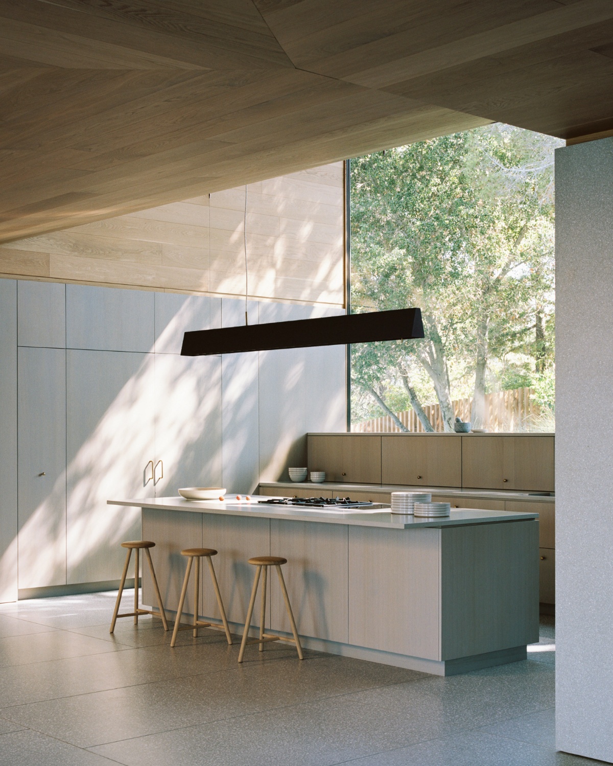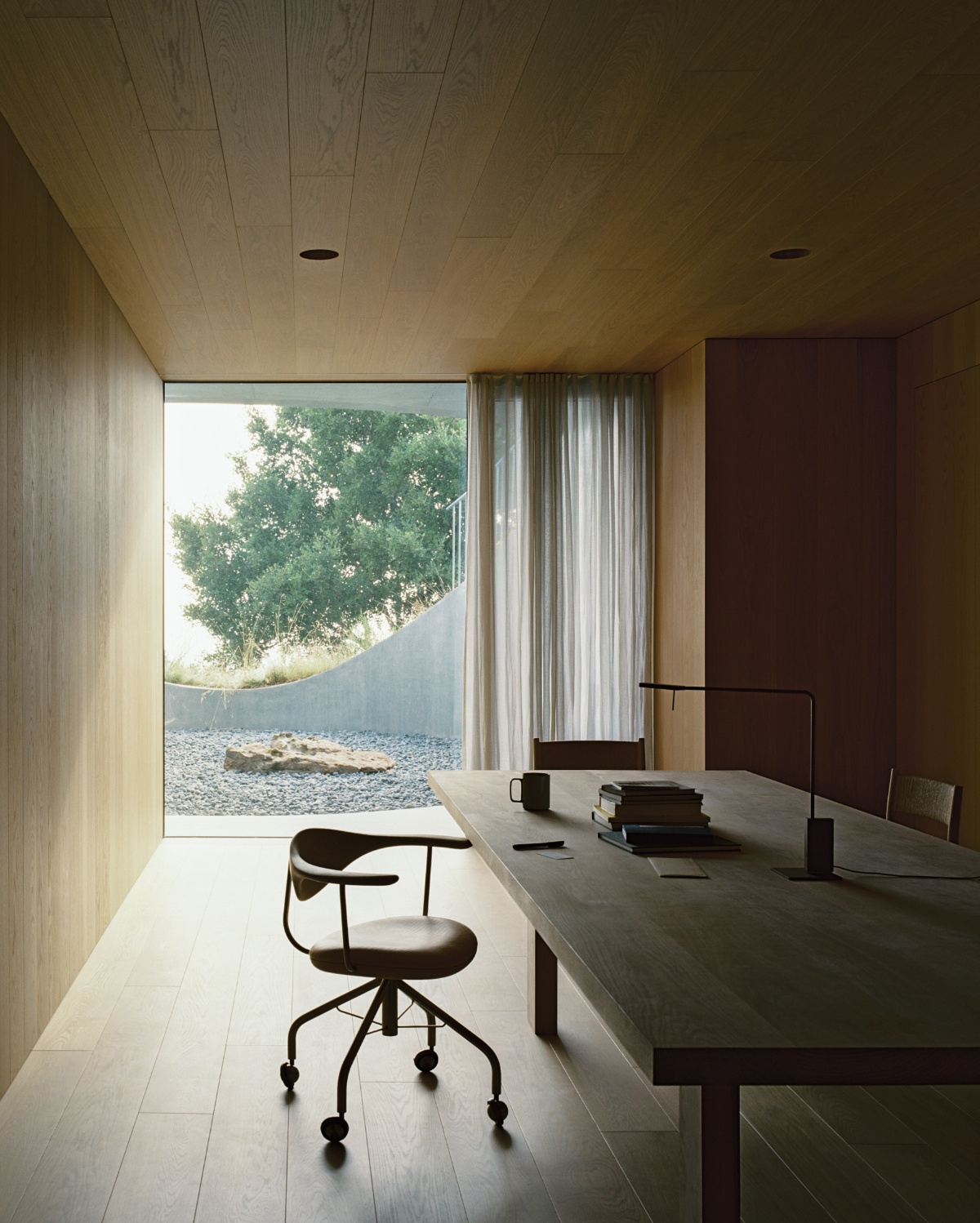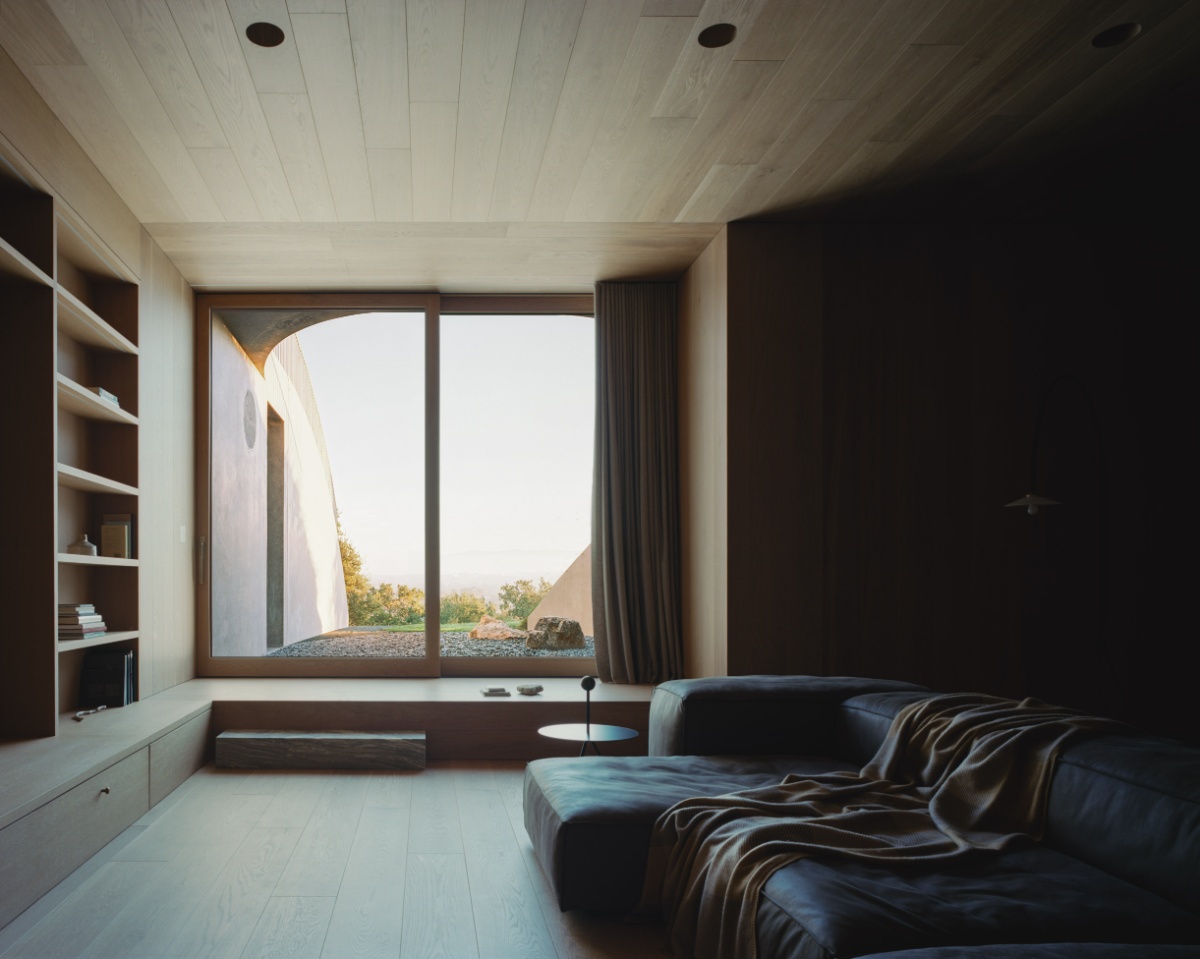 Autour de la maison, le coteau a retrouvé son état naturel et sauvage. Une prairie d’herbes indigènes californiennes à faible consommation d’eau, de plantes vivaces, de broussailles et de chênes verts crée un paysage à plusieurs niveaux qui reflète la complexité de la maison. Ce terrain soigneusement aménagé prolonge l’expérience architecturale dans le monde naturel, faisant de la maison et de son environnement un instrument unifié et finement réglé pour appréhender le monde changeant qui l’entoure.