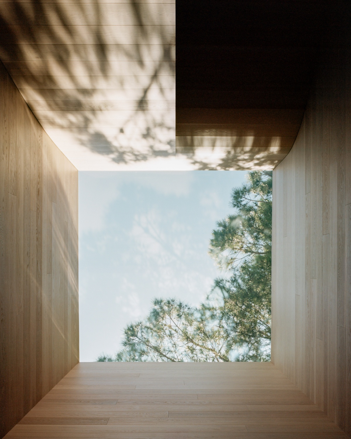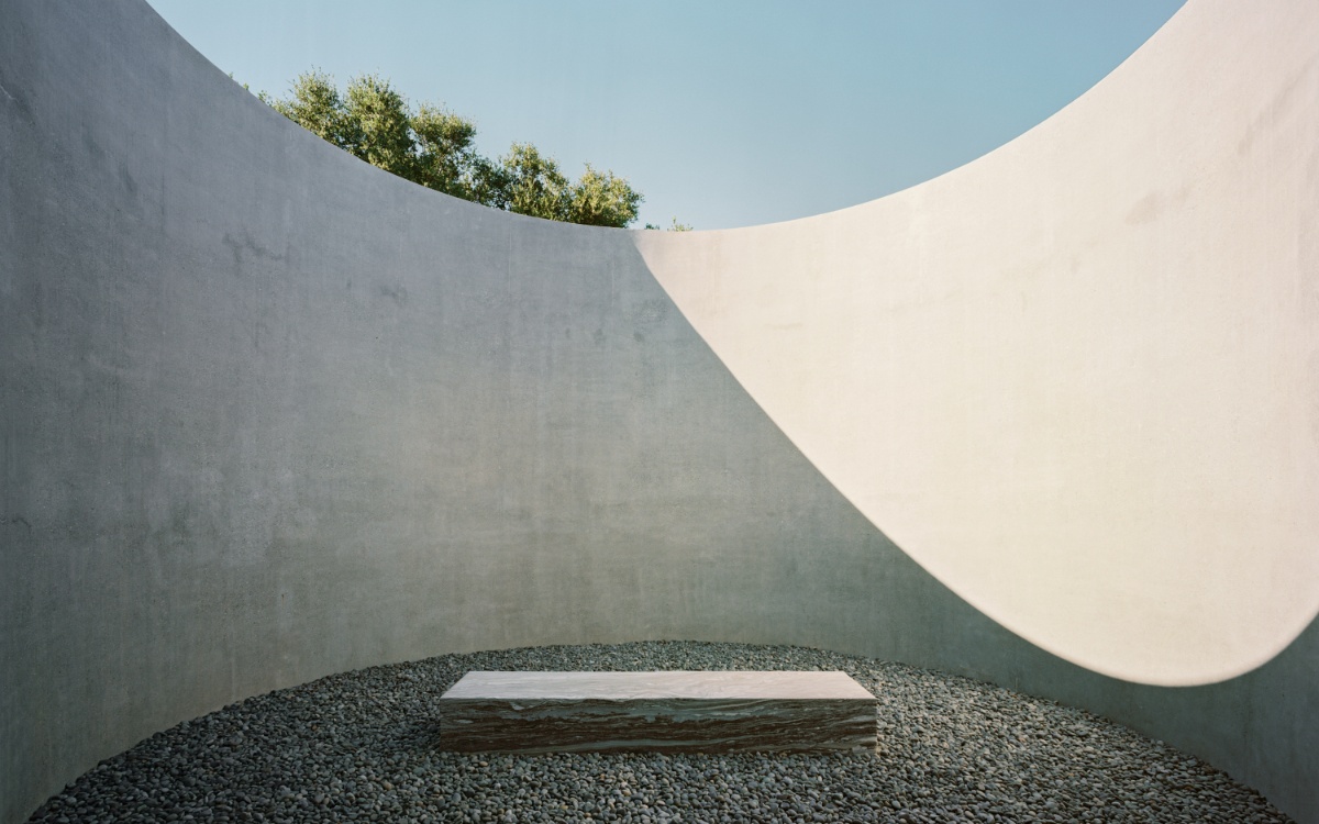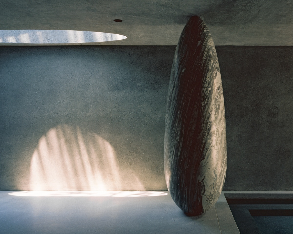 En-dessous – la partie inférieure se déploie en une série de pièces uniques. Au cœur se trouve un espace de baignade aux allures de grotte, soutenu par une colonne ovoïde taillée dans la pierre. Ces pièces s’ouvrent sélectivement sur des cours intérieures en contrebas, créant ainsi des liens intimes avec la prairie et l’horizon lointain.