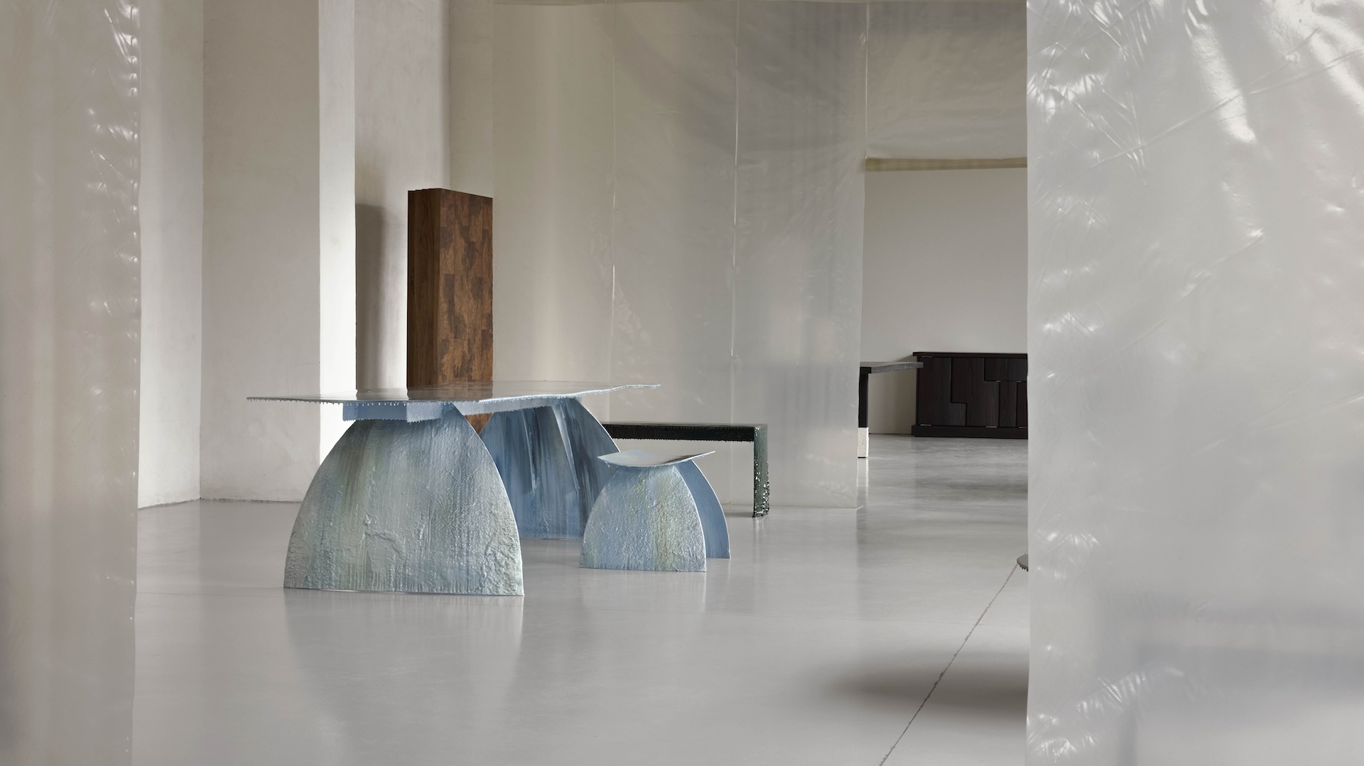 L’exposition, qui explore la matière, les sens et la collaboration, s’est installée dans un espace industriel situé dans le quartier de la Fondazione Prada. Ce lieu, construit en 1949 et récemment rénové, dispose de grandes baies vitrées orientées sud donnant sur une luxuriante véranda et un jardin privé.