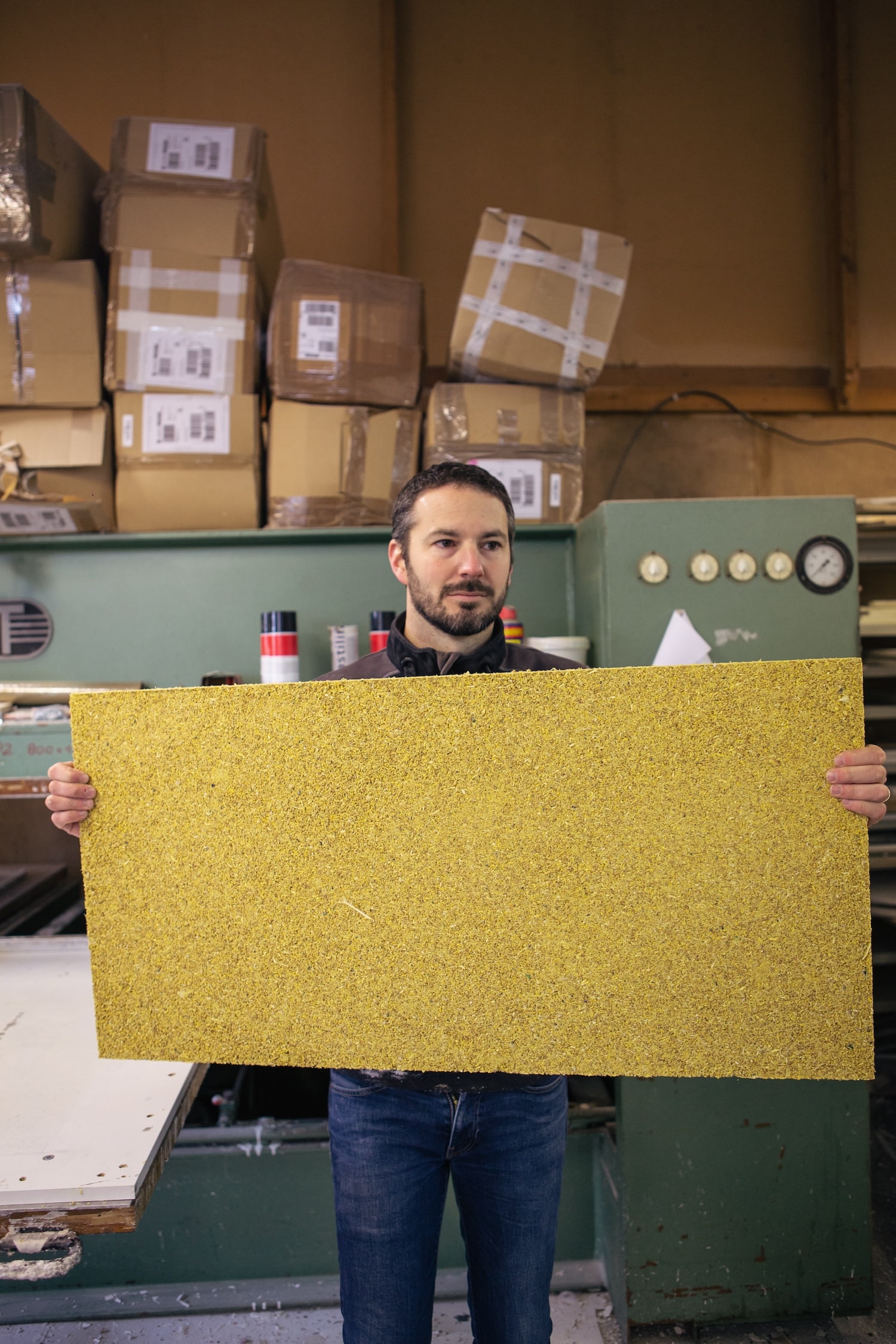 Après un processus de collecte auprès des clubs sportifs, les volants sont broyés, mélangés à un liant, puis pressés à froid – un choix écologique pour éviter la consommation d’énergie liée à la chaleur et au séchage accéléré. Le résultat : un matériau écoresponsable, solide et esthétique, utilisé pour fabriquer des tables, des panneaux acoustiques, des luminaires et même des comptoirs.