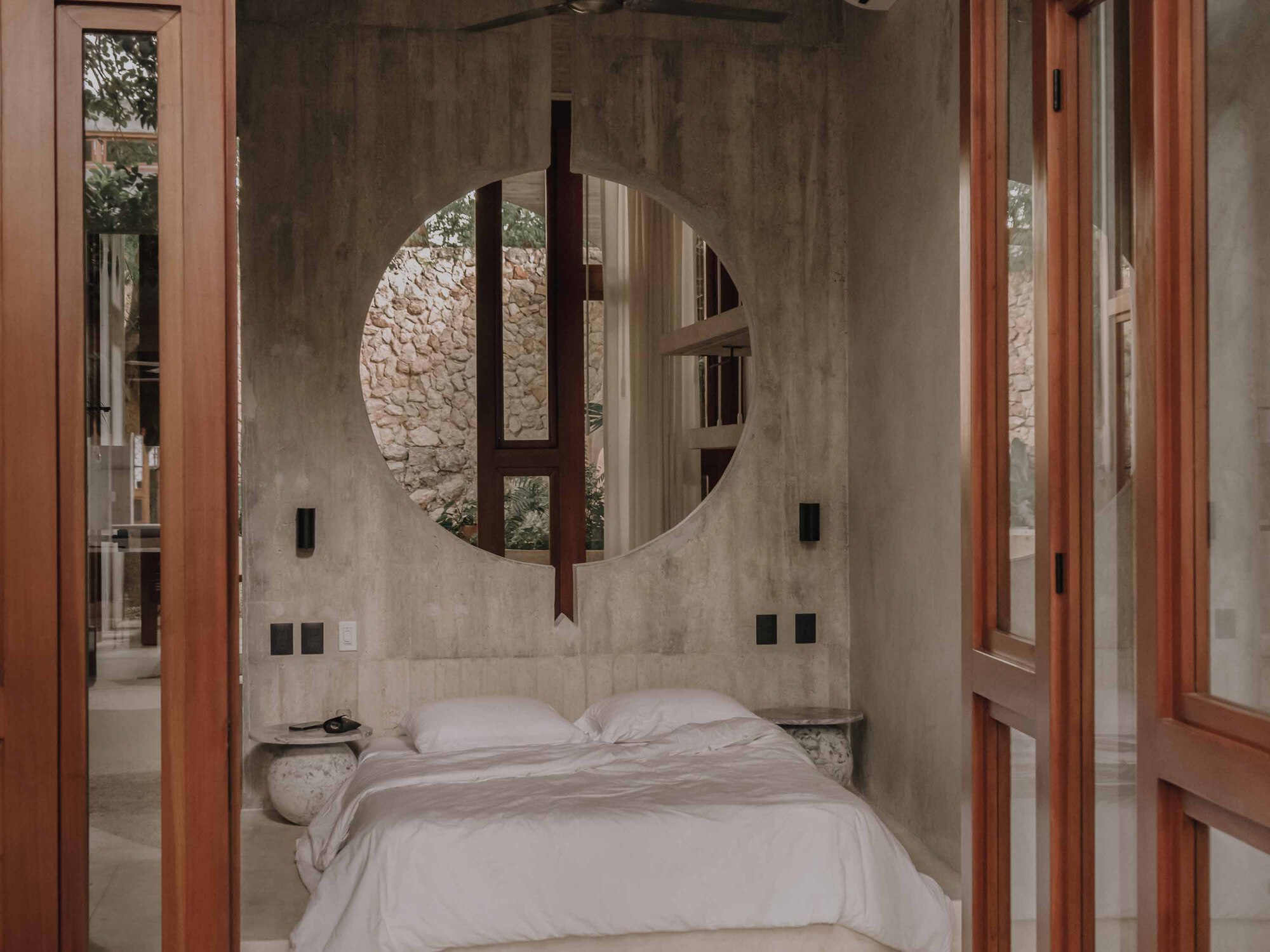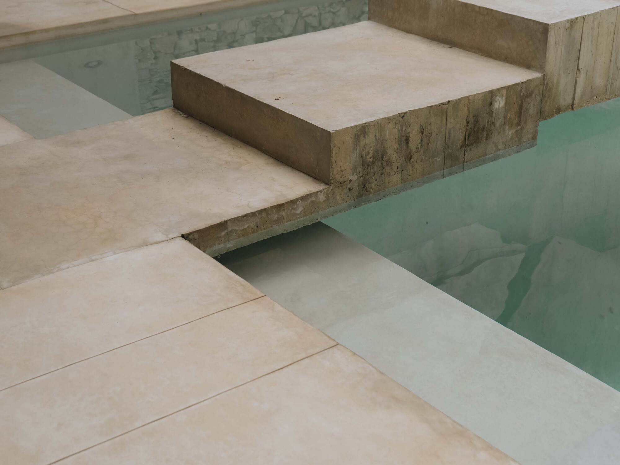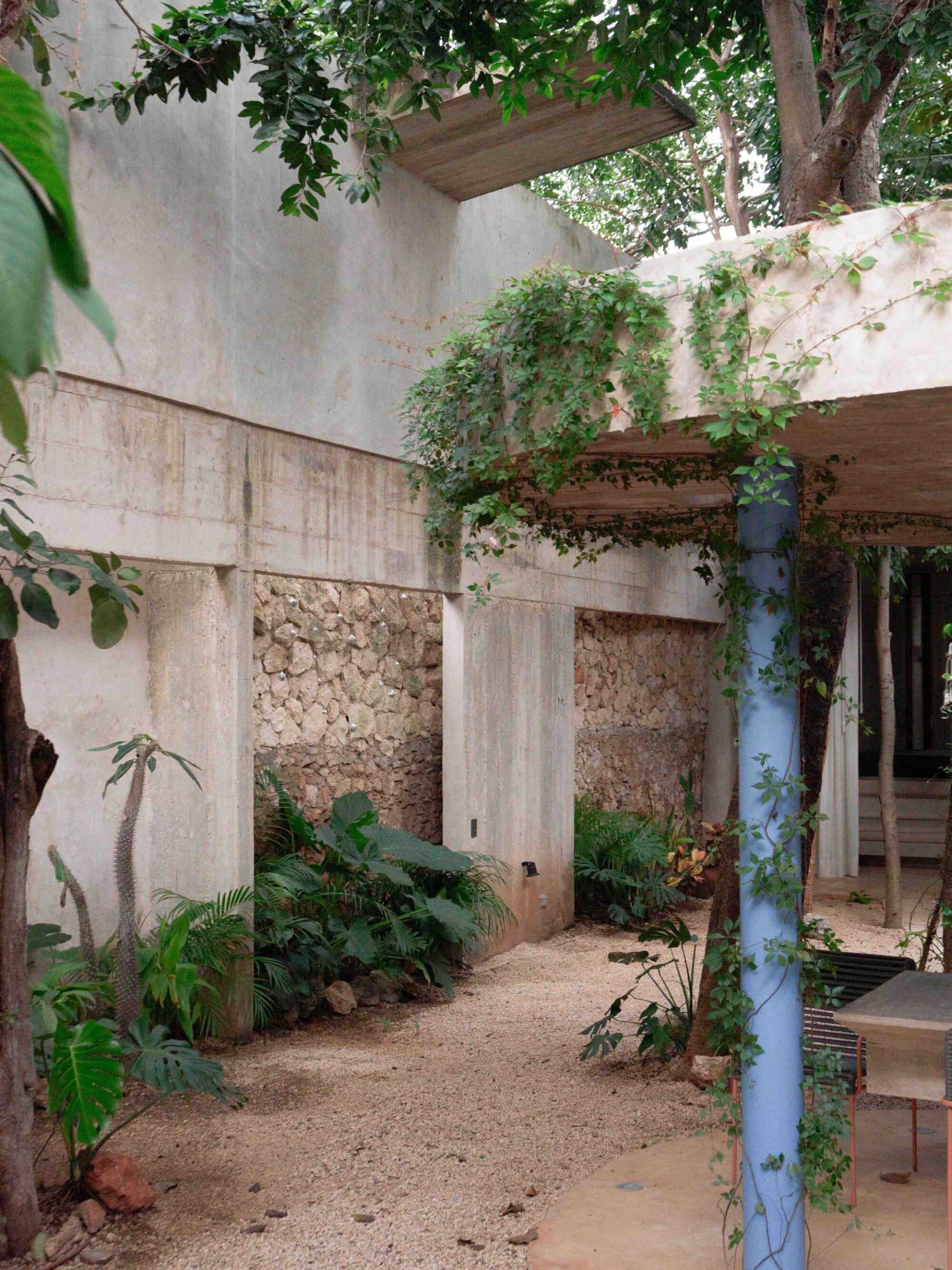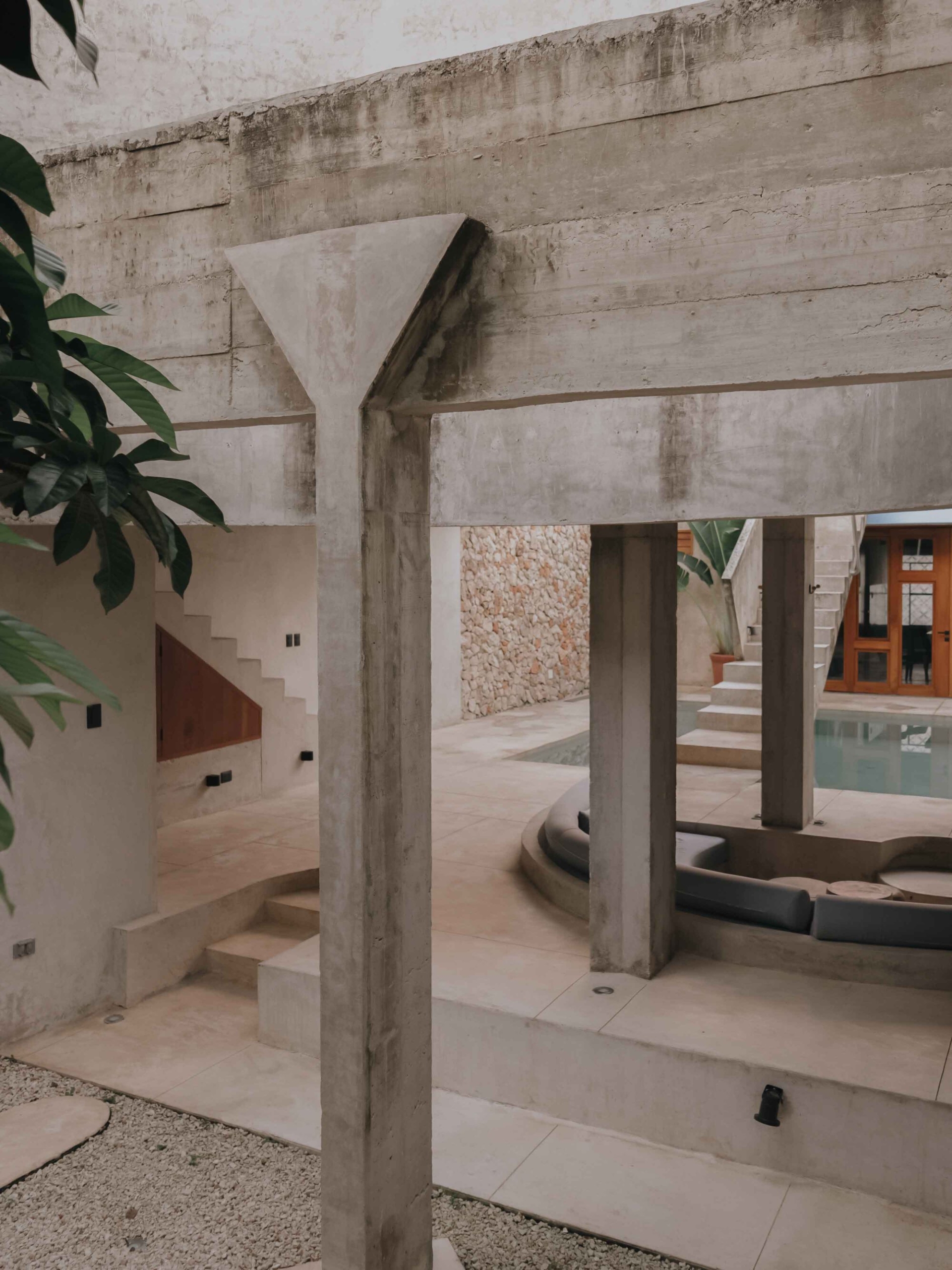 Casa Soskil est aussi un essai tout en contrastes, composé à partir des dualités naturelles du site. À l’avant, baignée de soleil, la vie se concentre autour d’une piscine et d’un solarium, véritable espace lumineux d’énergie sociale. Vers l’arrière, ombragé, la vie ralentit vers l’introspection, avec un foyer, des chambres et un bureau encastré dans les ombres tamisées. Cette fragmentation délibérée de la vie domestique en pôles d’activité et de repos transforme le mouvement à travers la maison en une danse rythmée entre ombre et lumière.