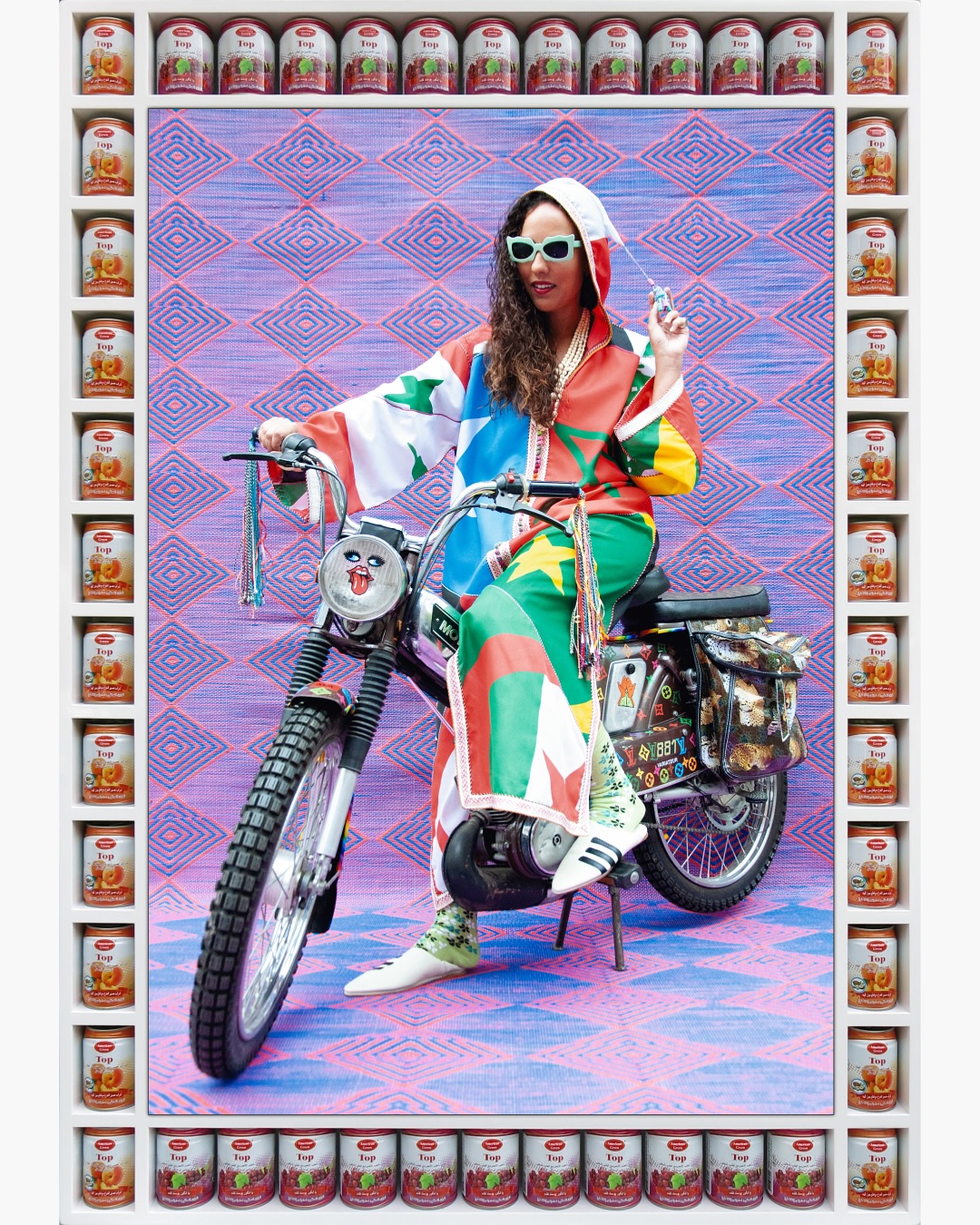 Trois paires de pieds sur une natte, des chaussettes de foot et six babouches ornées de ce swoosh de contrebande vu dans tous les souks de Marrakech, du Maroc, d’Afrique du Nord et au-delà. La photographie se nomme « Nyke Legs, 2016/1437 ». Son cadre en bois de peuplier blanc laqué est formé de 62 Lego multicolores marqués aux lettres de l’alphabet arabe. Son auteur Hassan Hajjaj est à l’honneur jusqu’au 31 mai à la 193 Gallery, dans le quartier parisien de République.