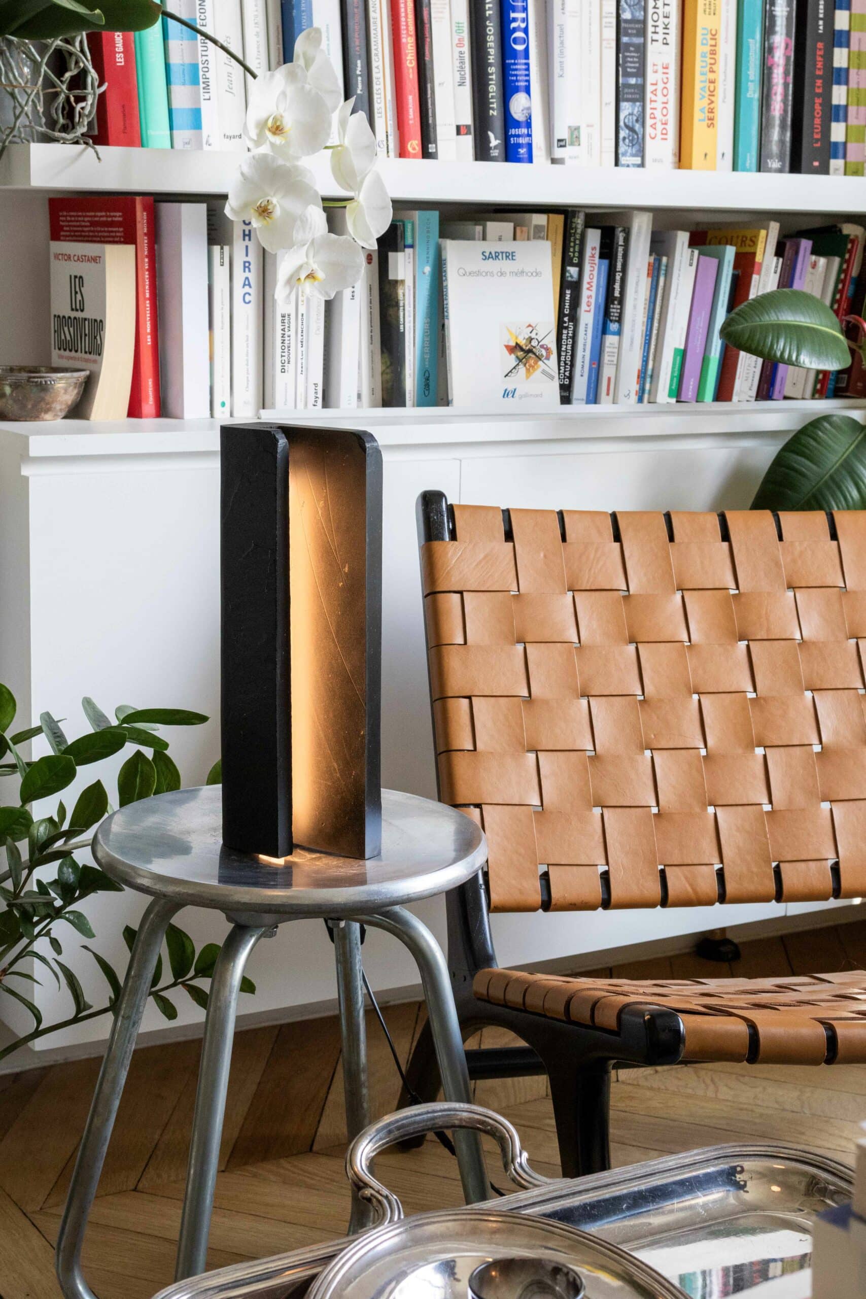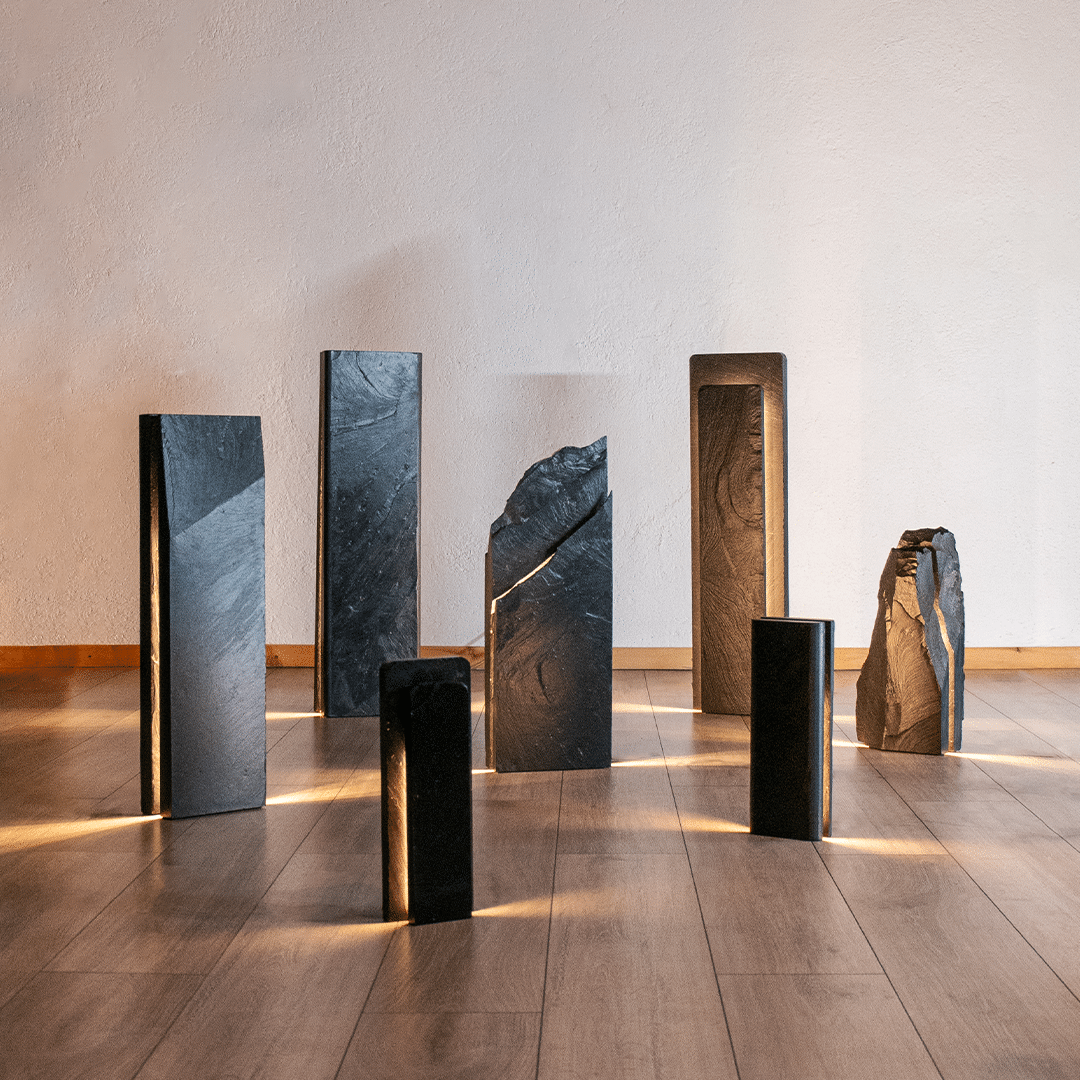 Chaque luminaire est pensé comme un hommage au geste : le clivage qui révèle la fissilité naturelle de la roche, les veinages marqués, les strates visibles, tout participe à une conception minutieuse et minimaliste.