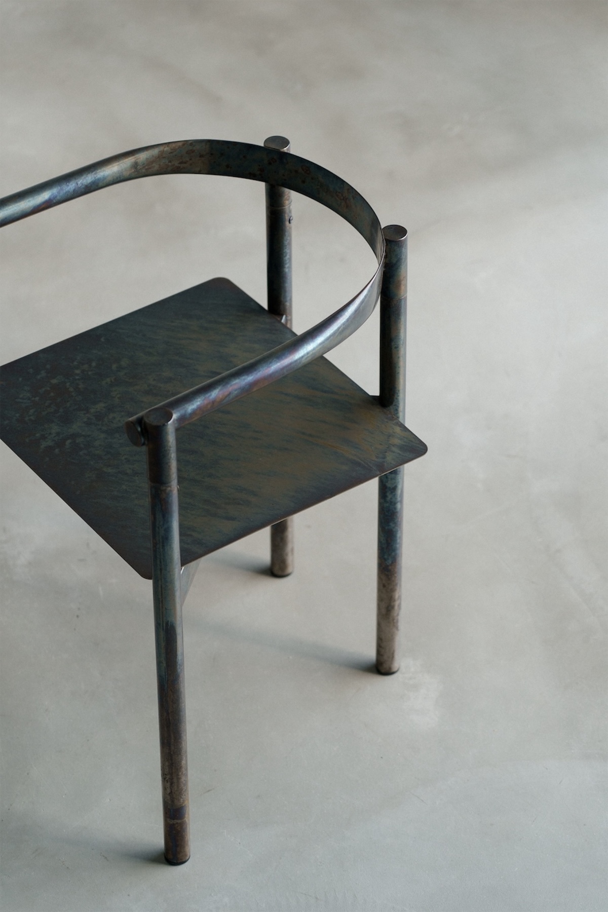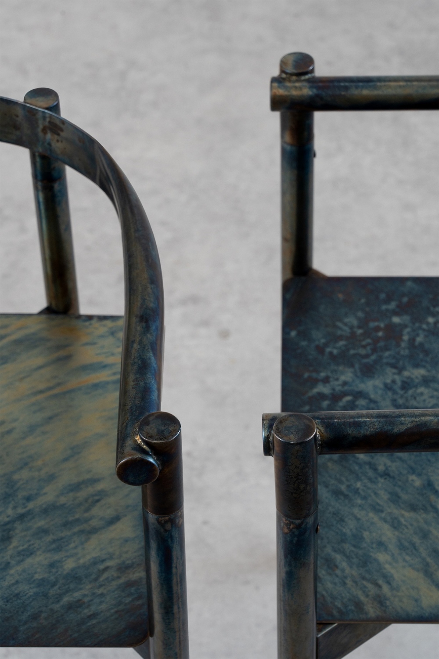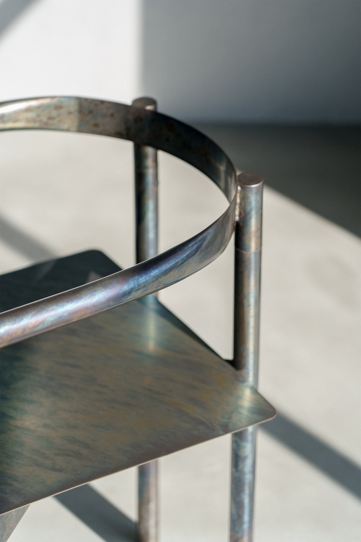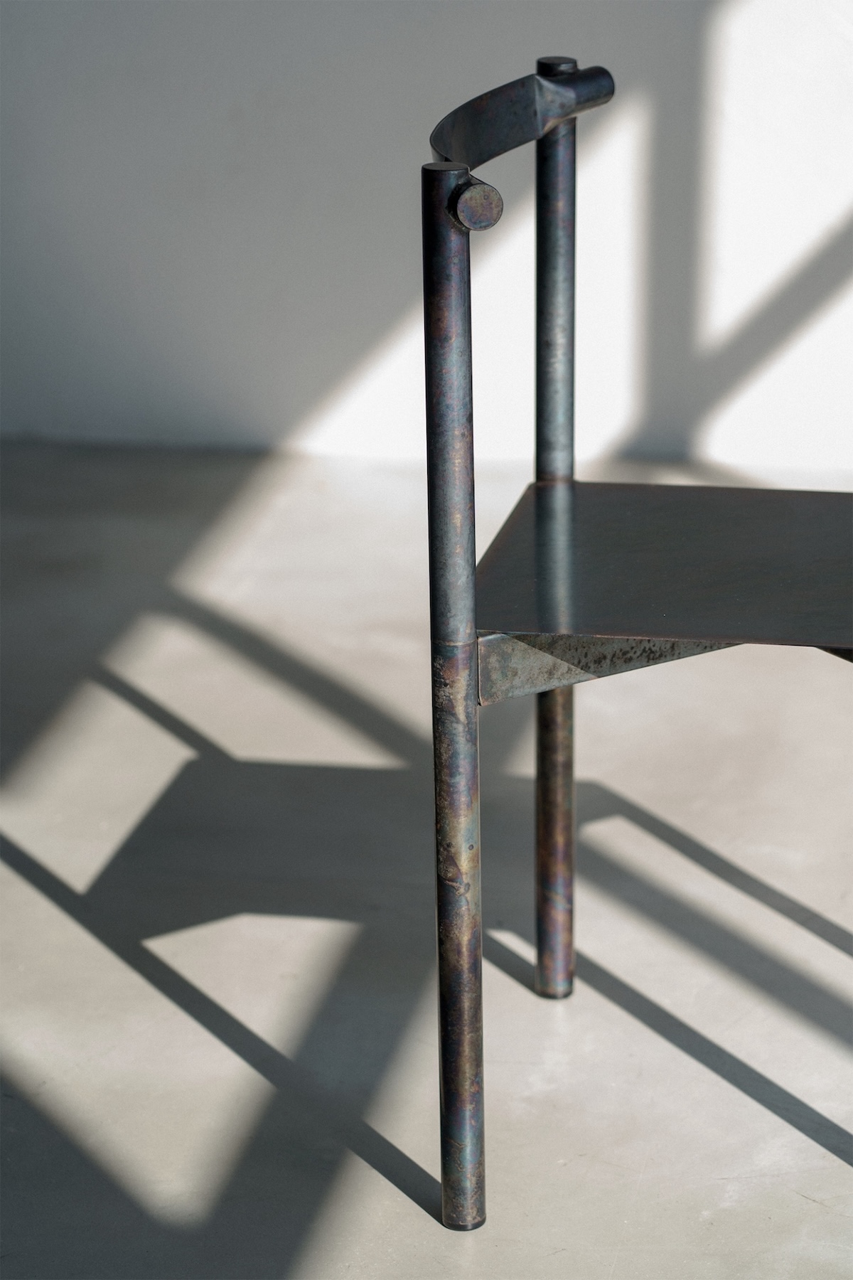 Ce qui distingue visuellement cette chaise, c’est sa surface. Grâce à un procédé traditionnel de coloration au bain de sel, chaque pièce est traitée artisanalement pour former une riche pellicule d’oxyde directement sur l’acier.