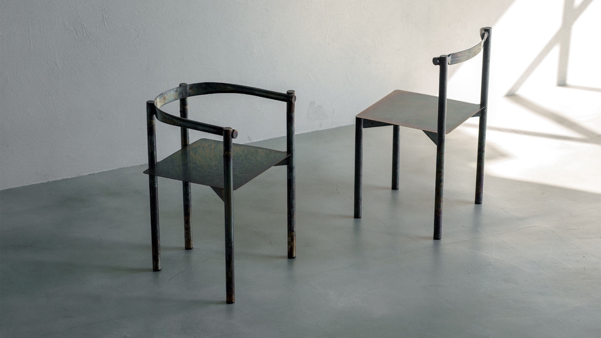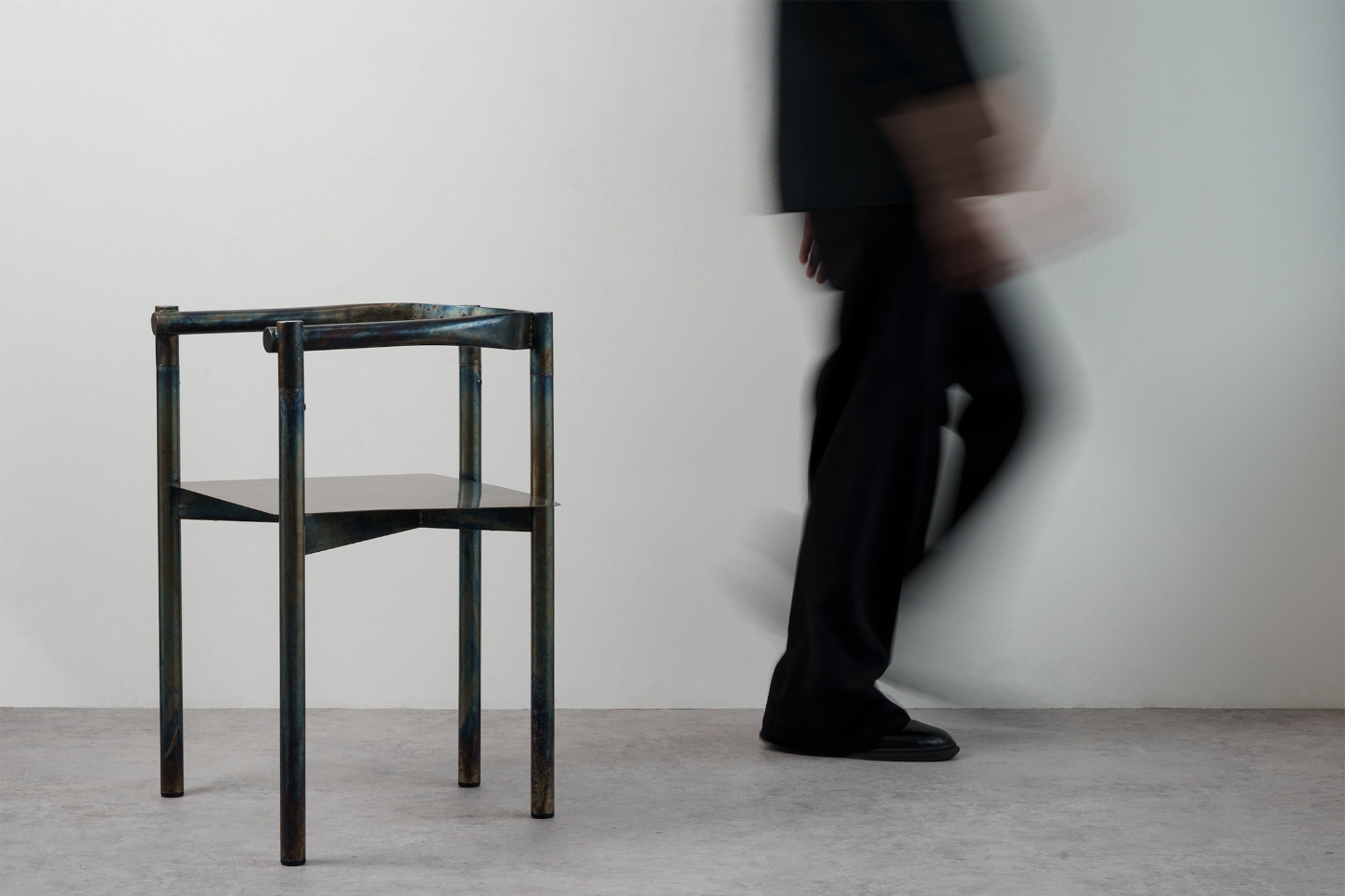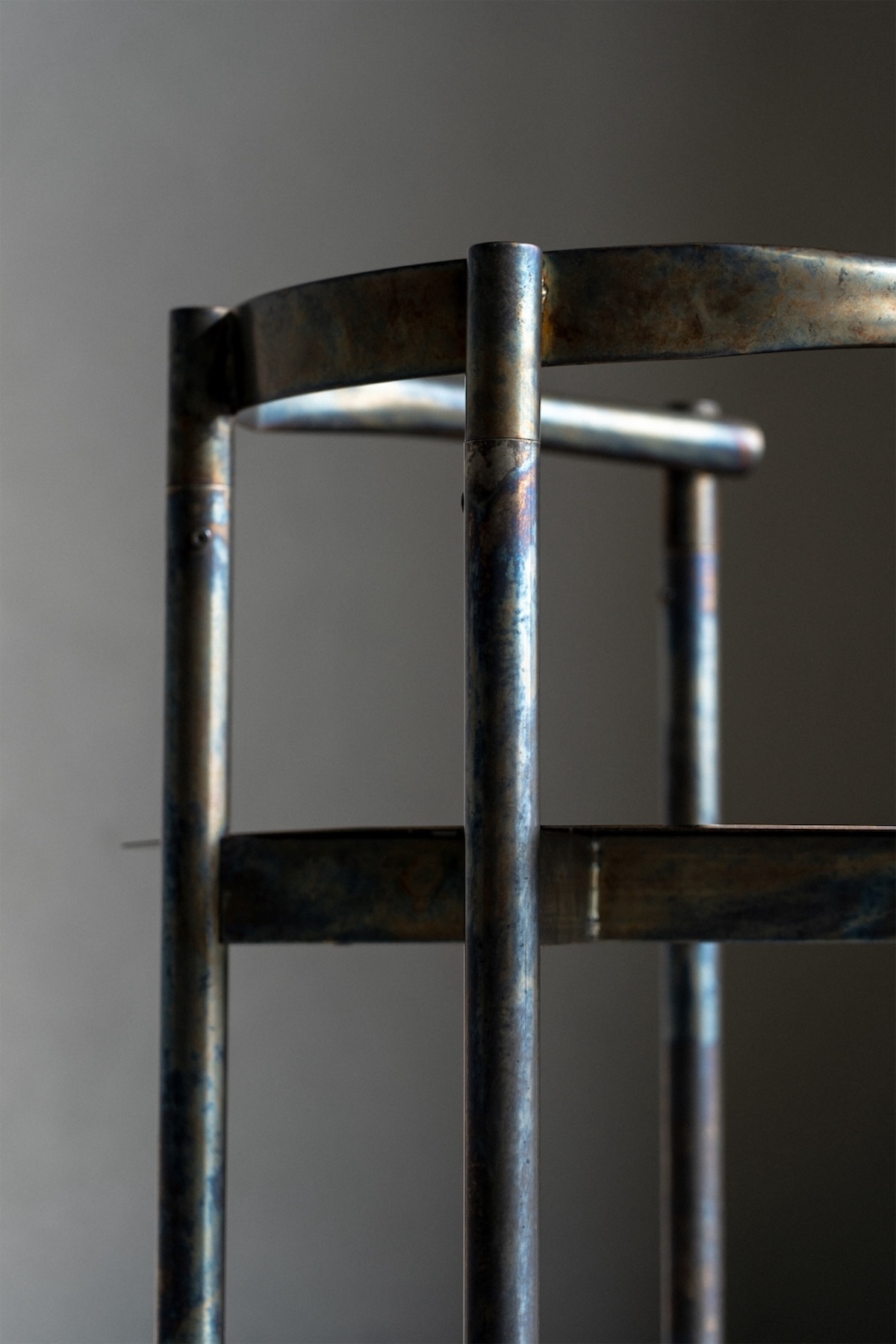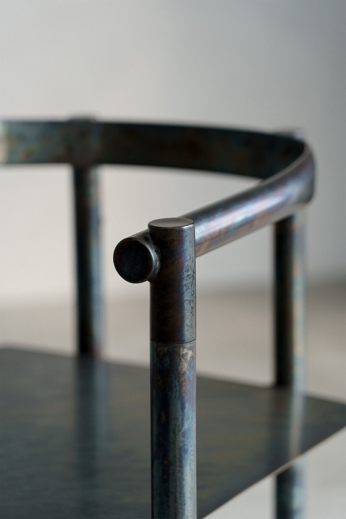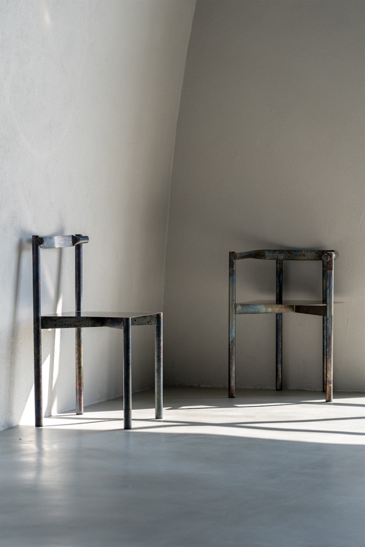 Ce qui distingue visuellement cette chaise, c’est sa surface. Grâce à un procédé traditionnel de coloration au bain de sel, chaque pièce est traitée artisanalement pour former une riche pellicule d’oxyde directement sur l’acier.