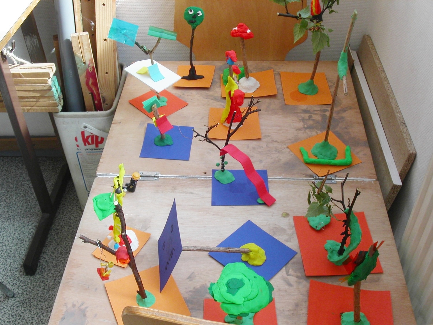 Avec les enfants, elle co-construit une « forêt impossible » : lisières en bordures de trottoir détournées, arbres imaginaires, mobilier sur-mesure, sol peuplé de lacs dessinés. Le tout construit avec un budget très serré et l’aide des services techniques de la ville.