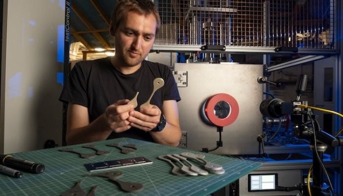 Charlie Patterson examine des échantillons de matériaux imprimés en 3D (crédits photo : University of Glasgow)