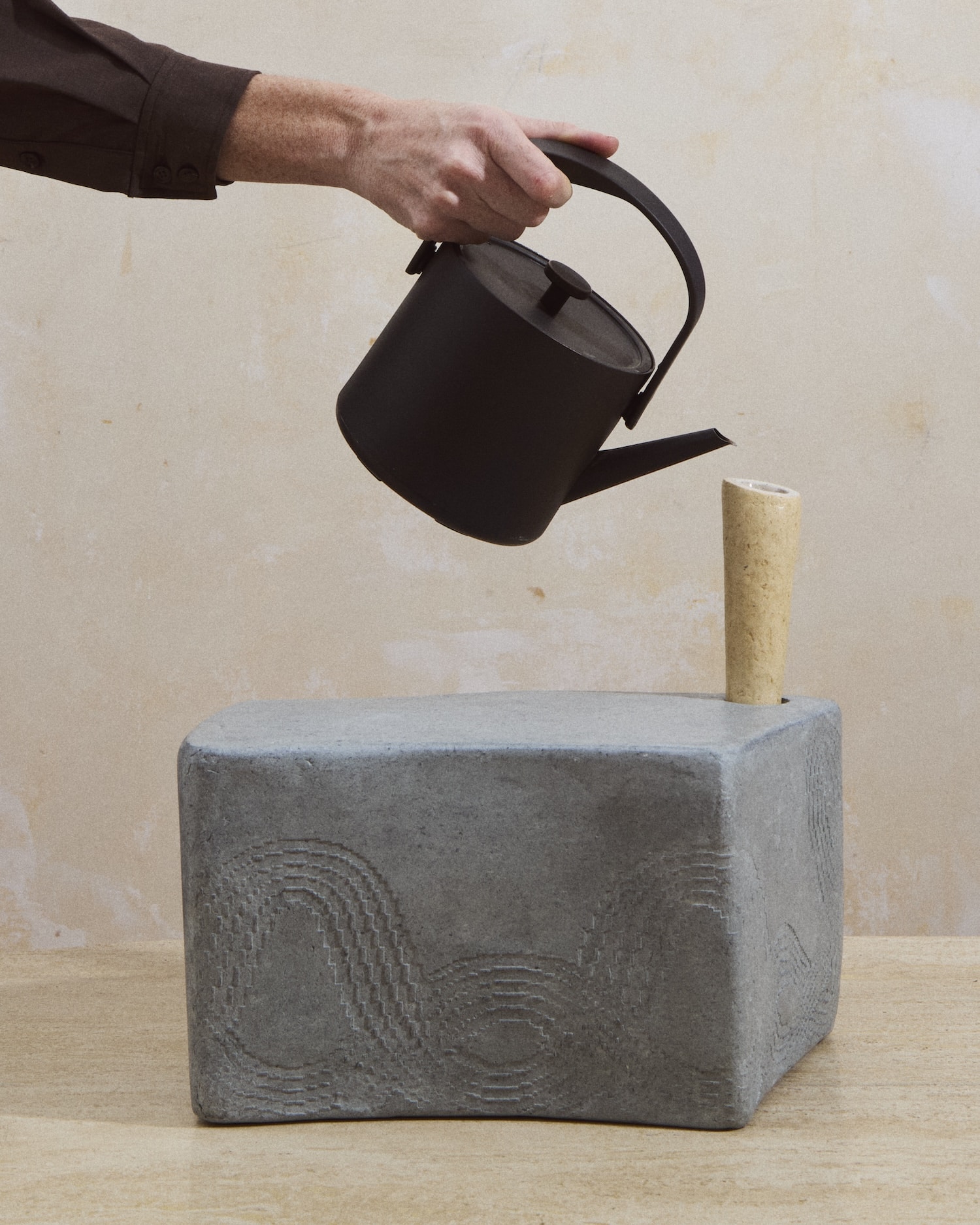 Avec la céramiste Camille Chaleil, hors-studio conçoit une série de trois bouillottes d’intérieur faites de céramique et de Leatherstone©. Ces objets low-tech répondent au besoin de « chauffer les personnes et non les espaces », selon une logique de sobriété énergétique. La double paroi émaillée permet d’y verser de l’eau chaude, diffusée ensuite lentement par le Leatherstone, alliant efficacité thermique et esthétique artisanale.