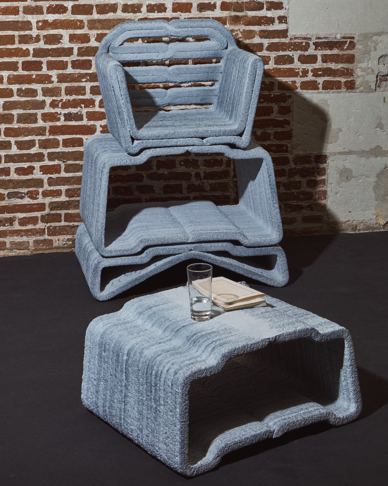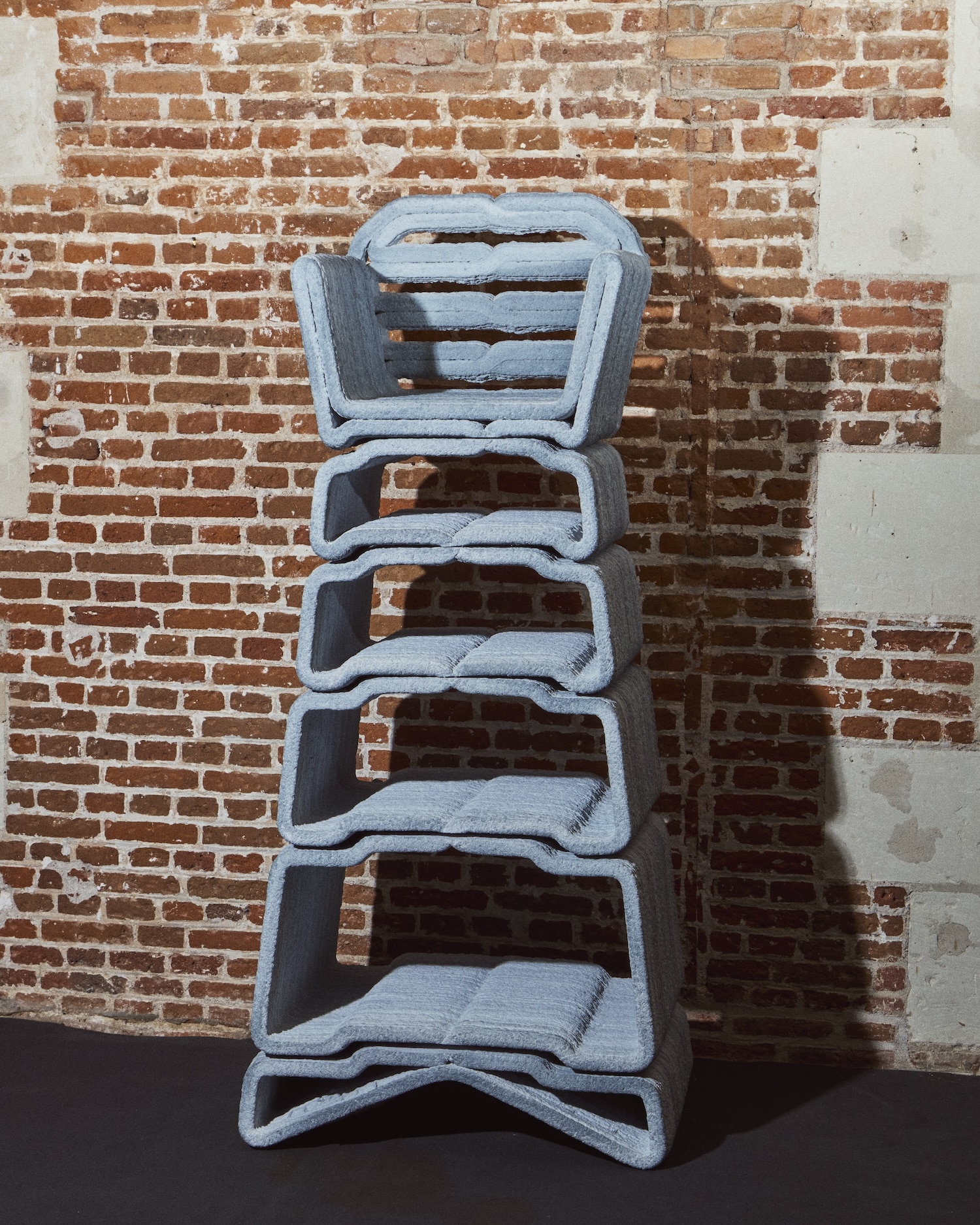 Créée en collaboration avec le designer Emmanuel Hugnot, Trosne est une chaise haute imprimée en 3D en Leatherock, un biomatériau fait de chutes de cuir et d’un liant minéral. Cette structure modulaire exploite le principe de convection de l’air chaud, permettant à l’usager de s’élever dans l’espace chauffé naturel d’une pièce — une solution thermique ingénieuse, à la fois sobre et innovante.