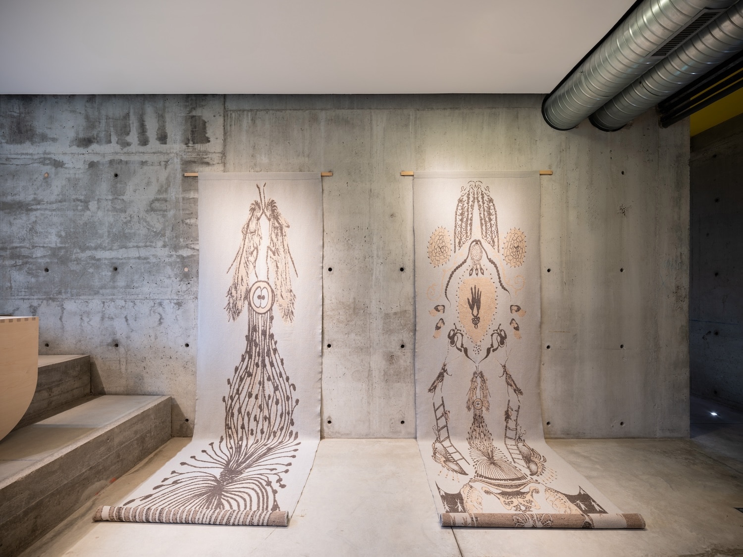Le studio matali crasset, c’est aussi une histoire de famille. On connaissait Francis Fichot, partenaire dans la vie et dans le travail de la designer, mais bien moins Popline Fichot, leur fille, pour laquelle l’exposition Nos pieds d’argile est l’occasion de mettre l’accent sur son univers. On vous invite à découvrir ses différentes oeuvres, parmi lesquelles les grandes tissages baptistés Les mites parallèles.