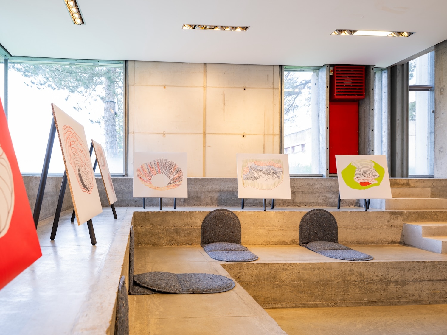 - Réparer le terrain : un espace de discussion collectif pensé comme une agora fluide, avec des tabourets mobiles, une structure boisée centrale et une scénographie participative. L’objectif : créer un commun, poser les bonnes questions et documenter nos débats. A découvrir aussi dans ce cadre, une installation à l’extérieur du lieu d’exposition pour activer un séchoir collectif avec les étudiants de la HEAD Genève.