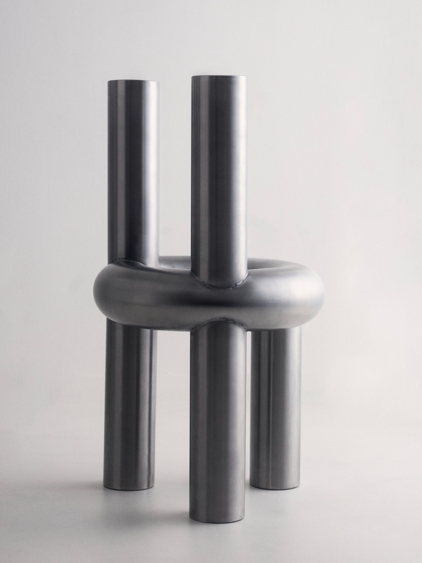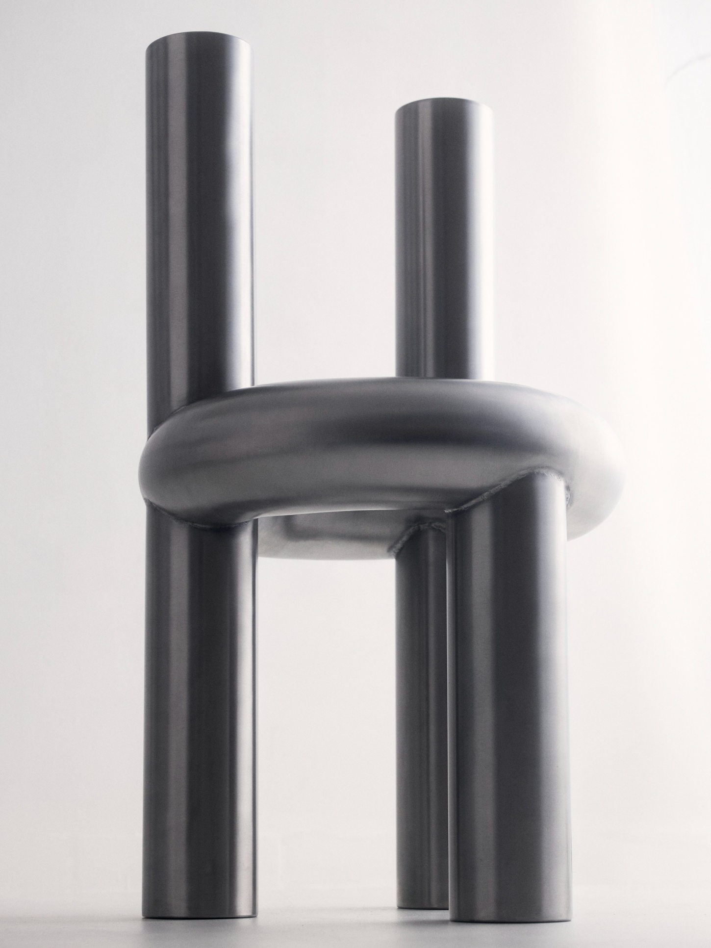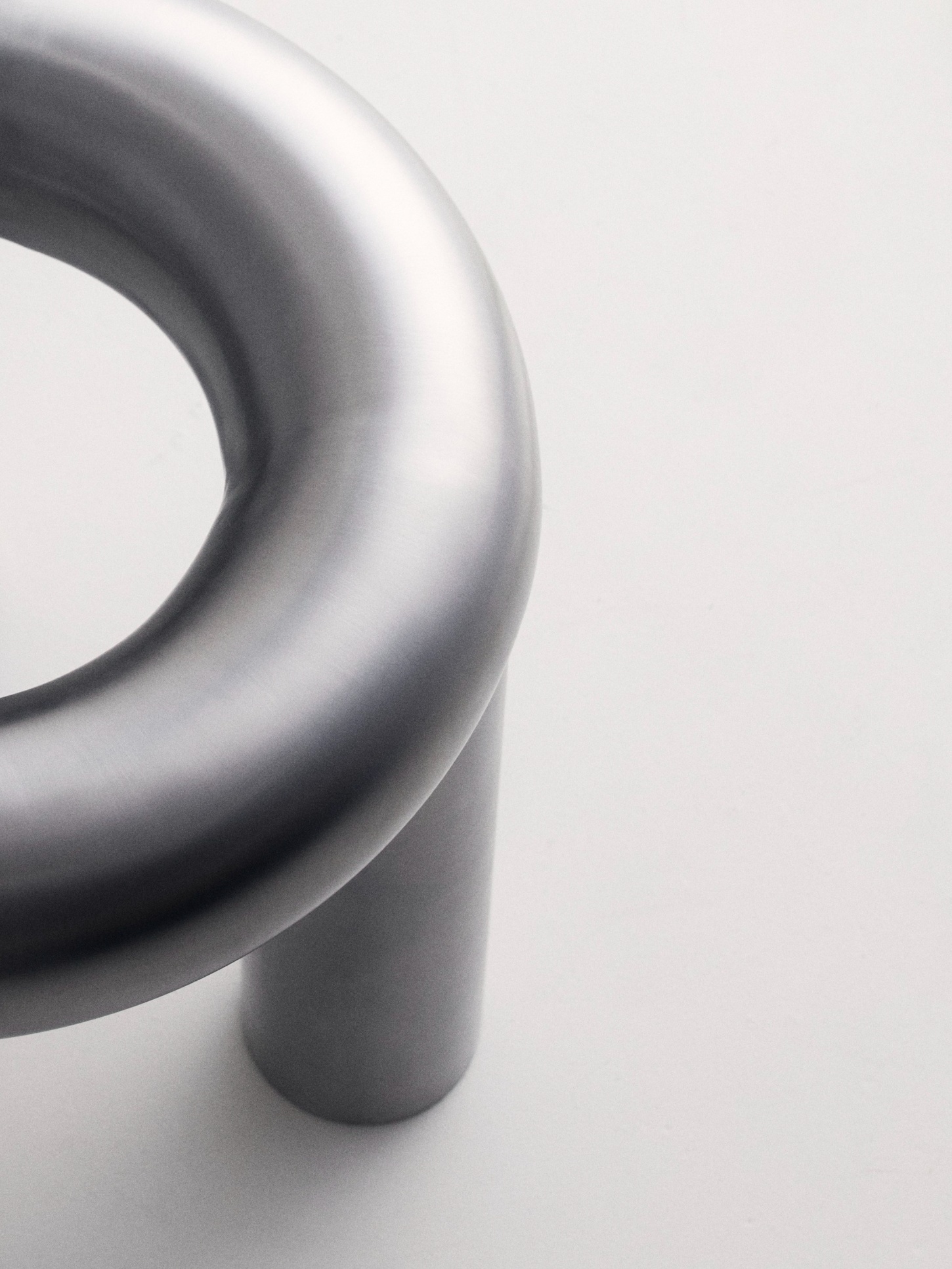 Au premier regard, ses trois pieds surdimensionnés, forgés en acier inoxydable massif, évoquent la silhouette familière et pourtant élancée d’une assise circulaire surélevée.