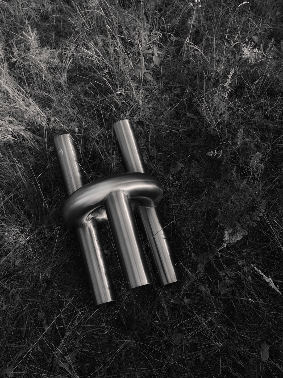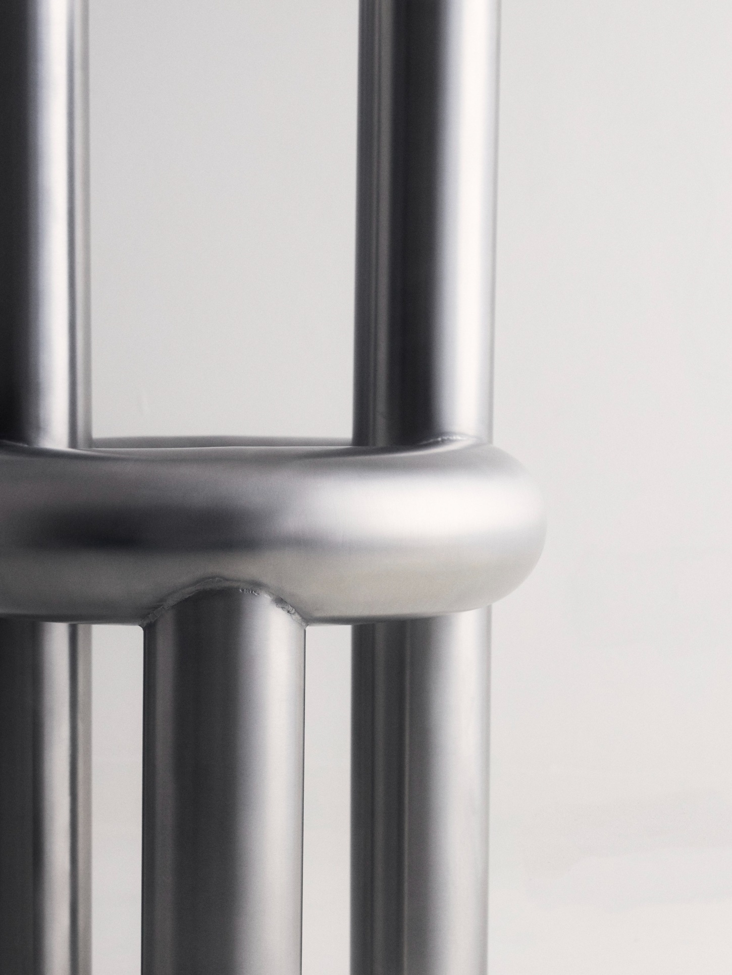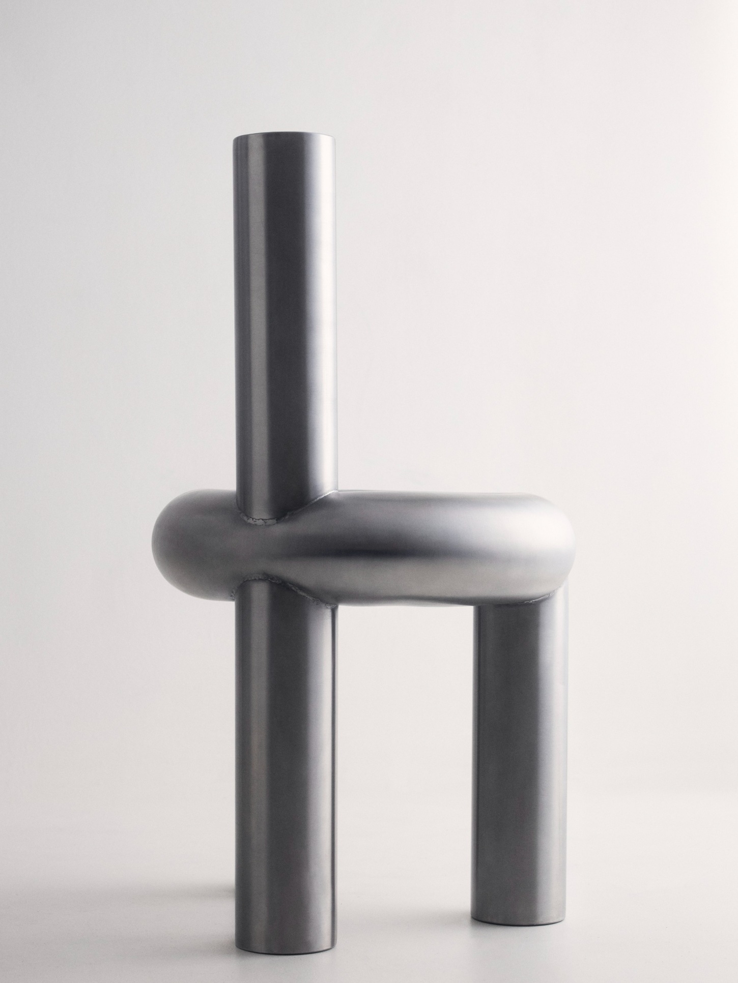 Au premier regard, ses trois pieds surdimensionnés, forgés en acier inoxydable massif, évoquent la silhouette familière et pourtant élancée d’une assise circulaire surélevée.
