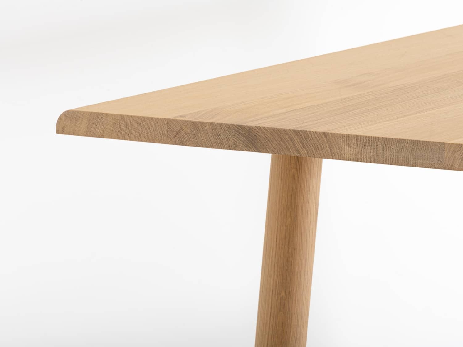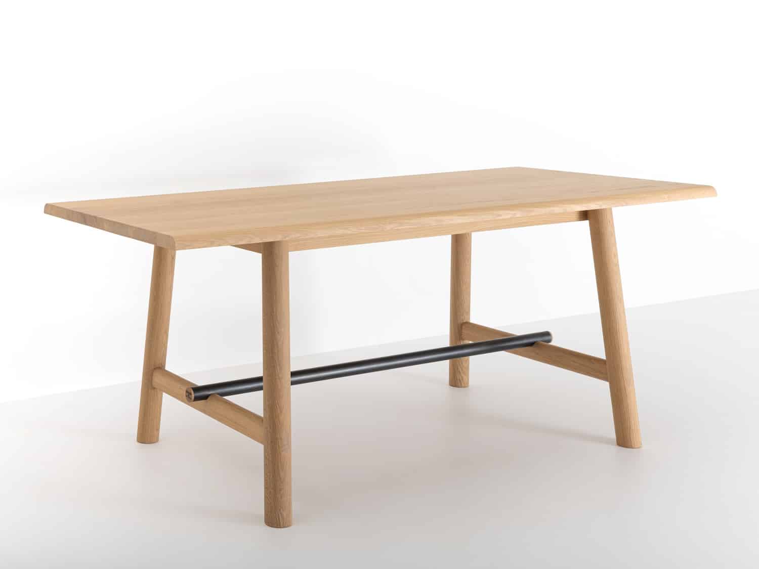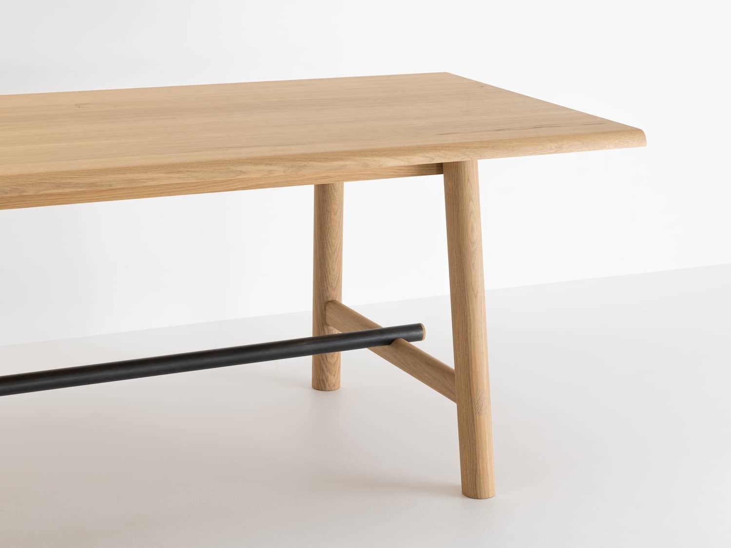 La collection Ostal se compose de tables et bancs en chêne massif, soutenus par une structure en métal patiné noir. Les assemblages d’ébénisterie traditionnels comme le tenon-mortaise renforcent la robustesse et l’élégance des pièces. Cette dualité entre bois et métal, entre main de l’artisan et esprit contemporain, donne à la collection une personnalité unique : chaleureuse, mais résolument ancrée dans notre époque.