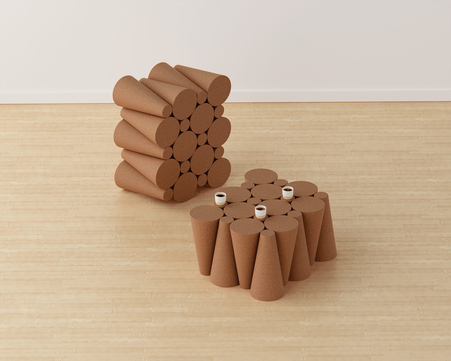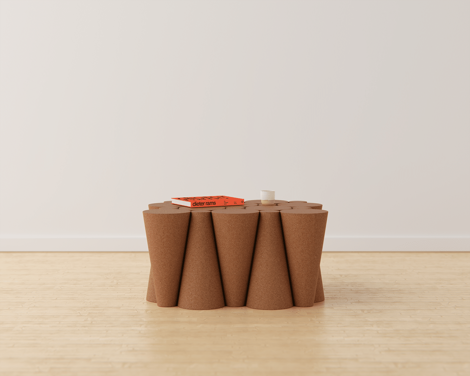 Le liège s’impose ici comme le matériau idéal. Résistant à la chaleur, léger, doux au toucher et naturellement antidérapant, il répond parfaitement aux contraintes d’un usage quotidien. En plus de ses qualités techniques, il offre une esthétique chaleureuse et organique qui s’accorde avec le langage formel de la table.