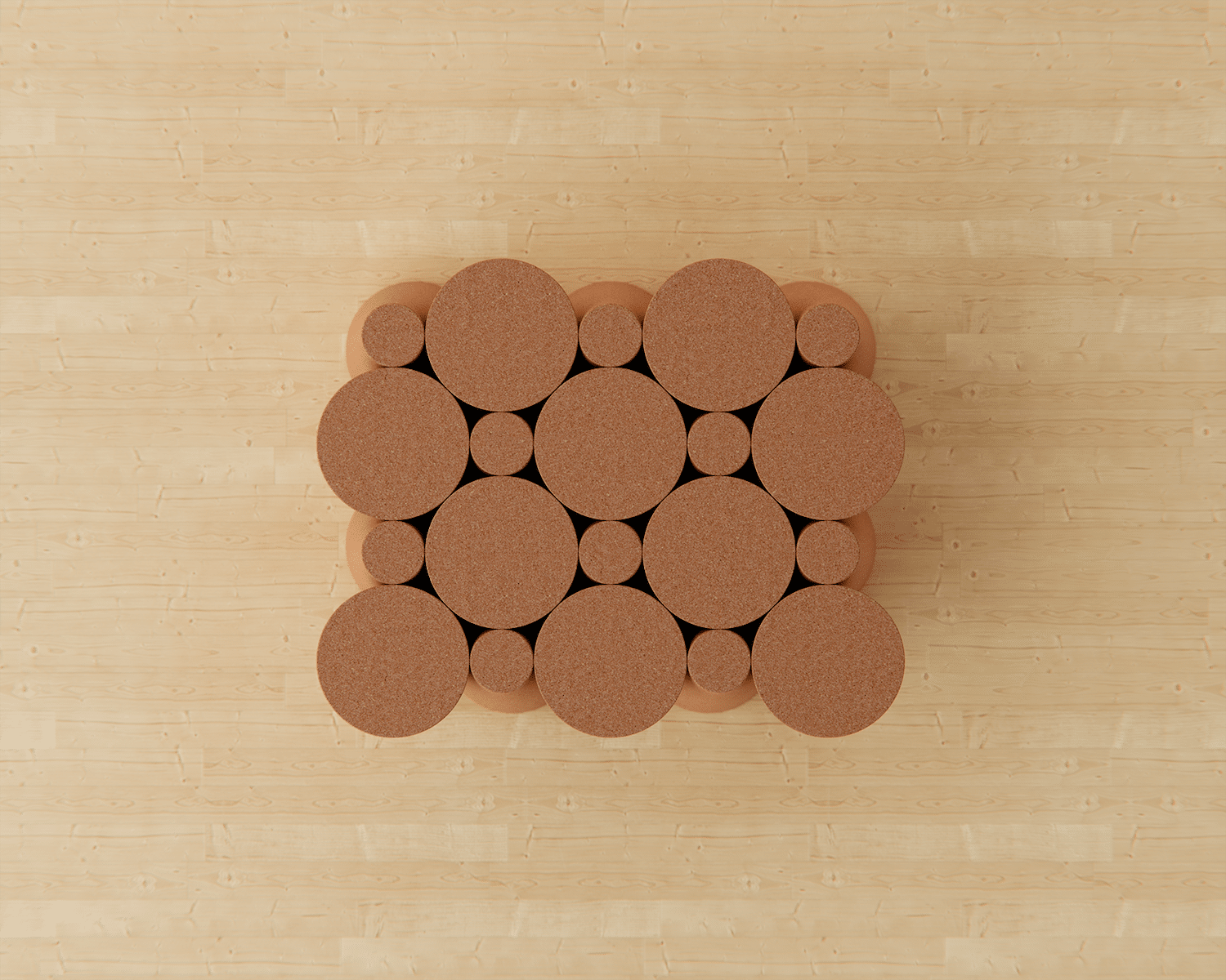 Vue du dessus, la surface de la Polka évoque un motif à pois, d’où son nom. Ce jeu graphique rappelle les codes du design scandinave, tout en affirmant une identité singulière. Le contraste entre la répétition géométrique des cônes et la texture naturelle du liège crée une tension visuelle subtile, à la fois rythmée et apaisante.