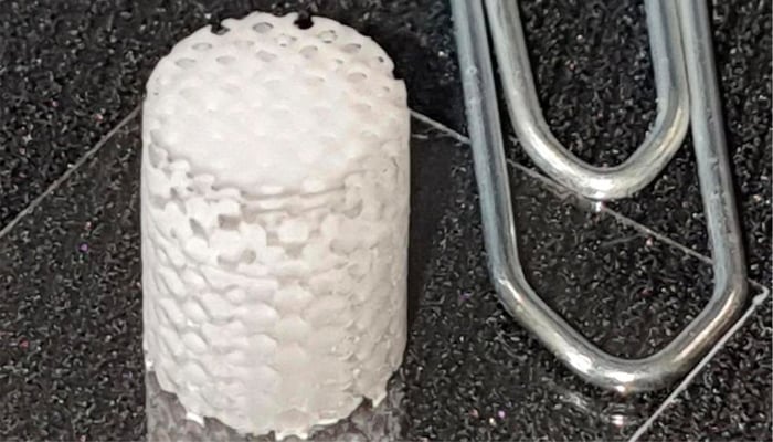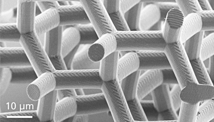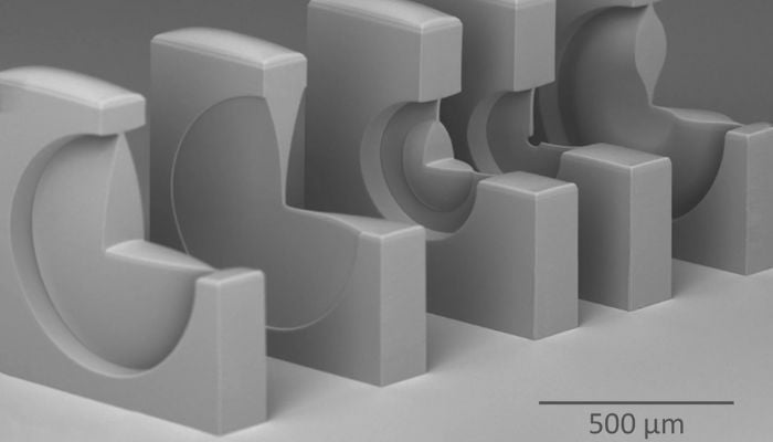 Une microstructure imprimée en 3D : la polymérisation à deux photons peut être utilisée pour produire des structures complexes à l’échelle micro et nanométrique (crédits photo : Fraunhofer ISC)