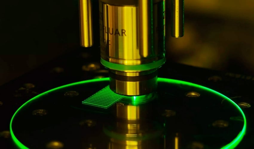 Dans la polymérisation à deux photons, le laser « écrit » une structure et un motif dans la résine liquide. (Crédits photo : Heidelberg Instruments)