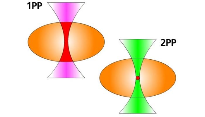 L’énergie du faisceau laser est concentrée de manière extrêmement intense au niveau du point focal, permettant ainsi le durcissement localisé et contrôlé du polymère photosensible, tandis que le matériau environnant reste à l’état liquide. Dans le cas de la polymérisation à deux photons, ce processus nécessite l’utilisation d’un laser à impulsions ultra-courtes, de l’ordre de quelques femtosecondes, afin d’atteindre une densité photonique suffisamment élevée pour permettre l’absorption simultanée de deux photons au point focal. En temps normal, les longueurs d’onde utilisées ne seraient pas absorbées par la résine. Toutefois, la combinaison d’une focalisation extrême et de la nature pulsée de l’irradiation induit l’absorption à deux photons exclusivement dans ce volume restreint.