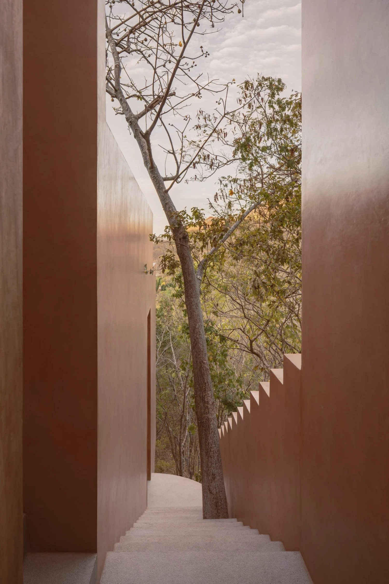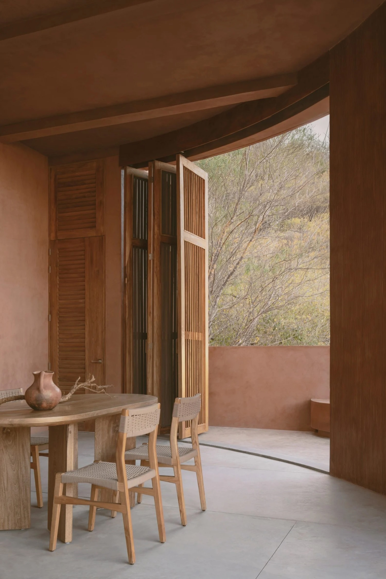 L’eau réapparaît dans des gestes évocateurs – clin d’œil aux chutes pétrifiées locales de Hierve el Agua – reliant la domesticité au mythe et à la topographie. Cette maison ne cadre pas les vues ; elle s’y soumet.